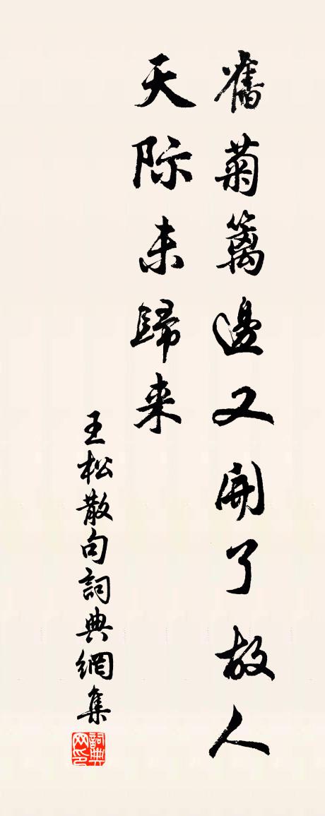 詩詞名句歷史字典書法欣賞書法字典國語詞典說文解字康熙字典古漢語字典標 題 作 者 詩 句 句作者:王松 朝代:宋代句原文舊菊籬邊又開了,故人天際未歸來。詩詞問答問:句的作者是誰?答:王松問:句寫於哪個朝代?答:宋代王松句書法欣賞句書法作品詩詞推薦過蘇州蘇舜欽〔宋代〕東出盤門刮眼明,蕭蕭疏雨更陰晴。綠楊白鷺俱自得,近水遠山皆有情。萬物盛衰天意在,一身羈苦俗人輕。無窮送江子我歸嚴陵張元乾〔宋代〕久客驚秋晚,懷歸更送君。亂來俱避地,老去惜雜群。山閣杯浮菊,江城雁度雲。行行經釣瀨,時事不須聞。梅花喜神譜爛熳二十八枝宋伯仁〔宋代〕八珍風味清,藜腸豈曾識。堪嗤嘗臠人,欲與魚兼得。友人陳槱得楊補之三昧賞之以詩白玉蟾〔宋代〕梅花不清是水清,最是一枝溪上橫。梅花不明是雪明,凍折老梢飄碎瓊。梅花不暗是雨暗,隔籬和雨粘珠糝。梅花別西齋諸友楊時〔宋代〕浮雲如積酥,涼飈勁弦疾。溶溶渺天末,飄忽易相失。懸弧四方誌,匏繫非予匹。平生結歡久,始願膠投漆。別離賦庭前落桂舒岳祥〔宋代〕去歲花開三日事,今秋陸續兩番開。渥丹如雨香猶好,乞與幽人護綠苔。次韻葉秀實縣治環翠亭陳棣〔宋代〕畏途蹤跡幾間關,浩氣空存天地間。沈湎恨無千日醉,浪遊贏得半生閒。觀書尚喜眼如月,搜句誰憐肩聳山。三徑喜雨詩張昭遠〔宋代〕試將丹懇□青霄,還話田疇萬里焦。不是湫龍解興雨,元來滴滴自心苗。秋雨陸游〔宋代〕暮秋木葉已微丹,小雨蕭蕭又作寒。目送斷雲歸谷口,身隨新雁寄江乾。濁醪易負尋常債,退士難叨本分官。謝盡自是妾之罪曾豐〔宋代〕妾生昭君村,國色少所逮。固羞著紅紫,亦懶傅粉黛。少時姆教嚴,稍稍攻組繪。針機參太玄,線道得三昧。坐貧旅行孟郊〔唐代〕楚水結冰薄,楚云為雨微。野梅參差發,旅榜逍遙歸。贈鷺陸游〔宋代〕雪衣飛去莫匆匆,小住灘前伴釣篷。禹廟蘭亭三十里,相逢多在暮煙中。雜興宋祁〔宋代〕不學詩書君勿嗤,人間情偽古難知。第看陵麥青青句,儘是當年發冢詞。遲歸唐寅〔明代〕大雪尋梅好寫詩,隔江友家泛金扈。因觀赤壁兩篇賦,不覺蘇州夜半時。城上將軍原有令,江南才子本無知。賢侯北邙山沈佺期〔唐代〕北邙山上列墳塋,萬古千秋對洛城。城中日夕歌鐘起,山上唯聞松柏聲。浪淘沙(桃花)趙師俠〔宋代〕桃萼正芳菲。初占春時。蒸霞燦錦望中迷。斜出繁枝臨曲沼,鸞鑑妝遲。蜂蝶鎮相依。天氣融怡。空教追憶武陵溪寄李簡夫宮使五首蘇泂〔宋代〕嘉言深味道之腴,啟鑰抽關許自如。顧我但將行腳誤,輸君全得病工夫。晚步門外散懷陸游〔宋代〕大千沙界一浮漚,成壞元知不自由。寓跡箇中誰耐久?問君底事不歸休?春陂欲雨黃鴉鬧,晚渡無人白犢浮。七十春日鄭剛中〔宋代〕朝來弄日花頭密,暗裡窺春柳眼多。任是老人情意薄,個般時節奈愁何。春思張玉孃〔宋代〕玉勒雕鞍燕北春,閒愁空自惜芳塵。楊花入戶還飛去,應笑虛幃翠被新。名句推薦土膏欲動雨頻催,萬草千花一餉開;范成大《春日田園雜興》 野橋梅幾樹,並是白紛紛。洪升《雪望》 春宵苦短日高起,從此君王不早朝。白居易《長恨歌》 晚鴉飛去,一枝花影送黃昏夏完淳《婆羅門引·春盡夜》 春江潮水連海平,海上明月共潮生。張若虛《春江花月夜》 知音如不賞,歸臥故山秋。賈島《題詩後》 遊子春衫已試單,桃花飛盡野梅酸。吳濤《絕句·遊子春衫已試單》 煙蘿翠竹,欠羅袖、為倚天寒日暮。吳文英《絳都春·余往來清華池館六年賦詠屢矣感昔傷今益不堪懷乃復作此解》 紫黯紅愁無緒,日暮春歸甚處?龔自珍《如夢令·紫黯紅愁無緒》 嶺水爭分路轉迷,桄榔椰葉暗蠻溪。李德裕《謫嶺南道中作》