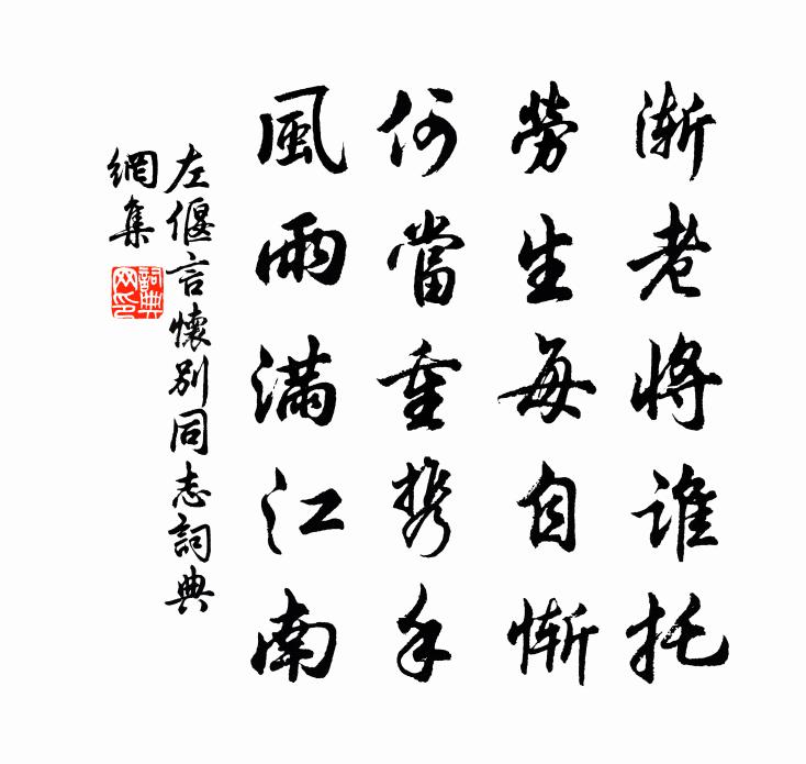 詩詞名句歷史字典書法欣賞書法字典國語詞典說文解字康熙字典古漢語字典標 題 作 者 詩 句 言懷別同志作者:左偃 朝代:唐代言懷別同志原文漸老將誰托,勞生每自慚。何當重攜手,風雨滿江南。詩詞問答問:言懷別同志的作者是誰?答:左偃問:言懷別同志寫於哪個朝代?答:唐代問:言懷別同志是什麼體裁?答:五絕左偃言懷別同志書法欣賞言懷別同志書法作品注釋全唐詩:卷740-26詩詞推薦滿路花岩 依託鍾離,見嗚鶴餘音卷五佚名〔宋代〕四大元無我,五蘊本來空。休爭人與我,逞英雄。貴賤賢愚,到了夢魂中。百年親眷屬,電里紅光,早宜各自牢籠涼月二首洪咨夔〔宋代〕蓮房折盡只留荷,露蓋班班一丈過。高下橫斜無定影,聚涼著得月明多。甲辰歲朝把筆趙孟堅〔宋代〕四十五番見除夕,稍知慚愧此之日。小時辛苦習科場,惟恐一官得未得。二十七歲方塵忝,又閱八年初實歷。又閱秋暮吟望趙執信〔清代〕小閣高棲老一枝,閒吟了不為秋悲。寒山常帶斜陽色,新月偏明落葉時。煙水極天鴻有影,霜風捲地菊無姿。二更水調歌頭(和鄭舜舉蔗庵韻)辛棄疾〔宋代〕萬事到白髮,日月幾西東。羊腸九折歧路,老我慣經從。竹樹前溪風月,雞酒東家父老,一笑偶相逢。此樂竟誰覺過葛墟讀蔣冽大宗碑蔣堂〔宋代〕天寶年中立此碑,軒裳鱗次美當時。自從寂絕牛頭夢,力振家聲合在茲。次韻韓子師雪中二首韓元吉〔宋代〕曲樽高檻倚崔嵬,要是仙京白玉台。雲色自連鳷鵲動,天顏亦為近臣開。光翻午夜渾疑月,花滿新春未數梅。自笑泉口淨明院晝寢樓鑰〔宋代〕沙頭古招提,往來幾經行。茲來當春晝,解衣愒西楹。玉立青琅玕,小窗虛且明。紙帳白如雪,床軟枕更平。偃仰奉和襲美夏景沖澹偶作次韻二首陸龜蒙〔唐代〕蟬雀參差在扇紗,竹襟輕利籜冠斜。壚中有酒文園會,琴上無弦靖節家。芝畹煙霞全覆穗,橘洲風浪半浮花。閒思詠螢李嘉祐〔唐代〕映水光難定,凌虛體自輕。夜風吹不滅,秋露洗還明。向燭仍分焰,投書更有情。猶將流亂影,來此傍檐楹。和頓主簿起見贈二首蘇轍〔宋代〕一鎖樓中暗度秋,微官黽勉未能休。笑談容我聊紓放,文字憑君便去留。杯酒淋漓已非敵,清詩窈渺更難酬。東歸偈頌九十三首釋梵琮〔宋代〕學道先須有指歸,聞聲見色不思議。九旬黑白分明處,如似盤中一片棋。縱橫十字,一著當機。有眼則活,無眼則題禊帖圖方回〔宋代〕永和九年晉癸丑,禊帖至今家家有。遺墨一紙出昭陵,摹本宇宙同不朽。甲子循環十六周,甫近千歲未為久。之字岳祠高明〔元代〕莫向中原嘆黍離,英雄生死系安危。內庭忽下班師詔,絕漠全收大將旗。父子一門甘仗節,山河千里竟分支。孤臣枕上聞布穀聲陸游〔宋代〕老去惟思日月遲,更堪青鬢總成絲。無端催取流年去,最恨溪頭布穀兒。十二時歌釋印肅〔宋代〕禺中巳,報君學道無門戶。佛語諸經標此心,此心現時寂滅度。本無迷,曷有悟,真我非身誰作做。貪嗔痴愛屬眾和劉太守十州詩竹嶼陳瓘〔宋代〕霜姿迥出紅塵外,只有鵷雛傍水來。別岸若尋棲隱處,軒窗須為此君開。東城桂三首白居易〔唐代〕蘇之東城,古吳都城也。今為樵牧之場。有桂一株,生乎城下,惜其不得地,因賦三絕句以唁之。子墮本從天竺寺神光燦王吉昌〔元代〕神功造化,斡轉天輪,閒中默契真修。照耀三光,推移五氣添抽。北斗南辰圍繞,卷銀河、萬扔波流。玉關啟,運早秋山中作王維〔唐代〕無才不敢累明時,思向東谿守故籬。豈厭尚平婚嫁早,卻嫌陶令去官遲。草間蛩響臨秋急,山里蟬聲薄暮悲。寂寞名句推薦三姑六婆,實淫盜之媒;婢美妾嬌,非閨房之福。朱柏廬《朱子家訓·全文》 丈夫志四海,萬里猶比鄰。曹植《贈白馬王彪·並序》 棲鴉流水點秋光,愛此蕭疏樹幾行。紀映淮《詠秋柳》 白頭空負雪邊春,著意問春春不語。劉鎮《玉樓春·東山探梅》 人情已厭南中苦,鴻雁那從北地來。王勃《蜀中九日 / 九日登高》 最是繁絲搖落後,轉教人憶春山。納蘭性德《臨江仙·寒柳》 悵望千秋一灑淚,蕭條異代不同時。杜甫《詠懷古蹟五首·其二》 涼風起天末,君子意如何。杜甫《天末懷李白》 泉眼無聲惜細流,樹陰照水愛晴柔楊萬里《小池》 料黛眉重鎖隋堤,芳心還動梁苑。盧祖皋《宴清都·初春》