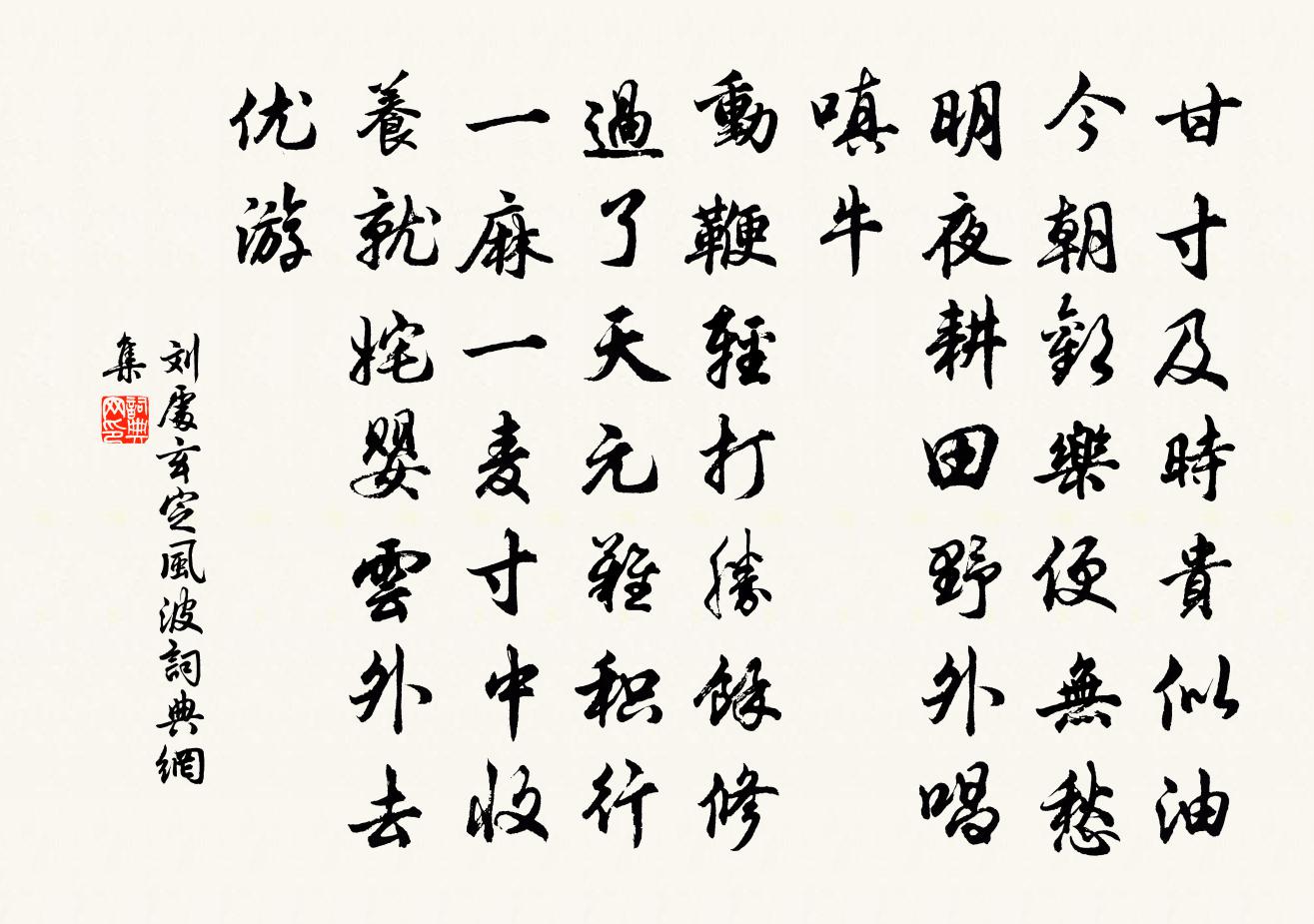詩詞名句歷史字典書法欣賞書法字典國語詞典說文解字康熙字典古漢語字典標 題 作 者 詩 句 定風波作者:劉處玄 朝代:元代定風波原文甘寸及時貴似油。今朝歡樂便無愁。明夜耕田野外唱,嗔牛。動鞭輕打勝余修。過了天元難積行,一麻一麥寸中收。養就奼嬰雲外去,優遊。詩詞問答問:定風波的作者是誰?答:劉處玄問:定風波寫於哪個朝代?答:元代問:定風波是什麼體裁?答:詞劉處玄定風波書法欣賞定風波書法作品詩詞推薦土屋楊時〔宋代〕土屋枕荒陂,周回僅容席。環堵異營窟,猶遺古風質。功雖勞版築,身自有餘力。依戶鑿圓竇,寒光度如璧。戶開示兒陸游〔宋代〕斥逐襆被歸,招喚振衣起;此是鄙夫事,學者那得爾。前年還東時,指心誓江水。亦知食不足,但有餓而死。小兒田舍即事十首劉克莊〔宋代〕鄰壁嘲啾誦學而,老人睡少聽移時。它年謹勿如張禹,帝問床前謬不知。次同叔見寄二首胡仲弓〔宋代〕怪得檐前溜,原來是雪消。山枯空有骨,水涸不成潮。寒雁鳴沙磧,飢鴉啄柳條。物情總如此,吟鬢任蕭蕭。讀杜子美詩韓維〔宋代〕寒燈熠熠宵漏長,顛倒圖史形勞傷。取觀杜詩盡累紙,坐覺神氣來洋洋。高言大義經比重,往往變化安能常。壯哉踏莎行慢歐陽修〔宋代〕獨自上孤舟,倚危檣目斷。難成暮雨,更朝雲散。涼勁殘葉亂。新月照、澄波淺。今夜裡,厭厭離緒難銷遣。強來夜宴安樂公主宅武平一〔唐代〕王孫帝女下仙台,金榜珠簾入夜開。遽惜瓊筵歡正洽,唯愁銀箭曉相催。報旱方岳〔宋代〕將軍此腹忍飢慣,時事乃爾當何如。百骸受病憊甚矣,微此一脈民其魚。總領戶部楊公輓詩曹彥約〔宋代〕華顯世儒業,循良今吏師。未應州縣薄,能簡廟堂知。沃轡歌周雅,含香問漢儀。經綸殊未展,曛景迫崦嵫。平甫見招不欲往姜夔〔宋代〕老去無心聽管弦,病來杯酒不相便。人生難得秋前雨,乞我虛堂自在眠。周公謹硯黃宗羲〔清代〕弁陽片石出塘棲,餘墨猶然積水湄。一半已書亡宋事,更留一半寫今時。涼夜有懷白居易〔唐代〕念別感時節,早蛩聞一聲。風簾夜涼入,露簟秋意生。燈盡夢初罷,月斜天未明。暗凝無限思,起傍藥闌行。越州歌二十首汪元量〔宋代〕蒼生慟哭入雲霄,內苑瓊林已作樵。打斷六更天未曉,禁庭兩桁籸盤燒。讒人黃榦〔宋代〕監謗兆周蹙,偶語擠秦亡。古風下刺上,國步安且強。靖康發深痛,熙豐啟餘殃。惜哉天子明,未免讒者傷。讒者冬夜陸游〔宋代〕窮巷蕭條早閉門,北窗燈火夜昏昏。老於俗事不掛眼,愁憶故人空斷魂。急雪打窗飛礫細,狂風卷野怒濤翻。土床詠甘蕉詩沈約〔南北朝〕抽葉固盈丈。折本信兼圍。流甘揜椰實。弱縷冠絺衣。偈頌九十三首釋梵琮〔宋代〕雲居九月半,月向掌中圓。覓之亡影象,用之亡正偏。晨起看山飲酒陸游〔宋代〕愛山入骨髓,嗜酒在膏肓。跌宕風煙外,歌呼麴櫱傍。虛窗天柱曉,小瓮橐泉香。垂老叨微祿,無忙。黃鶴樓賀鑄〔宋代〕登真者誰子,昔有費公禕。白日玉書下,青天駕鶴飛。此地少留憩,神標悵依依。振裾謝塵濁,與爾方遠違。層樓少陵子劉克莊〔宋代〕驥子熊兒俱早慧,可憐失教遂紛紛。驢邊雞柵猶雲可,文選安能勝魯論。名句推薦富而可求也,雖執鞭之士,吾亦為之。如不可求,從吾所好。孔子弟子《論語·述而篇》 東風隨春歸,發我枝上花。李白《落日憶山中》 寒沙四面平,飛雪千里驚。范雲《效古詩》 守節自誓,親誨之學。歐陽修《畫地學書》 殘月臉邊明,別淚臨清曉牛希濟《生查子·春山煙欲收》 綠樹暗長亭,幾把離尊,陽關常恨不堪聞。陸游《浪淘沙·丹陽浮玉亭席上作》 細數十年事,十處過中秋。范成大《水調歌頭·細數十年事》 器乏雕梁器,材非構廈材。趙彥昭《奉和元日賜群臣柏葉應制》 暗暗淡淡紫,融融冶冶黃。李商隱《菊花》 長呼人,即代叫。人不在,己即到。李毓秀《弟子規·出則弟》