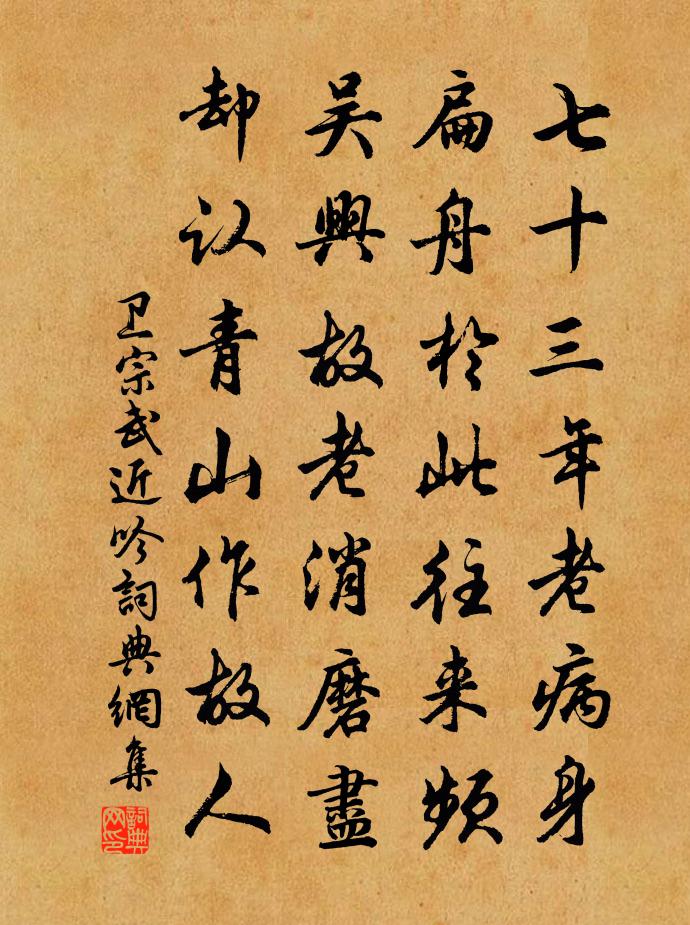 詩詞名句歷史字典書法欣賞書法字典國語詞典說文解字康熙字典古漢語字典標 題 作 者 詩 句 近吟作者:衛宗武 朝代:宋代近吟原文七十三年老病身,扁舟於此往來頻。吳興故老消磨盡,卻認青山作故人。詩詞問答問:近吟的作者是誰?答:衛宗武問:近吟寫於哪個朝代?答:宋代衛宗武近吟書法欣賞近吟書法作品詩詞推薦偈頌二十五首釋普岩〔宋代〕毒攻毒,楔出楔。老曹山,不識別。那裡是者僧吃酒處。追和游謝氏山亭贈賢上人王之道〔宋代〕春旱久不雨,既雨風日清。桑麻被膏潤,往往爭欣榮。花鳥發詩思,湖山歡野情。駕言南畝游,遂有西塔行。雲光乾明節祝聖壽四錫〔宋代〕河朔雖雲近帝鄉,時逢慶誕祝君王。身心常在三清路,曉夕先裝一炷香。聖壽如山隨地久,恩光似日與天長。微臣句高元矩〔唐代〕硯貯寒泉碧,庭堆敗葉紅。燕掠琴弦穿靜院,吏收詩草下閒庭。過放生池追懷江公民表諫議池蓋公所創也陸游〔宋代〕釣台先生諫大夫,建中初元起江湖,是是非非玉座側,身可死徙志不渝。煙汀月島二十載,白髮短*藏菰蒲。晚蒙宋喬年真贊黃庭堅〔宋代〕士之坎壈,以其智多。因坎壈以為師,用其多以見己。相遭於功名之會,圖像麒麟。獨行於寂寞之濱,照影溪壑。擬古其二李白〔唐代〕高樓入青天,下有白玉堂。明月看欲墮,當窗懸清光。遙夜一美人,羅衣沾秋霜。含情弄柔瑟,彈作陌上桑。弦聲淳熙四年二月既望靜江守臣張某奉詔勸農於郊張栻〔宋代〕俾一其心,服我訓言。擊鼓坎坎,自古有年。涵虛亭文同〔宋代〕雲外眾峰檐際橫,竹間飛泉窗下鳴。欲往二樂即歇此,胸懷已自如冰清。樂府曹植〔魏晉〕巢許蔑四海。商賈爭一錢。送照禪人之湖南釋正覺〔宋代〕衡岳迎秋翡翠瘦,瀟湘漾風瑠璃皴。夜船載月急如箭,歸去來兮休問津。次韻全君玉元日二首方回〔宋代〕五更皆早起,惟我是閒人。展鏡須仍雪,添杯臉暫春。有終還復始,無舊不成新。萬古燒痕意,陳根豈盡陳。寄革露傳祖宣老二首吳則禮〔宋代〕鐵塔亭亭石逕斜,參差樓殿倚青霞。秋江曾試中{左氵右霝}水,春焙仍分北苑芽。隱几飛帆過別浦,翻經孤雁起寄鍾常侍羅隱〔唐代〕一從朱履步金台,櫱苦冰寒奉上台。峻節不由人學得,遠途終是自將來。風高漸展摩天翼,乾聳方呈構廈材。應笑和林喬年學士普淨院避暑王珪〔唐代〕汩汩紅塵倦往還,偶來偷得似僧間。一心自別清涼處,萬事如經夢寐間。盡日禪房揮玉塵,幾時仙嶺對冰顏。知君官舍書懷呈羅思純王禹偁〔宋代〕同年事分幾船同,墨綬逶迤一郡中。仙桂並枝攀月魄,縣花交影笑春風。分莎種就尋僧逕,借竹編成養鶴籠。公暇竹宋祁〔宋代〕新筍漸盈尺,新梢已鋪瓦。燕雀忽相驚,深沈似隆夏。讀魏鶴山先生渠陽集五首方回〔宋代〕瀛登湘渡偶皆同,一了乾坤此兩翁。前後身吾雖未信,俱遭權孽肆奸凶。冬日園中作陸游〔宋代〕園荒闕掃除,籬敗且枝梧。久旱池萍死,新霜野蔓枯。寒爐殊未議,濁酒卻時酤。飛動郊原興,飢鷹待指呼。菩薩蠻(十一之六)賀鑄〔宋代〕粉香映葉花羞日。窗間宛轉蜂尋蜜。歡罷捲簾時。玉纖勻面脂。舞裙金斗熨。絳襭鴛鴦密。翠帶一雙垂。索人題艷名句推薦黃衫飛白馬,日日青樓下。陳克《菩薩蠻·赤闌橋盡香街直》 行人悵望蘇台柳,曾與吳王掃落花。姜夔《姑蘇懷古》 記年時、舊宿淒涼,暮煙秋雨野橋寒。吳文英《霜花腴·重陽前一日泛石湖》 故人早晚上高台。贈我江南春色、一枝梅。舒亶《虞美人·寄公度》 愚者暗於成事,知者見於未萌。民不可與慮始,而可與樂成。商鞅《商君書·更法》 聞之而不見,雖博必謬;見之而不知,雖識必妄;知之而不行,雖敦必困。荀子《荀子·儒效》 空門寂寞汝思家,禮別雲房下九華。金地藏《送童子下山》 微陽下喬木,遠色隱秋山。馬戴《落日悵望》 毋意,毋必,毋固,毋我。孔子弟子《論語·子罕篇》 誰道人生無再少?門前流水尚能西!休將白髮唱黃雞。蘇軾《浣溪沙·游蘄水清泉寺》