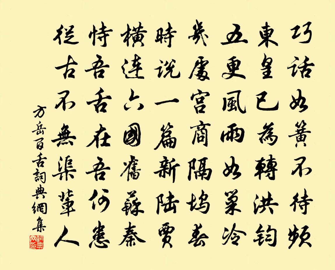 詩詞名句歷史字典書法欣賞書法字典國語詞典說文解字康熙字典古漢語字典標 題 作 者 詩 句 百舌作者:方岳 朝代:宋代百舌原文巧話如簧不待頻,東皇已為轉洪鈞。五更風雨如巢冷,幾處宮商隔塢春。時說一篇新陸賈,橫連六國舊蘇秦。恃吾舌在吾何患,從古不無渠輩人。詩詞問答問:百舌的作者是誰?答:方岳問:百舌寫於哪個朝代?答:宋代方岳百舌書法欣賞百舌書法作品詩詞推薦雨泊話舊沈德潛〔清代〕寒雨蕭蕭夜打蓬,蓬窗相對一燈紅。十年無限存亡感,併入空江話雨中。蝶戀花歐陽修〔宋代〕欲過清明煙雨細。小檻臨窗,點點殘花墜。梁燕語多驚曉睡。銀屏一半堆香被。新歲風光如舊歲。所恨征輪,漸漸緣識宋太宗〔宋代〕無事勝多事,非緣不是緣。深窮淺近意,尋往便知前。和劉右司見寄六絕一律吳潛〔宋代〕老子誰知密度關,卻支筇杖訪荒園。故應我輩鍾情別,佳話真堪詔子孫。自詠十韻徐夤〔唐代〕只合滄洲釣與耕,忽依螢燭愧功成。未遊宦路叨卑宦,才到名場得大名。梁苑二年陪眾客,溫陵十載佐雙旌。錢財覽古五首方回〔宋代〕賢者儻畏死,世論終不公。古若不置死,何藉誅妖凶。荊舒底奸鬼。廟食丘軻同。舉世知其非,囁嚅不敢攻。著書德壽春帖子八首曹勛〔宋代〕露香欄檻已青青,梅萼驚春照坐明。天極元妃資內助,常年春首祝椿齡。朝中措(和張文伯海棠)王之道〔宋代〕暖風遲日透香肌。春到柳邊枝。曾見酒紅潮頰,玉人初出羅幃。東坡何處,朱唇翠袖,空想芳姿。爭似濡須太守,湖口阻風方回〔宋代〕濤江白雪噴蒼旻,晚日紅金緣翠雲。天著此奇刮詩眼,略須掇實張吾軍。賦得荷詩庾信〔南北朝〕秋衣行欲制。風蓋漸應欹。若有千年蔡。須巢但見隨。霜夜陸游〔宋代〕黃甘磊落圍三寸,赤蟹輪囷可一斤。更喚東陽麴道士,與君霜夜策奇勳。坐黃岡廣福禪房郭昂〔宋代〕愛此禪棲靜,清涼境自偏。詫 * 怪樹,留客笑幽蓮。草暖蛙喧夏,林昏鳥夢煙。風塵吾未免,兀坐愧安禪。和主司王起(一作和主司王僕射酬周侍郎賀放榜)高退之〔唐代〕昔年桃李已滋榮,今日蘭蓀又發生。葑菲采時皆有道,權衡分處且無情。叨陪鴛鷺朝天客,共作門闌出谷鶯。何事華山鄭谷〔唐代〕峭仞聳巍巍,晴嵐染近畿。孤高不可狀,圖寫盡應非。絕頂神仙會,半空鸞鶴歸。雲台分遠靄,樹谷隱斜暉。墜石次韻沈信臣游龍焙韓元吉〔宋代〕武夷仙人厭塵埃,金鞭白馬飛崔嵬。丹砂已就不可識,尚有瑤草分靈栽。千花剪巧綴密露,秀色不待春風催。東溪晚過鄰幾官舍三首韓維〔宋代〕車馬東橋絕,涼風滿夕軒。水聲通沁苑,樹色入夷門。每接淵明詠,常懷仲理言。滄洲如可約,杯酒會重論。漢廣亭曾鞏〔宋代〕悠悠漢水長,剡剡楚山密。若與心目期,爭從窗戶出。太守樸鄙人,迂無適時術。治民務不煩,得以偷暇日。北城三日詩鮑照〔南北朝〕氣暄動思心。柳青起春懷。時艷憐花葯。服淨悅登台。提觴野中飲。愛心煙未開。露色染春草。泉源潔冰苔。泥泥奉和襲美醉中偶作見寄次韻陸龜蒙〔唐代〕海鶴飄飄韻莫儕,在公猶與俗情乖。初呈酒務求專判,合禱山祠請自差。永夜譚玄侵罔象,一生交態忘形骸。憐君仙鄉子侯善淵〔元代〕大道本無為。內外恬然處妙機。寂靜清虛真有味,揚眉。冷淡靈光處處輝。綽約好容儀。坐臥行居左右隨。翼御中名句推薦萬國奔騰,兩宮幽陷,此恨何時雪。黃中輔《念奴嬌·炎精中否》 山有扶蘇,隰有荷華。佚名《山有扶蘇》 扶桑已在渺茫中,家在扶桑東更東。韋莊《送日本國僧敬龍歸》 梯橫畫閣黃昏後,又還是、斜月簾櫳張先《一叢花令·傷高懷遠幾時窮》 雨里雞鳴一兩家,竹溪村路板橋斜。王建《雨過山村》 閒中件件思,暗裡般般量。康海《雁兒落帶得勝令·飲中閒詠》 張翰江東去,正值秋風時。李白《送張舍人之江東》 兩人對酌山花開,一杯一杯復一杯。李白《山中與幽人對酌》 欲知平直,則必準繩;欲知方圓,則必規矩呂不韋《呂氏春秋·論·不苟論》 君子博學而日參省乎己,則知明而行無過矣。荀子《荀子·勸學》