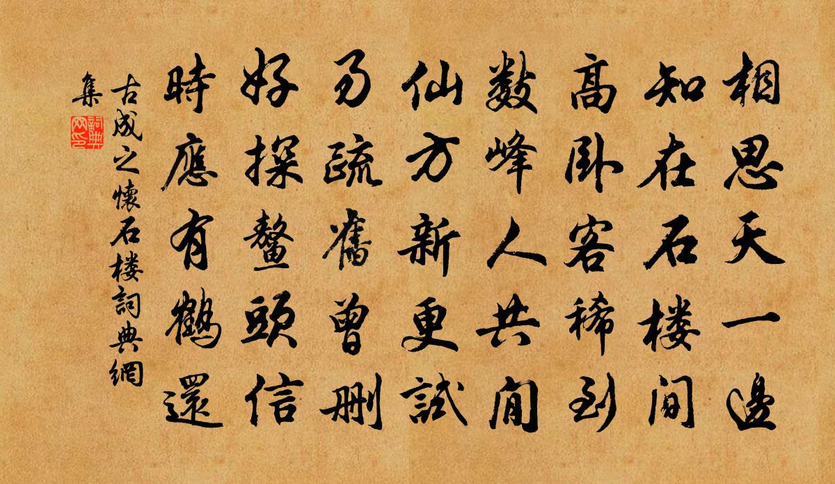 詩詞名句歷史字典書法欣賞書法字典國語詞典說文解字康熙字典古漢語字典標 題 作 者 詩 句 懷石樓作者:古成之 朝代:宋代懷石樓原文相思天一邊,知在石樓間。高臥客稀到,數峰人共閒。仙方新更試,易疏舊曾刪。好探鰲頭信,時應有鶴還。詩詞問答問:懷石樓的作者是誰?答:古成之問:懷石樓寫於哪個朝代?答:宋代古成之懷石樓書法欣賞懷石樓書法作品詩詞推薦今日歌文嘉〔明代〕今日復今日,今日何其少。今日又不為,此事何時了。人生百年幾今日,今日不為真可惜。若言姑待明朝至,明朝雲邊阻雨劉宰〔宋代〕薔薇籬落送春闌,筍葚園林早夏間。牛背牧兒酣午夢,不知風雨過前山。和曼叔靈樹相別韓維〔宋代〕男兒易為別,尋尺固可輕。今日摻子祛,悽惶不自平。豈其道里遠,要是隔音形。春風卷行跡,車馬無留征。回首初夏即事十二解楊萬里〔宋代〕狹斜只解賞春紅,秋菊冬梅不負公。我道四時俱富貴,一杯催喚藕花風。山海張耒〔宋代〕愚公移山寧不智,精衛填海未必痴。深谷為陵岸為谷,海水亦有揚塵時。杞人憂天固可笑,而不憂者安從知。聖言題張司馬別墅李頻〔唐代〕庭前樹盡手中栽,先後花分幾番開。巢鳥戀雛驚不起,野人思酒去還來。自拋官與青山近,誰訝身為白髮催。門外回嶺楊公遠〔宋代〕梯級因層層步艱,嶺頭清吹逼人寒。四邊絕壁詩懷壯,一片蒼空眼界寬。何處山坳吞落照,長年石罅噴鳴湍。支筇送隱靜恭老虞儔〔宋代〕妙喜老人骨應槁,明月堂空跡如掃。叢林耆舊半消磨,砥柱頹波餘此老。五峰深處開道場,道價重於連城寶。我蓋漫興朱之瑜〔清代〕遠逐徐生跡,移舟住別峰。遺書搜孔壁,仙路隔秦封。流水去無盡,故人何日逢?鄉書經歲達,離恨轉重重。李丞相輓詩三首劉子翬〔宋代〕委質艱難際,精忠日月昭。引裾堯浸縮,斷鞅虜氛消。顧眄安諸夏,風聲動一朝。南遷誰辨謗,公論付芻堯。憶九江呈李端叔孔武仲〔宋代〕家園大江東,清湓映匡廬。波光搖空闊,嵐悴隨卷舒。廊然形影消,所見惟清虛。此是列仙宅,當年來不居。一官夏日寄東溪隱者耿湋〔唐代〕日華浮野水,草色合遙空。處處山依舊,年年事不同。閒田孤壘外,暑雨片雲中。惆悵多塵累,無由訪釣翁。和彭城王生悼歌人盼盼賀鑄〔宋代〕東園花下記相逢,倩盼偷回一笑濃。書簏尚緘香豆蔻,鏡奩初失玉芙蓉。歌闌燕子樓前月,魂斷鳳皇原上鍾。寄語晚渡伊水韋述〔唐代〕悠悠涉伊水,伊水清見石。是時春向深,兩岸草如積。迢遞望洲嶼,逶迤亘津陌。新樹落疏紅,遙原上深碧。回瞻唐多令劉辰翁〔宋代〕殘日下瓜洲。平安火又流。月高高、掛古城樓。回首少年真可笑,無一事、又悲秋。天在海邊頭。天風有意不。結聚景園陳允平〔宋代〕上苑韶光隔鳳城,十分春事屬流鶯。雨余芳草欲無地,風定落花如有聲。柳榭雲深棲鸛鵲,櫸塘沙暖浴鵁鶄。年來月陂閒步邵雍〔宋代〕因隨芳草行來遠,為愛清波歸去遲。獨步獨吟仍獨坐,初涼天氣未寒時。奉和岳州山城(一作張均詩)張垍〔唐代〕郡館臨清賞,開扃坐白雲。訟虛棠戶曙,觀靜竹檐曛。懸榻迎賓下,趨庭學禮聞。風傳琴上意,遙向日華紛。第九題金山金鰲閣王奕〔宋代〕誰橐紅爐鑄寶刀,辟開太極奠金鰲。尾搖光岳星辰轉,背負乾坤日月勞。潮落潮生通氣息,帆來帆去動毫毛。不知陪王司馬登薛公逍遙台張九齡〔唐代〕嘗聞薛公淚,非直雍門琴。竄逐留遺蹟,悲涼見此心。府中因暇豫,江上幸招尋。人事已成古,風流獨至今。閒情名句推薦象龍喚不應,竹龍起行雨張孝祥《湖湘以竹車激水粳稻如雲書此能仁院壁》 語來江色暮,獨自下寒煙。李白《尋雍尊師隱居》 志忍私,然後能公;行忍情性,然後能修荀子《荀子·儒效》 聽於無聲,視於無形。戴聖《禮記·曲禮上》 雙星何事今宵會,遺我庭前月一鉤。德容《七夕二首·其一》 移舟泊煙渚,日暮客愁新。孟浩然《宿建德江》 兒童急走追黃蝶,飛入菜花無處尋。楊萬里《宿新市徐公店》 如今卻憶江南樂,當時年少春衫薄。韋莊《菩薩蠻·如今卻憶江南樂》 春色滿園關不住,一枝紅杏出牆來。葉紹翁《遊園不值》 九日黃花才過了,一尊聊慰秋容老。趙可《鳳棲梧·霜樹重重青嶂小》