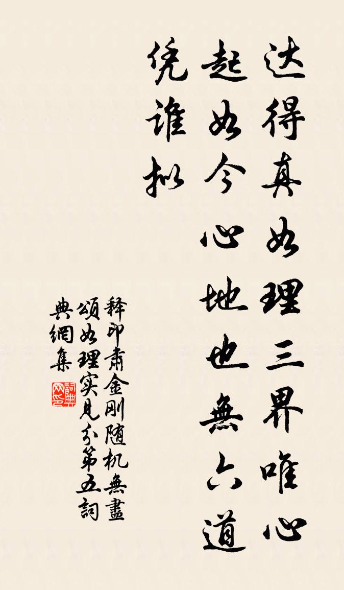 詩詞名句歷史字典書法欣賞書法字典國語詞典說文解字康熙字典古漢語字典標 題 作 者 詩 句 金剛隨機無盡頌如理實見分第五作者:釋印肅 朝代:宋代原文達得真如理,三界唯心起。如今心地也無,六道憑誰擬。詩詞問答問:《金剛隨機無盡頌如理實見分第五》的作者是誰?答:釋印肅問:該詩寫於哪個朝代?答:宋代書法欣賞金剛隨機無盡頌如理實見分第五書法作品詩詞推薦白露鮑溶〔唐代〕清蟬暫休響,豐露還移色。金飆爽晨華,玉壺增夜刻。已低疏螢焰,稍減哀蟬力。迎社促燕心,助風勞雁翼。一悲賦得竹箭有筠張仲方〔唐代〕東南生綠竹,獨美有筠箭。枝葉詎曾凋,風霜孰雲變。偏宜林表秀,多向歲寒見。碧色乍蔥蘢,清光常蒨練。皮開訴衷情張掄〔宋代〕閒中一戔瓮頭春。養氣又頤神。莫教大段沈醉,只好帶微醺。心自適,體還淳。樂吾真。此懷何似,兀兀陶陶,太張康節家西軒竹張福夷兄弟求詩李廌〔宋代〕種花鄙弱植,種柳惡連陰。主人種竹意,闓爽見靈襟。猗猗復勁節,凜凜況虛心。晚歲示貞操,清風應好音。扶疏彌陀懸鼓相贊釋如珙〔宋代〕彩雲縹緲懸紅日,瞻彼慈容大導師。四十八願丘山重,眾生雜念亂如絲。和丹岩衛宗武〔宋代〕玉女裁花撒碎瓊,寒威凜凜壓山屏,消殘猶自衒天巧,點綴裙腰一半青。句呂午〔宋代〕杏城西城翁幽居。和陶止酒蘇軾〔宋代〕時來與物逝,路窮非我止。與子各意行,同落百蠻里。蕭然兩別加,各攜一樨子。子室有孟光,我室惟法喜。相逢春題二首崔道融〔唐代〕青春未得意,見花卻如讎。路逢白面郎,醉插花滿頭。滿眼桃李花,愁人如不見。別有惜花人,東風莫吹散。至啟伏蒙台慈以南至之後見寄佳篇豈曰奉酬輒李至〔宋代〕流年冉冉不曾停,合向勞生養道情。萬物已憐成復象,一陽還見動勾萌。南躔日轉階前影,北陸風吹枝杪聲。看即賜節姜特立〔宋代〕潛藩伴讀六年余,賜鉞君王念老儒。祿厚養成閒意思,日長添得睡工夫。題小雁屏二首陳氏〔宋代〕曲屏誰畫小瀟湘,雁落秋風蓼半黃。雲澹雨疏孤嶼遠,會令清夢到高唐。題唐興寺小松杜荀鶴〔唐代〕雖小天然別,難將眾木同。侵僧半窗月,向客滿襟風。枝拂行苔鶴,聲分叫砌蟲。如今未堪看,須是雪霜中。書喜陸游〔宋代〕十月東吳草未枯,村村耕牧可成圖。歲收儉薄雖中熟,民得蠲除已小蘇。家塾競延師教子,里門罕見吏徵租。老昏偈六首釋慧勤〔宋代〕至道無難,唯嫌選擇。桃華紅,李花白,誰道融只一色。燕子語,黃鶯鳴,誰道關關只一聲。不透祖師關捩子,空湖山十詠王希呂〔宋代〕山南山北異陰晴,雨腳垂垂日腳明。落盡桃花春事退,柔桑深處一鳩鳴。過羊腸嶺華岳〔宋代〕拂面東風吹夕陽,路蟠千折過羊腸。山疑隨馬回回見,花欲撩人故故香。世路與誰分曲直,人情於我自炎涼。何當廣倅蕭大夫借前韻見贈復和答之蘇軾〔宋代〕生還粗勝虞,早退不如疏。垂死初聞道,平生誤信書。風濤驚夜半,疾病送災余。賴有蕭夫子,幽懷得少攄。心閒和俟其按察詠縣學古梅舒岳祥〔宋代〕前身自是傅岩梅,持斧江南得得來。一笑見花同臭味,百妖潛影入莓苔。只將冷淡全超俗,肯向繁濃浪古魁。愛惜望靈山喜而又作陳文蔚〔宋代〕白雲深處認靈山,喜氣津津眉宇間。別去庭闈今八月,且欣明日慰新顏。名句推薦上林苑裡花徒發,細柳營前葉漫新。杜審言《春日京中有懷》 青青河畔草,鬱郁園中柳。佚名《青青河畔草》 秋至搗羅紈,淚滿未能開。江淹《悼室人》 獨立揚新令,千營共一呼。盧綸《和張僕射塞下曲·其一》 雨雪自飛千嶂外,榆林只隔數峰西。朱彝尊《出居庸關》 形影忽不見,翩翩傷我心。曹植《雜詩六首·其一》 微雨眾卉新,一雷驚蟄始。韋應物《觀田家》 墉集欺貓鼠,林藏逐雀鸇。徐威《中秋詠懷借杜子美秋日述懷一百韻和寄柳州假鳴桑先生》 以肉去蟻蟻愈多,以魚驅蠅蠅愈至。韓非及後人《韓非子·外儲說左下》 屏卻相思,近來知道都無益。王國維《點絳唇·屏卻相思》