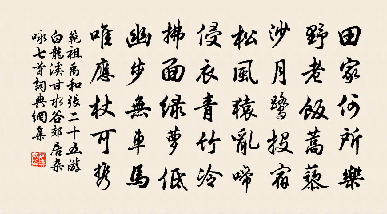 詩詞名句歷史字典書法欣賞書法字典國語詞典說文解字康熙字典古漢語字典標 題 作 者 詩 句 和張二十五游白龍溪甘水谷郊居雜詠七首作者:范祖禹 朝代:宋代原文田家何所樂,野老飯蒿藜。沙月鷺投宿,松風猿亂啼。侵衣青竹冷,拂面綠蘿低。幽步無車馬,唯應杖可攜。詩詞問答問:《和張二十五游白龍溪甘水谷郊居雜詠七首》的作者是誰?答:范祖禹問:該詩寫於哪個朝代?答:宋代書法欣賞和張二十五游白龍溪甘水谷郊居雜詠七首書法作品詩詞推薦雜詠一百首洛下閎劉克莊〔宋代〕巧曆雖千歲,先知一日差。未能下運算元,亦道是占家。鮫人潛織康翊仁〔唐代〕珠館馮夷室,靈鮫信所潛。幽閒雲碧牖,滉漾水精簾。機動龍梭躍,絲縈藕淬添。七襄牛女恨,三日大人嫌。透手慨然成詠詩庾信〔南北朝〕新春光景麗。遊子離別情。交讓未全死。梧桐唯半生。值熱花無氣。逢風水不平。寶雞雖有祀。何時能更鳴。寄吳道子王冕〔元代〕三月不見吳道子,十日兩渡錢塘江。詩書壓架自足樂,風月滿壇誰敢降?菖蒲青青繞石壁,薜荔密密緣山窗。歸來鸚鵡曲 燕南百五馮子振〔元代〕東風留得輕寒住。百五鬧蝶母蜂父。好花枝半出牆頭,幾點清明微雨。繡彎彎濕羅鞋,綺陌踏青回去。約明朝後日奉和李觀察登河中白樓耿湋〔唐代〕城上高樓飛鳥齊,從公一遂躡丹梯。黃河曲盡流天外,白日輪輕落海西。玉樹九重長在夢,雲衢一望杳如迷。何心和張政仲見寄三絕劉學箕〔宋代〕故人別去復一月,三絕詩章寄我來。我有青州四從事,已令挈至待君開。西江月(賀子忱家賞瑞香)曹勛〔宋代〕春繡東風疑早,映檐翠箔低籠。氤氳不是夢雲空。葉密香翻侵凍。折桂廣寒手段,移來點檢珍叢。醉歸滿載紫雲濃九華山袁甫〔宋代〕天河秀出九芙蓉,白也詩詞信是工。我欲依然名九子,人情山意兩融融。寄友王安之〔宋代〕憶昔青燈夜對床,冷猿聲里早梅香。一從去櫂沖寒雪,幾度憑闌到夕陽。秋思漸於蟬外覺,別愁空入雁邊長。梧桐張才叔屢作文公先生像如其生焉亦託名不朽矣蔡沈〔宋代〕紫陽遺像壁間開,誰寫當年道義懷。從此春風百千億,化身皆自筆端來。偈頌十二首釋安永〔宋代〕國師不跨石門句,舌頭未舉先分付。那堪覿面涉思惟,沖天鷂子新羅去。洞仙歌(八月十七日壽耕參夫人,時命羽士設醮)陳深〔宋代〕銀波湛碧,遙泛仙槎早。婺宿熒煌瑞雲曉。慶芳傳丹桂,歡動連枝,稱壽處,一簇蓬萊翠窈。步虛聲宛轉,清澈瑤秋陰晁說之〔宋代〕漠漠秋陰好,遙空見故鄉。可堪高頁病,無賴晚花香。枕靜泉聲細,簾疏風影長。肯教容易雨,吟興動何郎。示徒三戒釋原妙〔宋代〕舉心動念,無益於人,戒之莫起。戎州蘇軾〔宋代〕亂山圍古郡,市易帶群蠻。庾嶺春耕少,孤城夜漏閒。往時邊有警,征馬去無還。自頃方從化,年來亦款關。頗能發隆興後寄宋茂叔趙然道昆仲並屬達後篇於待趙蕃〔宋代〕連朝南浦亭,系此一葉舟。未去已欲動,既行奚復留。篙撐尚依岸,風至忽打頭。中宵渺無際,清曉浩莫收。行止京口野望汪元量〔宋代〕傍岸人家插酒旗,受降城下客行稀。南徐白晝虎成陣,北固黃昏鴉打圍。亂後江山元歷歷,愁邊楊柳極依依。櫂歌又靈溝道中韓維〔宋代〕春風來無跡,泱莽天地和。群生樂時陽,眾鳥舞且歌。嗟爾道旁叟,寒餒獨見羅。短席不自蔽,皮骨撐枯柯。呼童金陵新亭李白〔唐代〕金陵風景好,豪士集新亭。舉目山河異,偏傷周顗情。四坐楚囚悲,不憂社稷傾。王公何慷慨,千載仰雄名。名句推薦外亂而內整,示飢而實飽,內精而外鈍。姜子牙《六韜·文韜·兵道》 卻愁擁髻向燈前,說不盡、離人話納蘭性德《一絡索·過盡遙山如畫》 寵辱不驚,肝木自寧陳繼儒《小窗幽記·集靈篇》 歷覽千載書,時時見遺烈。陶淵明《癸卯歲十二月中作與從弟敬遠》 語之所貴者意也,意有所隨。意之所隨者,不可言傳也。莊子《莊子·外篇·天道》 燒痕慘澹帶昏鴉,數盡寒梅未見花。陳孚《詠永州》 潯陽江頭夜送客,楓葉荻花秋瑟瑟。白居易《琵琶行 / 琵琶引》 不枉東風吹客淚。相思難表,夢魂無據,惟有歸來是。歐陽修《青玉案·一年春事都來幾》 佳期悵何許,淚下如流霰謝朓《晚登三山還望京邑》 望廬思其人,入室想所歷。潘安《悼亡詩三首》