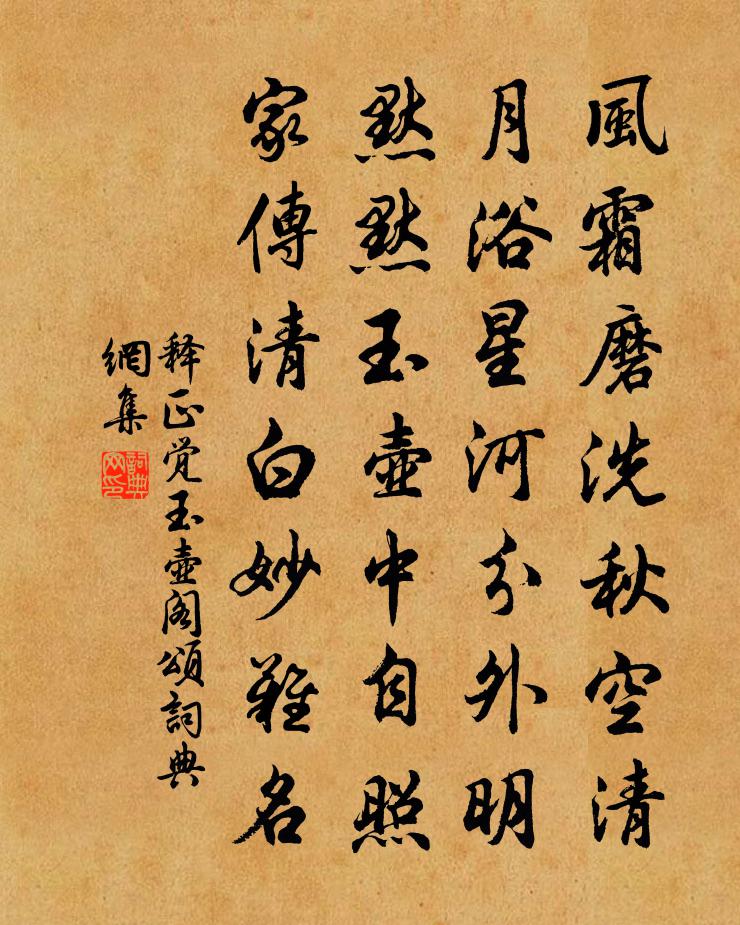 詩詞名句歷史字典書法欣賞書法字典國語詞典說文解字康熙字典古漢語字典標 題 作 者 詩 句 玉壺閣頌作者:釋正覺 朝代:宋代玉壺閣頌原文風霜磨洗秋空清,月浴星河分外明。默默玉壺中自照,家傳清白妙難名。詩詞問答問:玉壺閣頌的作者是誰?答:釋正覺問:玉壺閣頌寫於哪個朝代?答:宋代釋正覺玉壺閣頌書法欣賞玉壺閣頌書法作品詩詞推薦宿雲際寺溫庭筠〔唐代〕白蓋微雲一徑深,東峰弟子遠相尋。蒼苔路熟僧歸寺,紅葉聲乾鹿在林。高閣清香生靜境,夜堂疏磬發禪心。自從台城雜詩七首曹勛〔宋代〕卜築城隅久罷休,數椽忽得水西頭。四圍竹色繚寒碧,一徑杉風留素秋。門外水天分棐幾,天邊桂子入簾鉤。指蹤贈徐碧鑒真德秀〔宋代〕人言得罪為狂疏,若論狂疏罪不無。亦既自呵還自笑,只緣內相合崎嶇。戲呈趙舜臣覓酒二首姜特立〔宋代〕兵廚釀乏吻生煙,阮校如今作贅員。卻怪淵明便歸去,酒材猶自有圭田。月珠寺明月樓程少逸〔宋代〕江上群峰潑黛濃,水村煙渚夕陽紅。一聲啼鳥催耕去,何處龍歸急雨中。郎石峰楊萬里〔宋代〕四旁不與眾山連,特地孤尖立半天。碧落諸峰非不好,讓他郎石一峰先。用前韻贈閭丘民表曹勛〔宋代〕四寂無人雪在巒,喜君乘興酒腸寬。上方歸路踏梅影,霜月一庭天正寒。次韻何茂恭詠玉簪三絕喻良能〔宋代〕金谷墜樓人已遠,樓前首飾尚堪尋。誰家玉面雪肌女,淡掃蛾眉方稱簪。雜感陸游〔宋代〕買馬當可乘,築舍當可居;快馬多覆敗,傑屋鬼所狙。徒行與露坐,安穩無後虞。所以古達人,秋風憶蓴鱸。又憩西林寺有乘馬人來同宿董嗣杲〔宋代〕孤憑水閣坐斜曛,七極浮屠壓暝氛。慧永祠空依晉樹,率更碑古宿唐雲。自聽遠鶴情偏逸,誰策羸驂趣不群。同向和題劍門韓昭〔唐代〕閉關防老寇,孰敢振威稜。險固疑天設,山河自古憑。三川奚所賴,雙劍最堪矜。鳥道微通處,煙霞鎖百層。將赴朔方軍應制張說〔唐代〕禮樂逢明主,韜鈐用老臣。恭憑神武策,遠御鬼方人。供帳榮恩餞,山川喜詔巡。天文日月麗,朝賦管弦新。幼志臥病聞常山旋師策勛宥過王澤大洽因寄李六侍郎劉禹錫〔唐代〕寂寂重寂寂,病夫臥秋齋。夜蛩思幽壁,槁葉鳴空階。南國異氣候,火旻尚昏霾。瘴煙跕飛羽,沴氣傷百骸。昨聞四用韻十首楊公遠〔宋代〕小醉初醒後,沖寒作興游。宿雲山頂散,殘雪樹根留。檐溜懸冰柱,風威凍玉樓。欲吟吟未穩,歸擁地爐休。建炎庚戌中秋夜與同官相期於月下既為頑雲障馮時行〔宋代〕玉皇敕諸天,茲夕盡群見。驅雲收月光,反照玉京宴。老龍翻海窟,沓靄郁萬變。天公有嚴令,遺隙無一紅。蕭蕭偈頌四十一首釋普寧〔宋代〕一塵入正定,諸塵三昧起。諸塵入正定,一塵三昧起。三昧與正受,土塊泥里洗。咦,白日堂堂眼見鬼。非不非,霜天曉角陳著〔宋代〕感不已江寒雁咽。短棹還催發。曾是玉堂仙伯,相別處、滿蓬雪。此別。那堪說。溯風空淚血。惟有梅花依舊,香慶元戊午臨江勸駕多士凡由進士科進者皆預焉彭龜年〔宋代〕太守興賢隘九州,勸為之駕盛炎劉。方今神聖四門癖,即日英雄一網收。在藻久觀鱣發發,食苹又聽鹿呦呦。來年句楊蟠〔宋代〕杖藜林下雲。送韋書記歸京(座主侍郎同舉)杜荀鶴〔唐代〕韋杜相逢眼自明,事連恩地倍牽情。聞歸帝里愁攀送,知到師門話姓名。朝客半修前輩禮,古人多重晚年榮。從來名句推薦渭北春天樹,江東日暮雲。杜甫《春日憶李白》 窗白一聲雞,枕函聞馬嘶。顧貞觀《菩薩蠻·山城夜半催金柝》 世事洞明皆學問,人情練達即文章。曹雪芹《紅樓夢·第五回》 寬柔以教,不報無道,南方之強也。君子居之。子思《中庸·第十章》 故人書報,莫因循、忘卻蓴鱸。辛棄疾《漢宮春·會稽秋風亭觀雨》 雲中君不見,竟夕自悲秋。馬戴《楚江懷古三首·其一》 橫笛和愁聽,斜枝倚病看。崔道融《梅花》 文人之筆,勸善懲惡也。王充《論衡·卷二十·佚文篇》 我亦且如常日醉,莫教弦管作離聲。歐陽修《別滁》 黃昏庭院柳啼鴉,記得那人,和月折梨花。陳亮《虞美人·東風盪颺輕雲縷》