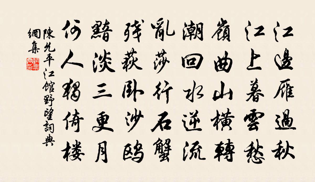 詩詞名句歷史字典書法欣賞書法字典國語詞典說文解字康熙字典古漢語字典標 題 作 者 詩 句 江館野望作者:陳允平 朝代:宋代江館野望原文江邊雁過秋,江上暮雲愁。嶺曲山橫轉,潮回水逆流。亂莎行石蟹,殘荻臥沙鷗。黯淡三更月,何人獨倚樓。詩詞問答問:江館野望的作者是誰?答:陳允平問:江館野望寫於哪個朝代?答:宋代陳允平江館野望書法欣賞江館野望書法作品詩詞推薦萬州湖灘寄王夔州查簽〔宋代〕滿目暮山平遠,一池雲錦清酣。忽有鐘聲林際,直疑夢到江南。居厚弟和七十四吟再賦劉克莊〔宋代〕光堯倉卒幸山陰,或者訛傳蹕再臨。長算決於春思殿,捷書來 * 胡林。奔逃尤甚騎豬窘,懲創從前飲馬心。強作正月初三日水西寺方回〔宋代〕不至水西久,十年懷夢思。重行兵後路,暗覓壁間詩。僧出房俱鐍,人游榼自隨。隔溪望城郭,未覺似春時。和蒲大受王園泛舟用文老韻郭印〔宋代〕晚風江色佳,水碧煙冥冥。聊持一壺酒,落日相與傾。浮榮何預人,於焉樂此生。往來信扁舟,恍若空中行。秦會之題絕塵亭李若水〔宋代〕脫跡塵囂外,悠然寄北亭。池平一鑒淨。山遠數螺青。身世驚殘夢,行藏忌獨醒。惟閒即近道,不必玩丹經。遲往泉店殺麥蘇轍〔宋代〕罷民不耕穫,豈利有攸往。古人為我言,許此亦無妄。一冬免鋤犁,二麥盈瓮盎。火老金尚伏,雨過築場壤。鄰家春詞酬元微之(一作施肩吾詩)沈亞之〔唐代〕黃鶯啼時春日高,紅芳發盡井邊桃。美人手暖裁衣易,片片輕花落翦刀。除夕劉克莊〔宋代〕憶昔都城值歲除,高樓張燭戲呼盧。久依淨社參尊宿,難向新豐認酒徒。天子未知工草賦,鄰人或倩寫桃符。夜寒華月張耒〔宋代〕華月流春宵,散我高林影。披衣步其下,愛此掃地靜。吾心方浩然,萬境一澄瑩。徙倚玉繩低,寂寥沉遠聽。草堂郭印〔宋代〕草堂何處覓,雲黯浣花溪。棟宇已非昨,松竹尚依依。荒坡臥頹日,寒浪搖清颸。萬象不禁寫,吟喔想當時。我公野性陸游〔宋代〕野性從來與世疏,俗塵自不到吾廬。醉中往往得新句,夢裡時時見異書。稚子那偷服藥酒,家僮尚護放生魚。今朝臨江仙李之儀〔宋代〕九十日春都過了,尋常偶到江皋。水容山態兩相饒。草平天一色,風暖燕雙高。酒病厭厭何計那,飛紅更送無聊。謾興姜特立〔宋代〕烏藤黃葛一山癯,萬事從人笑闊迂。作計尚余詩氣習,遣閒須著睡工夫。次韻沖卿除日立春王安石〔宋代〕猶殘一日臘,並見兩年春。物以終為始,人從故得新。迎陽朝翦彩,守歲夜傾銀。恩賜隨嘉節,無功只自塵。江南弄周巽〔元代〕春意動。池塘初解凍。花間啼鳥驚人夢。綺戶微開曙色明。沉香火暖曉寒輕。夭桃半吐傳芳訊,新鶯百囀感中情。劉公實母夫人董氏輓詩蔡戡〔宋代〕杏圃仙遊遠,桃源往事虧。名高孝婦傳,詞掞外孫碑。孟鼎方知貴,萊衣不復嬉。生男有如此,天道豈無知。三和二首劉克莊〔宋代〕主聖時清萬宇春,禽魚花草各懷新。如何丹鳳樓中手,未作金雞竿下人。家有寧馨堪跨灶,囊無阿堵可通神。客談固陵道中三首文天祥〔宋代〕九天雲下垂,一雨作秋色。塵埃化泥塗,原野轉蕭瑟。十里一雙堠,狐兔臥荊棘。見說數年來,中州乍蘇息。答蔣解元芸張汝勤〔宋代〕悠然風月一閒身,健在何妨白髮明。徑竹操如人不老,澗芹香與水俱清。傳家老硯孫攜去,落筆新詩僧帶行。那得和陳勉仲二首王之道〔宋代〕相逢憐我太衰顏,冰雪精神照座間。霽日有情茶乳合,春風無力柳絲閒。肯從逋客來三徑,只恐佳人賦二山。舊說名句推薦朝真暮偽何人辨,古往今來底事無。白居易《放言五首·其一》 朝聞道,夕死可矣。孔子弟子《論語·里仁篇》 蕭蕭遠樹疏林外,一半秋山帶夕陽。寇準《書河上亭壁》 但去莫復問,白雲無盡時。王維《送別》 一寸相思一寸灰。蘇軾《南鄉子·集句》 如來不應以具足諸相見。鳩摩羅什譯《金剛經·離色離相》 老來多健忘,唯不忘相思。白居易《偶作寄朗之》 密雲雙鳳,初破縷金團。米芾《滿庭芳·詠茶》 五更鐘動笙歌散,十里月明燈火稀。賀鑄《思越人·紫府東風放夜時》 吳台直下,緗梅無限,未放野橋香度。吳文英《永遇樂·探梅次時齋韻》