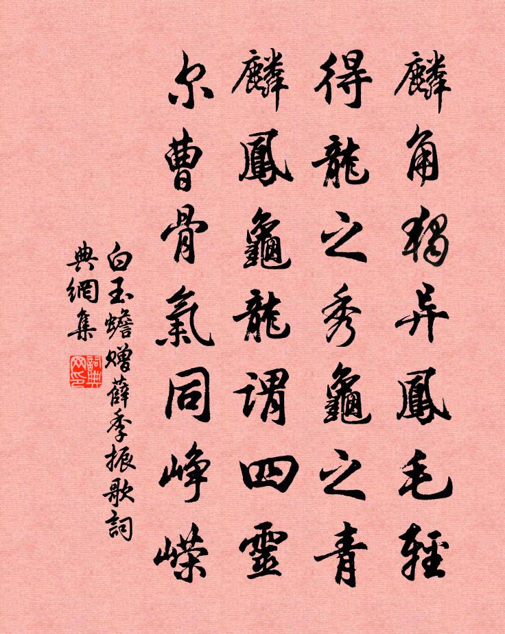 詩詞名句歷史字典書法欣賞書法字典國語詞典說文解字康熙字典古漢語字典標 題 作 者 詩 句 贈薛季振歌作者:白玉蟾 朝代:宋代贈薛季振歌原文麟角獨異鳳毛輕,得龍之秀龜之青。麟鳳龜龍謂四靈,爾曹骨氣同崢嶸。詩詞問答問:贈薛季振歌的作者是誰?答:白玉蟾問:贈薛季振歌寫於哪個朝代?答:宋代問:贈薛季振歌是什麼體裁?答:樂府白玉蟾贈薛季振歌書法欣賞贈薛季振歌書法作品詩詞推薦次韻子瞻題岐山周公廟蘇轍〔宋代〕周人尚記有周公,禾黍離離下有宮。破豆烝豚非以報,野巫長跪若為通。山圍棟宇泉流近,鳳去梧桐落葉閈。有客曹叔時見過索餞篇陳深〔宋代〕泄雲蒙朝日,微雨沾庭除。幽人掩財臥,門外無來車。曹子別經歲,枉道過我廬。謂余抱文藝,胡為守鄉閭。余日偈六十九首釋道寧〔宋代〕陰雲彌四野,心地長塵埃。試請回光看,生從何處來。寄鄂渚王子文教授仇遠〔宋代〕笑把青藜杖,遠遊黃鶴城。雨消戰伐氣,春生弦誦聲。相從未有約,久別難為情。東望思渺渺,江長秋月明。朔管方乾〔唐代〕寥寥落何處,一夜過胡天。送苦秋風外,吹愁白髮邊。望鄉皆下淚,久戍盡休眠。寂寞空沙曉,開眸片月懸。早起杜甫〔唐代〕春來常早起,幽事頗相關。帖石防隤岸,開林出遠山。一丘藏曲折,緩步有躋攀。童僕來城市,瓶中得酒還。泛舟城南會者五人分韻賦詩得人皆若炎字四首蘇軾〔宋代〕城中樓閣似魚鱗,不見清風起白苹。試選苕溪最深處,仍呼我輩不羈人。窺船野鶴何曾下,見燭飛蟲空自馴。繞郭玉梁道中雜詠羅與之〔宋代〕清商從西來,刺刺滿林塢。草木倏變衰,柯葉不相雇。昔時翳空雲,今作連山雨。菊花猶強項,籬邊爭媚嫵。送崔約秀才賈島〔唐代〕歸寧仿佛三千里,月向船窗見幾宵。野鼠獨偷高樹果,前山漸見短禾苗。更深柵鎖淮波疾,葦動風生雨氣遙。重入答王鞏蘇軾〔宋代〕汴泗遶吾城,城堅如削鐵。中有李臨淮,號令肝膽裂。古來彭城守,未省怕惡客。惡客雲是誰?祥符相公孫。是家方殿省示惠遠祖先生詩集強至〔宋代〕先生名不死,三百幾年間。白首吟唐世,清風起越山。遺編流自久,異代許誰刪。遠裔傳能事,斯文氣欲還。天淨沙·春白樸〔元代〕春山暖日和風,闌桿樓閣簾櫳。楊柳鞦韆院中。啼鶯舞燕,小橋流水飛紅。史昭甫招陳宗魯之長興戴表元〔宋代〕之子滄浪去,三吳西更西。白鹽蓴菜膾,紅酒稻花雞。地少驚雲滿,天空見日低。錦囊看爛熳,佳客醉留題。批周宗書後李建勛〔唐代〕偶罷阿衡來典郡,固無閒物可應官。憑君為報群胥道,莫作循州刺史看。望江南劉辰翁〔宋代〕梧桐子,人在御街游。鳳宿雲綃金縷帶,龍池翠帳玉香球。宮女後庭秋。鷓鴣天 題雙頭蓮二首劉敏中〔元代〕脈脈誰教並蒂芳。情緣何許苦難量。西風香冷同幽怨,落日紅酣對晚妝。波浩蕩,月微茫。湘靈寂寞下橫塘。不堪句陳與義〔宋代〕老對白桂花。贈王處士許渾〔唐代〕歸臥養天真,鹿裘烏角巾。茂陵閒久病,彭澤醉長貧。冠蓋西園夜,笙歌北里春。誰憐清渭曲,又老釣魚人。軍中寄內陳子全〔宋代〕一望瀟湘遍露迷,胡笳吹月夜淒淒。回天無力心難死,矢日同仇志應齊。但使首陽存漢地,不教陰塞牧羌羝。聲名擬寒山拾得二十首王安石〔宋代〕莫嫌張三惡,莫愛李四好。既往侂即晚,未來思又早。見之亦何有,欻然如電掃。惡既是磨滅,好亦難長保。若令名句推薦人間更有風濤險,翻說黃河是畏途。宋琬《渡黃河》 南山與秋色,氣勢兩相高。杜牧《長安秋望》 蓬山此去無多路,青鳥殷勤為探看。李商隱《無題·相見時難別亦難》 小雨濕黃昏。重午佳辰獨掩門。李之儀《南鄉子·端午》 一家之計在於和,一生之計在於勤。佚名《增廣賢文·上集》 心心視春草,畏向階前生。王維《雜詩三首 / 雜詠三首》 君到姑蘇見,人家盡枕河。杜荀鶴《送人游吳》 齊唱憲王春樂府,金梁橋外月如霜。李夢陽《汴京元夕》 秋陰不散霜飛晚,留得枯荷聽雨聲。李商隱《宿駱氏亭寄懷崔雍崔袞》 愔愔坊陌人家,定巢燕子,歸來舊處。周邦彥《瑞龍吟·大石春景》