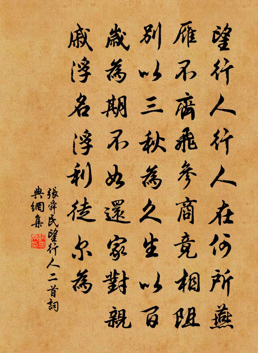 詩詞名句歷史字典書法欣賞書法字典國語詞典說文解字康熙字典古漢語字典標 題 作 者 詩 句 望行人二首作者:張舜民 朝代:宋代望行人二首原文望行人,行人在何所。燕雁不齊飛,參商竟相阻。別以三秋為久,生以百歲為期。不如還家對親戚,浮名浮利徒爾為。詩詞問答問:望行人二首的作者是誰?答:張舜民問:望行人二首寫於哪個朝代?答:宋代張舜民望行人二首書法欣賞望行人二首書法作品詩詞推薦句俞君錫〔宋代〕蛩聲依壞砌,樹影倒寒池。東都所居寒食下作陳潤〔唐代〕江南寒食早,二月杜鵑鳴。日暖山初綠,春寒雨欲晴。浴蠶當社日,改火待清明。更喜瓜田好,令人憶邵平。病中即事十五首趙蕃〔宋代〕晚食以當肉,人言蠋巧貧。茹蔬何不可,設說未為真。既屏豬肝累,何須鮭菜珍。夜煨牛糞芋,朝罨破鐺塵。送胡康老王灼〔宋代〕胡公起三晉,才如山河雄。弊裘走上都,氣壓洛與嵩。豈無濟時策,入對明光宮。戰塵一飄蕩,雙影隨疏蓬。虎符春秋戰國門虞卿周曇〔唐代〕割地求和國必危,安知堅守絕來思。年年來伐年年割,割盡邯鄲何所之。鏤雞子駱賓王〔唐代〕幸遇清明節,欣逢舊練人。刻花爭臉態,寫月競眉新。暈罷空餘月,詩成並道春。誰知懷玉者,含響未吟晨。看山吳錫疇〔宋代〕一寒未辦買山賞,隨處看山總可詩。人事無常山換主,青山依舊不曾移。和黃觀復梅句蘇泂〔宋代〕梅花骨相本通仙,何況苔枝綴玉鸞。如著官袍更瀟灑,不應將作女人看。吉州第八十一文天祥〔宋代〕泊舟滄江岸,身輕一鳥過。請為父老歌,歌長擊樽破。游叔祖次對宅南新園計張鎡〔宋代〕入門疑是洞中天,有此人間事兩全。深窈高明俱要景,安閒榮盛未衰年。軒窗處鶴千層竹,風雨催詩十畝蓮。聞道滿江紅黃公紹〔宋代〕客子光陰,又還是、杏花阡陌。敧枕聽、一窗夜雨,怎生禁得。銀蠟痕消珠鳳小,翠衾香冷文鴛拆。嘆人生、時序西江月(和蘇庭藻)張元乾〔宋代〕小閣劣容老子,北窗仍遞南風。維摩丈室久空空。不與散花同夢。且作大真遊戲,未甘金粟龍鍾。憐君病後頰顴隆山村戴復古〔宋代〕山崦誰家綠樹中,短牆半露石榴紅。蕭然門巷無人到,三兩孫隨白髮翁。寄題趙紫芝墓薛師石〔宋代〕辛未聯詩別,九年成恍惚。大星墜地旋無光,君身入土名不沒。呈越之水相交流,寂寞詩魂何處游。不聞孤鶴喚人風流子朱敦儒〔宋代〕吳越東風起,江南路,芳草綠爭春。倚危樓縱目,繡簾初卷,扇邊寒減,竹外花明。看西湖、畫船輕泛水,茵幄穩句韓履常〔宋代〕李門弟子饒門友,渭水年齡泗水心。奉和介甫正月二日韓維〔宋代〕春意來何早,乾坤潤澤中。雪明初照日,雲斷欲隨風。世事蚊虻過,身謀雁鶩同。諸君亦詩酒,吾道未應窮。六月二十一日內引賜對緝熙殿玉音宣問漏下數岳珂〔宋代〕曲廊青瑣午陰遲,一朵紅雲擁緝熙。便座詢猷親帝問,近璫承詔引朝儀。小臣曾是鵷鴻舊,夙幸還瞻龍鳳姿。出殿感櫻桃花因招飲客白居易〔唐代〕櫻桃昨夜開如雪,鬢髮今年白似霜。漸覺花前成老醜,何曾酒後更顛狂。誰能聞此來相勸,共泥春風醉一場?西江月朱敦儒〔宋代〕元是西都散漢,江南今日衰翁。從來顛怪更心風。做盡百般無用。屈指八旬將到,回頭萬事皆空。雲間鴻雁草間蟲名句推薦遠岫出山催薄暮,細風吹雨弄輕陰。梨花欲謝恐難禁。李清照《浣溪沙·小院閒窗春色深》 林壑斂暝色,雲霞收夕霏。謝靈運《石壁精舍還湖中作》 追亡事、今不見,但山川滿目淚沾衣辛棄疾《木蘭花慢·席上送張仲固帥興元》 四牡何時入,吾君憶履聲。張九齡《奉和聖制送尚書燕國公赴朔方》 宮衣亦有名,端午被恩榮。杜甫《端午日賜衣》 樂極生悲,否極泰來。施耐庵《水滸傳·第二十六回》 柴門聞犬吠,風雪夜歸人。劉長卿《逢雪宿芙蓉山主人》 當路誰相假,知音世所稀孟浩然《留別王侍御維/留別王維》 其交也以道,其接也以禮孟子《孟子·萬章章句下·第四節》 小荷才露尖尖角,早有蜻蜓立上頭。楊萬里《小池》