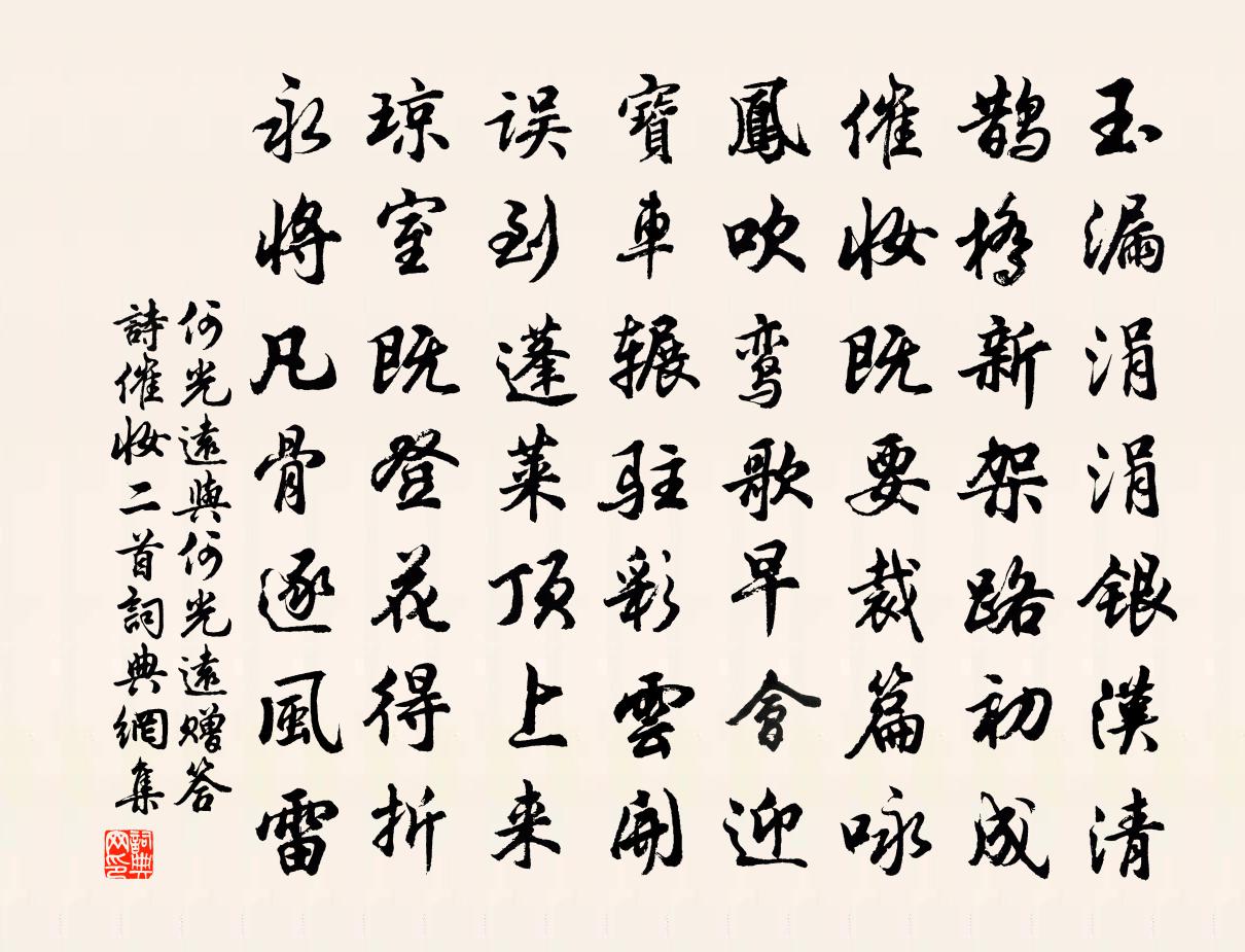 詩詞名句歷史字典書法欣賞書法字典國語詞典說文解字康熙字典古漢語字典標 題 作 者 詩 句 與何光遠贈答詩(催妝二首)作者:何光遠 朝代:唐代原文玉漏涓涓銀漢清,鵲橋新架路初成。催妝既要裁篇詠,鳳吹鸞歌早會迎。寶車輾駐彩雲開,誤到蓬萊頂上來。瓊室既登花得折,永將凡骨逐風雷。詩詞問答問:《與何光遠贈答詩(催妝二首)》的作者是誰?答:何光遠問:該詩寫於哪個朝代?答:唐代問:該詩是什麼體裁?答:七絕書法欣賞與何光遠贈答詩(催妝二首)書法作品注釋全唐詩:卷864-33詩詞推薦廌寓龍興仁王佛舍德麟公定道輔仲寶攜酒希納李廌〔宋代〕宿雨旦初霽,微涼吹廣庭。嘉賓忽相遇,方午夢驚扣扃。長松森翠影,德修竹參青冥。飄雲度空急,仲殘日穿林明句洪邁〔宋代〕謾繞清流欲浣衣。雪台曾幾〔宋代〕白晝俯層台,千山萬山月。若不犯高寒,安知此奇絕。送大理張卿(一題作送張衛尉)顧況〔唐代〕春色依依惜解攜,月卿今夜泊隋堤。白沙洲上江蘺長,綠樹村邊謝豹啼。遷客比來無倚仗,故人相去隔雲泥。越禽頌古二十首釋了一〔宋代〕楊岐金圈與栗蓬,吞跳依前事不同。大海都來一口吸,更無南北與西東。主人故亭王建〔唐代〕主人昔專城,城南起高亭。貴與賓客游,工者夜不寧。酒食宴圃人,栽接望早成。經年使家僮,遠道求異英。郡中北至太原李益〔唐代〕炎祚昔昏替,皇基此郁盤。玄命久已集,撫運良乃艱。南厄羊腸險,北走雁門寒。始於一戎定,垂此億世安。唐風保叔塔董嗣杲〔宋代〕鹹平曾有募緣僧,遍走街坊負叔稱。定力一堅無外想,窣波七極可中興。愚夫春日燒冥{上竹下奄},道者昏時炙殿院曾淵子宅酒酣放歌廖應淮〔宋代〕禽聲兮啾啾,草色兮幽幽。風{左火右專}{左火右專}兮火怒,泉殷殷兮血流。屋將焚兮燕呢喃以未已,鼎沸兮靈準上人院賈島〔唐代〕掩扉當太白,臘數等松椿。禁漏來遙夜,山泉落近鄰。經聲終卷曉,草色幾芽春。海內知名士,交遊準上人。萬山堂飲歸方回〔宋代〕追懷往者數賢侯,得得經營續續修。依舊夜欄低北斗,幾番春絮委東流。同游盡道山能好,半醉誰知我獨愁。乃後梅陳藻〔宋代〕野水橋邊幾樹梅,歲寒款款向人開。精神別帶陽春到,造化勻分臘月來。滿眼松筠皆臭味,一天霜雪是胚胎。看花次黃象之韻李呂〔宋代〕疏山元是讀書山,相望 * 舊醮壇。梵剎雄夸今日勝,隱居誰作故人看。閒隨米運川塗迥,喜入林亭境界寬。我已宋江三十六贊龔開〔宋代〕大行好流,三十有六。無此火兒,其數不足。和洪司令春日客懷二首程公許〔宋代〕好風排闥錦囊來,咀味真如渴望梅。櫻筍算無金日事,棠梨約有幾分開。社醅熟倩是壺勸,春種忙應布{轂車換催偈頌二百零五首釋正覺〔宋代〕不居功,不合半,脫體其間過一遍。夢覺船浮明月波,眼寒雪擁蘆華岸。鄜畤李相公黃滔〔唐代〕秦城擇日發征轅,齋戒來投節制尊。分虎名高初命相,攀龍跡下愧登門。夜聽謳詠銷塵夢,曉拜旌幢戰旅魂。華舍以人生五馬貴莫受侵為韻送胡獻叔守邵陽方岳〔宋代〕餂以瀾翻口,箝以霹靂手。俗吏{上比下言}儒腐,吾曹自甘受。行香子張翥〔元代〕傳癖詩逋。野逸山*。是幽人、平日稱呼。過如飯袋,勝似錢愚。盡我為牛,人如虎,子非魚。石銚風爐。雪碗冰讀史劉克莊〔宋代〕絕漠犁庭功可喜,與天爭鼎志堪悲。吠江帝剖為羓去,避地民勞若蟻移。河決固非束薪塞,廈傾欲以一繩維。英雄名句推薦遠送從此別,青山空復情。杜甫《奉濟驛重送嚴公四韻》 聲樂之入人也深,其化人也速。荀子《荀子·樂論》 歷覽千載書,時時見遺烈。陶淵明《癸卯歲十二月中作與從弟敬遠》 別院深深夏席清,石榴開遍透簾明。蘇舜欽《夏意》 大家漸及消亡,難期其復振,勢成於因循也。王永彬《圍爐夜話·第三七則》 日暮飛鴉集,滿山蕎麥花。溫庭筠《題盧處士山居 / 處士盧岵山居》 洞庭葉未下,瀟湘秋欲生徐禎卿《在武昌作》 夕陽倒影射疏林,江邊一帶芙蓉老。陳霆《踏莎行·晚景》 漫向寒爐醉玉瓶,喚君同賞小窗明。陸游《浣溪沙·和無咎韻》 儒以文亂法,俠以武犯禁。韓非及後人《韓非子·五蠹》
