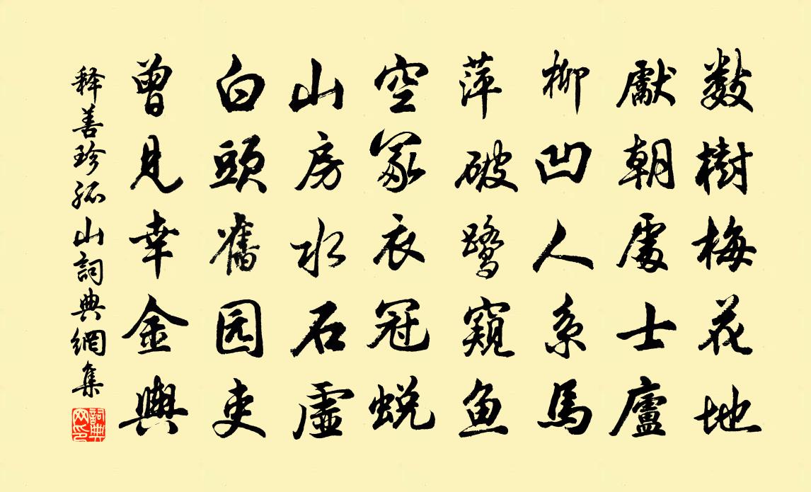 詩詞名句歷史字典書法欣賞書法字典國語詞典說文解字康熙字典古漢語字典標 題 作 者 詩 句 孤山作者:釋善珍 朝代:宋代孤山原文數樹梅花地,先朝處士廬。柳凹人系馬,萍破鷺窺魚。空冢衣冠蛻,山房水石虛。白頭舊園吏,曾見幸金輿。詩詞問答問:孤山的作者是誰?答:釋善珍問:孤山寫於哪個朝代?答:宋代釋善珍孤山書法欣賞孤山書法作品詩詞推薦偈頌二十五首釋普岩〔宋代〕此香堪笑又堪悲,剛把愁腸說向誰。冶父山前曾落節,午鈞之重一毫釐。次韻江陵張撫乾送行二首項安世〔宋代〕戌瓜達首夏,行李傍中秋。此意元衰懶,吾生足滯留。竹枝看峽舞,月子聽吳謳。官況能多少,棲棲一世愁。次韻郭教授雪二首陳造〔宋代〕皇心憂喜與民同,帝意深憐歲不豐。瑤檢何時下仙界,瑞花一昔覆寰中。和聲已自消疵癘,陳廩從知飽困窮。今世資政入村造壽器謾賦陳宗遠〔宋代〕功成身退從來少,綠野超然洗俗埃。閒出西疇營六檟,勝傳南極映三槐。迎門村婦攜兒拜,遮道田翁帶犬回。競喜神君歌十首劉克莊〔宋代〕亂離無醉者,有則以為祥。慚愧生平世,人人在酔鄉。齊雲亭宋祁〔宋代〕憑高徙倚不成下,把酒直送斜陽曛。遮回西北望鄉眼,遭箇亭亭車蓋雲。句熊皎〔唐代〕山前猶見月,陌上未逢人。果熟秋先落,禽寒夜未棲。深逢野草皆為藥,靜見樵人恐是仙。厭聽啼鳥夢醒後,慵掃賦得櫻桃李世民〔唐代〕華林滿芳景,洛陽遍陽春。朱顏含遠日,翠色影長津。喬柯囀嬌鳥,低枝映美人。昔作園中實,今來席上珍。庚寅秋病得語不復詮次名曰感懷黎廷瑞〔宋代〕祖龍制八極,法令如亂麻。儒冠委秋山,王燄明朝霞。所以武陵人,入山種桃花。如何東陵侯,苟此旦暮華。堂堂【雙調】雁兒落過得勝令 相思蘭楚芳〔元代〕丹楓葉上詩,白雁雲中字。黃昏多病身,黑海心間事。月影轉花枝,香篆裊金獅。翡翠衾寒處,鴛鴦夢覺時。嗟咨送王嘉叟侍郎使虜仍用其韻胡銓〔宋代〕蘇張姓字炳如丹,遍歷遐荒覺世寬。龍勒殊勛標絕域,麟宮奇節障狂瀾。二千里外河源遠,十九年間海上寒。二子淳佑七年丁未十一月朔蔡久自江東提刑歸抵家楊世奕〔宋代〕富貴寧如節義香,也教青史播余芳。四年諫省歸何暮,七十新參老欲強。孺子早聞辭爵位,君謨今又去班行。軺車頌古十八首釋師一〔宋代〕一著機先用得親,可憐窮子眼無筋。須知八 * 書處,前箭猶輕後箭深。論語絕句一百首張九成〔宋代〕於時舍瑟方鏗爾,豈意吾師亦喟然。此際風流入不識,只應瀟灑得心傳。梅唐彥謙〔唐代〕玉人下瑤台,香風動輕素。畫角弄江城,鳴璫月中墮。送查仲文三首項安世〔宋代〕先生江海乾,使者水曹郎。開絹印三道,懷人天一方。上江春水急,穿峽晚雲長。詩酒勤陶寫,中年屬易傷。滿江紅(東武會流懷亭)蘇軾〔宋代〕東武南城,新堤固、漣漪初溢。隱隱遍、長林高阜,臥紅堆碧。枝上殘花吹盡也,與君更向江頭覓。問向前、猶有覽盧子蒙侍御舊詩,多與微之唱和,感今傷昔白居易〔唐代〕早聞元九詠君詩,恨與盧君相識遲。今日逢君開舊卷,卷中多道贈微之。相看掩淚情難說,別有傷心事豈知。聞道行藥作翁卷〔宋代〕病倦令人懶欲吟,偶因行藥過牆陰。煙生園柳暮鴉集,水涸池塘秋草侵。有口不須談世事,無機惟合臥山林。西風奉和聖制溫泉言志應制張說〔唐代〕溫谷媚新豐,驪山橫半空。湯池薰水殿,翠木暖煙宮。起疾逾仙藥,無私合聖功。始知堯舜德,心與萬人同。名句推薦蜂須輕惹百花心,蕙風蘭思寄清琴。薛昭蘊《浣溪沙·握手河橋柳似金》 寵柳嬌花寒食近,種種惱人天氣。李清照《念奴嬌·春情》 始知鎖向金籠聽,不及林間自在啼。歐陽修《畫眉鳥》 我歌君起舞,潦倒略相同。陳師道《除夜對酒贈少章》 閉門家裡坐,禍從天上來。馮夢龍《醒世恆言·卷十六》 秋色冷並刀,一派酸風卷怒濤。陳維崧《南鄉子·邢州道上作》 燕子巢方就,盆池小,新荷蔽。杜安世《鶴沖天·清明天氣》 坐看黑雲銜猛雨,噴灑前山此獨晴。崔道融《溪上遇雨二首》 積於不涸之倉者,務五穀也管仲《管子·牧民》 黃葉仍風雨,青樓自管弦。李商隱《風雨》