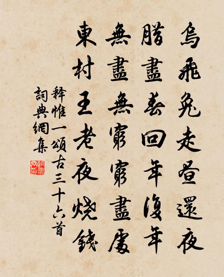 詩詞名句歷史字典書法欣賞書法字典國語詞典說文解字康熙字典古漢語字典標 題 作 者 詩 句 頌古三十六首作者:釋惟一 朝代:宋代頌古三十六首原文烏飛兔走晝還夜,臘盡春回年復年。無盡無窮窮盡處,東村王老夜燒錢。詩詞問答問:頌古三十六首的作者是誰?答:釋惟一問:頌古三十六首寫於哪個朝代?答:宋代釋惟一頌古三十六首書法欣賞頌古三十六首書法作品詩詞推薦和實之讀邸報四首劉克莊〔宋代〕況鮀非是佞,莒仆未為凶。鬼谷從橫舌,終南詭秘蹤。斷無麟在藪,獨有鼠穿墉。千古誰儔匹,依稀似敬宗。送人往長沙齊己〔唐代〕荊門歸路指湖南,千里風帆興可諳。好聽鷓鴣啼雨處,木蘭舟晚泊春潭。將入關行次湘陰曹松〔唐代〕背顧秦城在何處,圖書作伴過湘東。神鴉亂噪黃陵近,候雁斜沉夢澤空。打槳天連晴水白,燒田雲隔夜山紅。也知偶書王安石〔宋代〕雄也營身足,聃兮悞汝多。捐書知聖已,絕學奈禽何。偈十首釋慧暉〔宋代〕少而可努力,老而可歇心。都盧懶萬事,雙眸淚濕襟。史館趙祠部況通判宿州楊億〔宋代〕風流華省含香客,籍甚先朝奏賦人。竹使三年勞佐郡,柳堤千里待行春。文園避事心長笑,天祿讎書鬢漸新。帝念太和貢士陳誠之記予顏欲置遠明樓昔白傅年七周必大〔宋代〕巍樓必欲稱元龍,須寫褒公與鄂公。鶴毳雞膚吾老矣,只宜簑笠釣船中。伯和見過鄒浩〔宋代〕參軍跋馬瘴江濱,一笑相逢意轉親。偶復面論前日事,恍疑身是隔生人。風隨玉塵傾新蓋,暑避冰姿返舊輪。八桂九日靈興山沽酒賞菊鄧深〔宋代〕眾山環繞一溪斜,低小軒窗眺望賒。行遣方兄尋野店,坐邀歡伯過仙家。多情戀頂烏妙帽,不語向人 * 花。山月和趙生二首胡寅〔宋代〕冠月裾雲佩綠霞,百年將此送生涯。愁心別後無詩草,病眼燈前有醉花。落筆擅場聊寫意,背山臨水遂成家。也須贈薜道士王遂〔宋代〕覿面逢幽侶,裝懷解吏紛。曾敲筠戶月,屢宿柳塘雲。離索知余恨,來過謝子勤。山中新雨足,幾處未耕耘。入道信州水南徐照〔宋代〕眾寺臨溪水,東西屋數間。詩傳叔倫句,真認貫休顏。柳過深潭碧,人隨白鳥還。斜陽三百里,高甚水晶山。山甫游鄞訪僧復歸山房舒岳祥〔宋代〕麥熟歸小隱,詩名留遠方。竹冠山靄重,棕屨石苔香。掃徑憐新筍,臨池玩舊芳。僧交非昔比,吾黨懼行藏。風入松 漁隱沈禧〔元代〕綠蓑新制把漁竿。擺脫舊衣冠。房租去住無拘系,朝吳楚、暮宿湘湍。且躲是非榮辱,不愁雨暑風寒。得魚沽酒任石牛莊閒居崔鶠〔宋代〕不識春風面,知從底處來。紅深桃靨破,綠靜水簾開。物外心常掛,人間事不諧。從今江海去,無復世推排。贈趙神眼姚勉〔宋代〕杜門人事少,排闥相師來。童子忙驅鶴,先生正看梅。煩君滕口說,如我豈身媒。水鏡能司馬,隆中覓異才。東新橋蘇軾〔宋代〕群鯨貫鐵索,背負橫空霓。首搖翻雪江,尾插崩雲溪。機牙任信縮。漲落隨高低。轆轤卷巨索,青蛟掛長堤。奔舟在伯見招觀雪因同貴溪尉曹登鄰寺之經樓且雲趙蕃〔宋代〕籃輿軋軋度成陰,鷺起衝波鵲噪林。當子倚闌成句警,政余擁褐坐檐深。裴回更盡高樓覽,空闊思收遠壑音。笑謝二月初十日自荻浦絕湖三首趙蕃〔宋代〕遠浪已搖目,疾風仍打頭。翩翻仰飛鳥,矯捷羨輕鷗。湖有萬頃白,舟才一葉浮。意行從泛泛,吾道本悠悠。偶成李流謙〔宋代〕仲明我友一肝腸,愛子殷勤出妙方。病後藥囊朝壁壘,老來貝葉是資糧。名句推薦杖劍對尊酒,恥為遊子顏。陸龜蒙《別離》 醉里乾坤大,壺中日月長施耐庵《水滸傳·第二十九回》 落日心猶壯,秋風病欲疏。杜甫《江漢》 志足而言文,情信而辭巧劉勰《文心雕龍·徵聖》 雷填填兮雨冥冥,猿啾啾兮狖夜鳴;屈原《九歌》 紅蓼渡頭秋正雨,印沙鷗跡自成行,整鬟飄袖野風香。薛昭蘊《浣溪沙·紅蓼渡頭秋正雨》 草長鶯飛二月天,拂堤楊柳醉春煙。高鼎《村居》 天山雪雲常不開,千峰萬嶺雪崔嵬。岑參《天山雪歌送蕭治歸京》 天下大勢,分久必合,合久必分。羅貫中《三國演義·第一回》 驚沙獵獵風成陣,白雁一聲霜有信。元好問《玉樓春·驚沙獵獵風成陣》