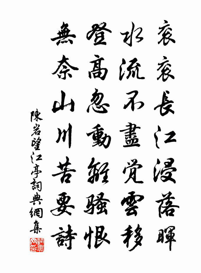 詩詞名句歷史字典書法欣賞書法字典國語詞典說文解字康熙字典古漢語字典標 題 作 者 詩 句 望江亭作者:陳岩 朝代:宋代望江亭原文袞袞長江浸落暉,水流不盡覺雲移。登高忽動離騷恨,無奈山川苦要詩。詩詞問答問:望江亭的作者是誰?答:陳岩問:望江亭寫於哪個朝代?答:宋代陳岩望江亭書法欣賞望江亭書法作品詩詞推薦送房元直赴北京嚴維〔唐代〕猶道樓蘭十萬師,書生匹馬去何之。臨岐未斷歸家目,望月空吟出塞詩。常欲激昂論上策,不應憔悴老明時。遙知夜夢得一句雲老樹拜風窗影亂因伸其語為一絕廖行之〔宋代〕夢魂栩栩塵緣掃,風拜月窗春樹老。一枕驚回得句時,清奇未遜池塘草。錢陳群故詩以志惜乾隆〔清代〕沈去錢存勢已孤,陡觀遺奏故人無。江南忽爾失二老,天子原非友匹夫。蒙邑應成蝶醒夢,香山那復鹿重扶。詩郵江湖傅夢得〔宋代〕落魄江湖上,人疑是謫仙。四時逢酒醉,長日擁書眠。點鬢惟添雪,知心只有天。林泉難久困,未整釣魚船。贈趙道卿劉過〔宋代〕虬髭蝟鬢虎精神,大袖披披二尺巾。散盡貲財猶結客,略為言語便驚人。斬蛟橋下懲前失,藏兔窟中甘後塵。朝士偈頌一百六十首釋宗杲〔宋代〕才方改歲賀新年,今朝又是二月一。入所證處沒商量,摩訶船若波羅蜜。季春周南〔宋代〕初篁欲迸籜,晚風微過之。斑苞初委地,永與琅玕辭。篁生五丈高,鳳吹鳴參差。隕籜膜已朽,不恨見竹遲。物成書窗碧桃陳文蔚〔宋代〕銅瓶只插碧桃花,日對幽人靜不嘩。為爾細觀冰雪艷,就中便覺牡丹夸。【中呂】朝天子 西湖徐再思〔元代〕里湖,外湖,無處是無春處。真山真水真畫圖,一片玲瓏玉。宜酒宜詩,宜晴宜雨。銷金鍋錦繡窟,老蘇,老逋,倦遊書事孫應時〔宋代〕隻影千山復萬山,兩年愁著鬢毛班。壯心未答吳鉤贈,素節聊全趙璧還。劍棧風煙通紫塞,峽天雲支帶烏蠻。逢人病中散步六絕岳珂〔宋代〕朝隨粥鼎蟬腹潤,夜掩書帷鰥目眠。無奈暑威侵病骨,起來搔首斗垂天。歲暮老懷陸游〔宋代〕粥美忘流啜,燈孤伴獨吟。衾寒知夜艾,身痛卜天陰。薪炭常憂絕,杯觴不厭深。故人今已矣,三嘆有遺音。賀吉州李守臘雪楊萬里〔宋代〕仁侯妙手作廬陵,民歌敏惠如神明。歌聲動天天降瑞,一夜幻出瓊瑤城。麗譙一新玉樓觀,郡治別起銀設廳。曉上與元居士青山潭飲茶靈一〔唐代〕野泉煙火白雲間,坐飲香茶愛此山。岩下維舟不忍去,青溪流水暮潺潺。驀山溪謝懋〔宋代〕厭厭睡起,無限春情緒。柳色借輕煙,尚瘦怯、東風倦舞。海棠紅皺,不奈晚來寒,簾半卷,日西沈,寂寞閒庭戶岩泉陳岩〔宋代〕月光泉脈瀉虛明,澄碧無瑕注一泓。大字石間標聖水,只緣徹底是真清。大行皇帝輓詩六首劉克莊〔宋代〕臨照三千界,涵濡四十春。沙難量福壽,天不大堯仁。眇小坡詩案,優容濮議人。老臣偏慟絕,曾扈屬車塵。酬襄陽儲檢法項安世〔宋代〕客子朝莫去,相過能幾回。少留貧快論,多病畏深杯。年少難量在,天姿信美哉。短檠三萬卷,莫待老相催。湖上今歲遊人頗盛戲作陸游〔宋代〕龍船看罷日平西,柳闇花穠步步迷。射的山前朱舫小,樵風涇上紫騮嘶。都下無憂館小樓春盡旅懷二首楊萬里〔宋代〕病眼逢書不敢開,春泥謝客亦無來。更無短計銷長日,且遶欄乾一百回。名句推薦從善如登,從惡如崩。左丘明《國語·周語·劉文公與萇弘欲城周》 秋風別蘇武,寒水送荊軻。庾信《擬詠懷二十七首·其二十六》 唯君子為能通天下之志。佚名《易傳·彖傳上·同人》 木與木相摩則然,金與火相守則流莊子《莊子·雜篇·外物》 春色將闌,鶯聲漸老。紅英落盡青梅小。寇準《踏莎行·春色將闌》 謹養勿勞,並氣積力。佚名《百戰奇略·第十卷·養戰》 人問誰,對以名。吾與我,不分明。李毓秀《弟子規·謹》 不畏浮雲遮望眼,自緣身在最高層。王安石《登飛來峰》 寒山吹笛喚春歸,遷客相看淚滿衣。李益《春夜聞笛》 故園渺何處,歸思方悠哉。韋應物《聞雁》