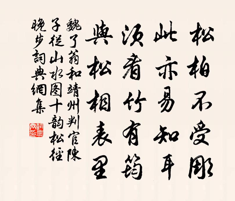 詩詞名句歷史字典書法欣賞書法字典國語詞典說文解字康熙字典古漢語字典標 題 作 者 詩 句 和靖州判官陳子從山水圖十韻松徑晚步作者:魏了翁 朝代:宋代原文松柏不受彫,此亦易知耳。須看竹有筠,與松相表里。詩詞問答問:《和靖州判官陳子從山水圖十韻松徑晚步》的作者是誰?答:魏了翁問:該詩寫於哪個朝代?答:宋代書法欣賞和靖州判官陳子從山水圖十韻松徑晚步書法作品詩詞推薦和顏長官百詠貧女朱繼芳〔宋代〕燈下穿針影伴身,懶將心事訴諸親。阿婆許嫁無訊息,芍藥花開又一春。早發平昌(一作昌平)島沈佺期〔唐代〕解纜春風后,鳴榔曉漲前。陽烏出海樹,雲雁下江煙。積氣沖長島,浮光溢大川。不能懷魏闕,心賞獨泠然。送惠補之昆仲秋試袁說友〔宋代〕斑斑蘭玉不勝清,長羨於門久日榮。共慶兩蘇離蜀道,從今二宋到神京。三年刻楮真餘事,一日乘槎定策名。想得卜運算元洪咨夔〔宋代〕簸弄柳梢春,呼吸花心露。倦粉嬌黃扇底風,盡向眉心度。喚醒海棠紅,約住櫻桃素。上到瑤台最上層,共跨青鸞鵲橋仙佚名〔宋代〕東西二府,掖垣一相,誰似碩人兄弟。驂鸞來伴紫陽仙,要同享、橘中千歲。銀燈初試,花城不夜,鐵馬響冰春碎曲江醉題薛能〔唐代〕閒身行止屬年華,馬上懷中盡落花。狂遍曲江還醉臥,覺來人靜日西斜。秋晚新晴陳著〔宋代〕杖屨訪郊晴,秋光潑眼明。溪痕經水沒,山面撥雲呈。霞影收虹影,砧聲急雁聲。芙蓉花在否,滑路倩人行。紹興朝會十三首佚名〔宋代〕帝坐熒煌,延紳肅穆。對揚天休,各恭爾服。頌聲洋洋,彌文鬱郁。禮備樂成,永膺多福。見秦系離婚後出山居作劉長卿〔唐代〕豈知偕老重,垂老絕良姻。郗氏誠難負,朱家自愧貧。綻衣留欲故,織錦罷經春。何況蘼蕪綠,空山不見人。道情鄭燮〔清代〕老樵夫,自砍柴。捆青松,夾綠槐。茫茫野草秋山外,豐碑是處成荒冢,華表千尋臥碧苔。墳前石馬磨刀壞。倒不花時遍游諸家園陸游〔宋代〕絲絲紅萼弄春柔,不似疏梅只慣愁。常恐夜寒花索寞,錦茵銀燭按涼州。東村步歸陸游〔宋代〕野渡霜風冷,茆檐夕照明。催科醉亭長,聚學老書生。山果紛丹漆,村醪任濁清路回家忽近,柳外小橋橫。題麥積山天堂王仁裕〔唐代〕躡盡懸空萬仞梯,等閒身共白雲齊。檐前下視群山小,堂上平分落日低。絕頂路危人少到,古岩松健鶴頻棲。天邊踏莎行佚名〔宋代〕月朏銀河,秋生玉宙。金風叢桂香生袖。兒孫重侍戲斑蘭,霞觴共慶公家壽。學問從心,希年誰有。東之行應賢良望多稼亭楊萬里〔宋代〕遙望城頭多稼亭,亭邊霜檜老更青。當年老守攜稚子,芒鞋葵扇繞城行。臘前移梅春插柳,蹋雪沖泥不停手。柳未山居雜詩九十首曹勛〔宋代〕秋雨不可雷,雷即雨無節。況當收刈時,只欲天明潔。夫何連日雨,臥穗恐芽櫱。已失早禾望,晚田幸天輟。函鏡如書帙號日賢如編題共首以伽陀鄭剛中〔宋代〕箇中三業身,如夢幻泡影。如露亦如電,無有真實相。是諸個物者,眾生悉如之。以寔諸有故,遂隨起滅中。我今答謝中書書陶弘景〔南北朝〕山川之美,古來共談。高峰入雲,清流見底。兩岸石壁,五色交輝。青林翠竹,四時俱備。曉霧將歇,猿鳥亂鳴;殢人嬌·後亭梅花開有感李清照〔宋代〕玉瘦香濃,檀深雪散。今年恨、探梅又晚。江樓楚館,雲閒水遠。清晝永,憑欄翠簾低卷。 坐上客來,尊前酒滿傳香枕史鳳〔唐代〕韓壽香從何處傳,枕邊芳馥戀嬋娟。休疑粉黛加鋌刃,玉女旃檀侍佛前。名句推薦人胸中各有個聖人,只自信不及,都自埋倒了。王陽明《傳習錄·卷下·門人陳九川錄》 志士不忘在溝壑,勇士不忘喪其元。孟子《孟子·滕文公章句下·第一節》 暗暗淡淡紫,融融冶冶黃。李商隱《菊花》 白骨露於野,千里無雞鳴。曹操《蒿里行》 半卷紅旗臨易水,霜重鼓寒聲不起。李賀《雁門太守行》 鋤禾日當午,汗滴禾下土。李紳《古風二首 / 憫農二首》 萋萋春草秋綠,落落長松夏寒。王維《田園樂七首·其四》 夜喧山門店,獨宿不安席。韋應物《聽嘉陵江水聲寄深上人》 水溢芙蓉沼,花飛桃李蹊。薛道衡《昔昔鹽》 午窗睡起鶯聲巧,何處喚春愁?朱淑真《眼兒媚·風日遲遲弄輕柔》