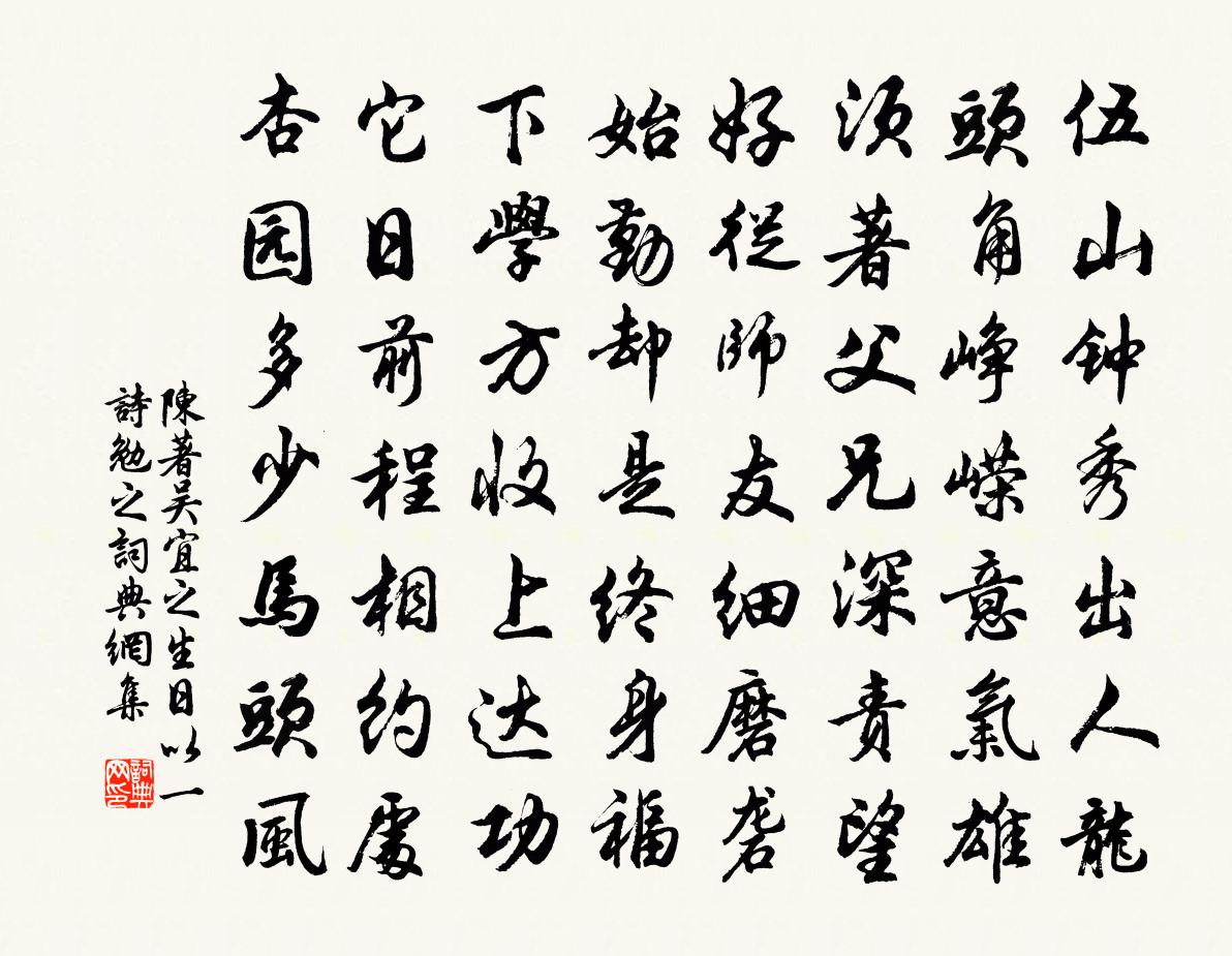 詩詞名句歷史字典書法欣賞書法字典國語詞典說文解字康熙字典古漢語字典標 題 作 者 詩 句 吳宜之生日以一詩勉之作者:陳著 朝代:宋代吳宜之生日以一詩勉之原文伍山鍾秀出人龍,頭角崢嶸意氣雄。須著父兄深責望,好從師友細磨礱。始勤卻是終身福,下學方收上達功。它日前程相約處,杏園多少馬頭風。詩詞問答問:吳宜之生日以一詩勉之的作者是誰?答:陳著問:吳宜之生日以一詩勉之寫於哪個朝代?答:宋代陳著吳宜之生日以一詩勉之書法欣賞吳宜之生日以一詩勉之書法作品詩詞推薦悼古薛逢〔唐代〕細推今古事堪愁,貴賤同歸土一丘。漢武玉堂人豈在,石家金谷水空流。光陰自旦還將暮,草木從春又到秋。閒事和蘇翰林題李甲畫雁二首晁補之〔宋代〕畫寫物外形,要物形不改。詩傳畫外意,貴有畫中態。我今豈見畫,觀詩雁真在。尚想高郵間,湖寒沙璀璀。冰霜宮詞·新樣梳妝巧趙佶〔宋代〕新樣梳妝巧畫眉,窄衣纖體最相宜;一時趨向多情遠,小閣幽窗靜弈棋。衰病白居易〔唐代〕老與病相仍,華簪發不勝。行多朝散藥,睡少夜停燈。祿食分供鶴,朝衣減施僧。性多移不得,郡政謾如繩。宣州雜詩二十首梅堯臣〔宋代〕傳道零陵守,茲亭暫解裝。分群同雁鶩,幾日到瀟湘。班竹思虞舜,赬萍憶楚王。殷勤吏部句,今亦誦無忘。秋菊李廌〔宋代〕春花富紅紫, * 與秋宜。風勁幽香怯,露曦寒艷滋。孤標雖獨步,呈秀此何遲。欲待群芳歇,專榮占一時。和南安余宰題翠陰亭致爽軒二首黃公度〔宋代〕碩勢揖孤峙,交柯藏伯勞。日臨公館寂,人與此軒高。對酒屢中聖,題詩應仆騷。喬林思舊隱,咫尺聽風號。即事施樞〔宋代〕暝色分煙上遠峰,雨聲斷處又晴風。寶香羞冷閒情遠,落盡薔薇一架紅。次韻郭方叔諸公借胡致堂賞梅至夜賦詩魏了翁〔宋代〕玄陰作秋冬,殺氣寓風雪。土深候蟲閉,山靜飛鳥絕。誰知無邊春,萬古長不滅。或暢然以舒,或凝然以結。或聚題烏程簿廳浮玉亭七首袁說友〔宋代〕浮屠高直一溪雲,水面渾如鏡面分。此景正緣高士得,不然何以獨輸君。焚衣街楊修〔宋代〕短頭金縷又珠胎,煙緒香雲晝不開。御路傍人皆歡息,逡巡紅焰作青灰。東山渡次胡汲古韻林景熙〔宋代〕客來持酒灑煙霏,空想高風意欲飛。老洞藏雲安石臥,孤舟載雪子猷歸。一川白鳥自來去,千古青冊無是非。欲上同君俞、季永步至普濟寺,晚泛西湖以歸,得楊萬里〔宋代〕西湖雖老為人容,不必花時十里紅。卷取郭熙真水墨,枯荷折葦小霜風。送太學顏明經及第東歸鄭谷〔唐代〕平楚干戈後,田園失耦耕。艱難登一第,離亂省諸兄。樹沒春江漲,人繁野渡晴。閒來思學館,猶夢雪窗明。梅花十絕方岳〔宋代〕竹緣貨殖比封君,松愛微官不避秦。至竟羞與噲等伍,歲寒誰障瘐公塵。正月初四日聽新樂成絕句張鎡〔宋代〕嗚嗚胡笛鷓鴣聲,三疊鳴獸舞袖輕。燈市花村舊歡醉,如今自厭邈無情。憶江南弟孟郊〔唐代〕白首眼垂血,望爾唯夢中。筋力強起時,魂魄猶在東。眼光寄明星,起來東望空。望空不見人,江海波無窮。衰老觀音詩釋契適〔宋代〕水精盤躍錦鱗魚,悶於淵沉海岸居。秀世竹鳴金鸑鷟,觀空波涌玉蟾蜍。輕明纓絡垂身後,重疊芙蓉襯足初。曾向嘉泰昭陽大淵獻築室董孝君祠之西下有湖焉某楊簡〔宋代〕惜也天然一段奇,如何萬古罕人知。只今煙水平軒檻,觸目無非是孝慈。傷華發羅隱〔唐代〕舊國迢迢遠,清秋種種新。已衰曾軫慮,初見忽沾巾。日薄梳兼懶,根危鑷恐頻。青銅不自見,只擬老他人。名句推薦人散市聲收,漸入愁時節。劉克莊《生查子·元夕戲陳敬叟》 思來江山外,望盡煙雲生。張九齡《秋晚登樓望南江入始興郡路》 今日不為,明日忘貨。昔之日已往而不來矣。管仲《管子·乘馬》 南山截竹為觱篥,此樂本自龜茲出李頎《聽安萬善吹觱篥歌》 渺萬裡層雲,千山暮雪,隻影向誰去?元好問《摸魚兒·雁丘詞 / 邁陂塘》 偶參伍之驗,以責陳言之實韓非及後人《韓非子·備內》 驚沙獵獵風成陣,白雁一聲霜有信。元好問《玉樓春·驚沙獵獵風成陣》 雪似梅花,梅花似雪。似和不似都奇絕。呂本中《踏莎行·雪似梅花》 梅花雪,梨花月,總相思。張惠言《相見歡·年年負卻花期》 驚風亂颭芙蓉水,密雨斜侵薜荔牆。柳宗元《登柳州城樓寄漳汀封連四州》
