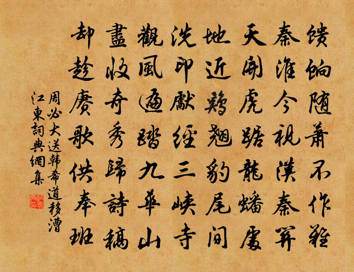 詩詞名句歷史字典書法欣賞書法字典國語詞典說文解字康熙字典古漢語字典標 題 作 者 詩 句 送韓希道移漕江東作者:周必大 朝代:宋代送韓希道移漕江東原文饋餉隨蕭不作難,秦淮今視漢秦關。天開虎踞龍蟠處,地近雞翹豹尾間。洗印先經三峽寺,觀風遍踏九華山。盡收奇秀歸詩稿,卻趁賡歌供奉班。詩詞問答問:送韓希道移漕江東的作者是誰?答:周必大問:送韓希道移漕江東寫於哪個朝代?答:宋代周必大送韓希道移漕江東書法欣賞送韓希道移漕江東書法作品詩詞推薦朝中措(辛丑重陽日,劉守招飲石龍亭,追錄)韓元吉〔宋代〕危亭崛起臥蒼龍。絕景畫圖中。便作龍山高會,千年樂事能同。使君宴處,丹楓影澹,黃花香濃。不惜歸鞍照月,太常引 暮行李齊賢〔元代〕棲鴉去盡遠山青。看暝色、入林*。燈火小於螢。人不見、苔扉半扃。照鞍涼月,滿衣白露,系馬睡寒廳。今夜候老將一首劉克莊〔宋代〕昨解兵符歸故里,耳聽邊事幾番新。偶逢戲下來猶識,欲說遼陽記不真。兒覓寶刀偏愛惜,奴吹蘆管輒悲辛。夜寒鶯穿柳長筌子〔元代〕乘桴默契。便休休倦役,結茅歸里。一任貔貅威鎮,虎韜熊略,旌麾爭起。赳赳成何濟。只贏得、玉顏先弊。覆手苦熱夜李覯〔宋代〕熒熒背明燈,黯黯垂疏帷。階庭豈不好,蚊蟲苦相期。壞扇無清風,暗樹多斜枝。屈指山泉侶,寂寥空所思。又和春日即事洪皓〔宋代〕淹留逢地僻,將老惜韶光。齒與青春暮,愁隨白日長。尋芳無處問,對酒有時狂。漫學樊遲圃,空登子反床。霏霏瓊花王月浦〔宋代〕蕃釐觀里瓊花樹,天地中間第一花。此種從何探原委,春風無處著繁華。千須簇蝶圍清馥,九萼聯珠異眾葩。幾見方太君生日項安世〔宋代〕金鴨煙青蠟炬紅, * 山上勸春風。乍寒還暖花無數,似缺疑圓桂欲中。八十又三人所羨,雙曈如潦壽難窮。七千石殿丞通判濮州楊億〔宋代〕龍虎游從分不疏,忽聞新命佐魚符。經旬苦雨淹行旆,幾曲洪河貫郡圖。浮蟻酒濃頻舉白,折膠風勁好彎弧。賢侯聲無哀樂論嵇康〔兩漢〕有秦客問於東野主人曰:「聞之前論曰:『治世之音安以樂,亡國之音哀以思。』夫治亂在政,而音聲應之;故哀鷓鴣天元好問〔金代〕十步宮香出繡簾。惱人簾底月纖纖。五花驕馬垂楊渡,孤負仙郎側帽檐。秋澹澹,酒厭厭。新詩和恨入香奩。相思秋芸有春綠范成大〔宋代〕秋芸有春綠,疏籬照孤芳。清霜早晚至,何草能不黃?寧當念衰落,政爾事容光。及時且自好,來日殊未量。二十八日雪二十九日未已賦詩凡五首趙蕃〔宋代〕霰集瓦跳鳴,風橫窗竹聲。陰來由有漸,落地勢難平。龍具愁終夜,鶉衣起遲明。兒時故狂甚,老境只寒生。題廣化寺阿育王塔黃康弼〔宋代〕齊野非吳渚,支郎是子陵。釣台千古月,寶塔萬年燈。次韻海棠方岳〔宋代〕暖酣翠袖倚清妍,露洗輕紅待舉鞭。嬌懶不知春二月,風流堪聘晉諸賢。天生富貴家何在,花有神仙譜未編。誰鎖送嚴童子項安世〔宋代〕鳳歷開新統,鵷鶵孤異姿。入朝承重渥,還舍拜名師。楊晏皆模範,韓陳有訓辭。後生須靜實,切莫事賓士。偶題杜牧〔唐代〕甘羅昔作秦丞相,子政曾為漢輦郎。千載更逢王侍讀,當時還道有文章。有懷新筠州揚秘監寄贈八絕兼桂隱茶張鎡〔宋代〕諸子分鑣不待鞭,愈憐肥犬滿人前。何須妙處趨庭說,心學乘閒盡底傳。喜遷鶯(丞相生日)康與之〔宋代〕臘殘春早。正簾幕護寒,樓台清曉。寶運當千,佳辰餘五,嵩岳誕生元老。帝遣阜安宗社,人仰雍容廊廟。盡總道讀李翰林詩陳藻〔宋代〕杜陵尊酒罕相逢,舉世誰堪入此公。莫怪篇篇吟婦女,別無人物與形容。名句推薦中心愿,平虜保民安國。宋江《滿江紅·喜遇重陽》 一尺深紅勝麴塵,天生舊物不如新。溫庭筠《南歌子詞二首 / 新添聲楊柳枝詞》 長亭路,年去歲來,應折柔條過千尺。周邦彥《蘭陵王·柳》 養弟子如養閨女,最要嚴出入,謹交遊。洪應明《菜根譚·概論》 賭近盜,淫近殺。馮夢龍《警世通言·卷三十五》 望望不見君,連山起煙霧。李白《金鄉送韋八之西京》 笑綠鬟鄰女,倚窗猶唱,夕陽西下。蔣捷《女冠子·元夕》 寒食時看郭外春,野人無處不傷神。雲表《寒食詩》 萬帳穹廬人醉,星影搖搖欲墜。納蘭性德《如夢令·萬帳穹廬人醉》 喧鳥覆春洲,雜英滿芳甸。謝朓《晚登三山還望京邑》
