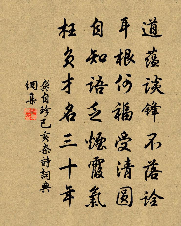 詩詞名句歷史字典書法欣賞書法字典國語詞典說文解字康熙字典古漢語字典標 題 作 者 詩 句 已亥雜詩 263作者:龔自珍 朝代:清代已亥雜詩 263原文道蘊談鋒不落詮,耳根何福受清圓。自知語乏煙霞氣,枉負才名三十年。詩詞問答問:已亥雜詩 263的作者是誰?答:龔自珍問:已亥雜詩 263寫於哪個朝代?答:清代問:龔自珍的名句有哪些?答:龔自珍名句大全龔自珍已亥雜詩 263書法欣賞已亥雜詩 263書法作品詩詞推薦送誠上人釋道璨〔宋代〕長安城頭秋日黃,長安道上秋風涼。遊子念親從定起,一衲捲雲歸故鄉。七月八月吳楚路,十里五里東南疆。遙知滿庭芳 示眾王丹桂〔元代〕*正清油,重羅白面,如牙細米舂淘。精嚴辦供,庖饌列珍餚。虔屬恪香點靜,頻作禮、豈憚劬勞。惟求望,見存水仙花篇徐璣〔宋代〕成陣風作車,宓妃波為茵。良夕忽會過,明月寒鋪銀。環佩凌秋空,笙簫亦具陳。何以慰寥廓,樂此相知新。採珠暢師同玉上人游茅草仇遠〔宋代〕上人家海上,喜從名山游。昔聞三茅君,隱在千峰頭。霜寒草木瘦,歲晚泉石幽。不見梁丘伯,使我心悠悠。題老悟畫卷四首裘萬頃〔宋代〕吏隱三年楚水頭,每隨鳧雁杙扁舟。歸來喜色驚鄰里,分得瀟湘一片秋。去春達善分碧桃移植篆畦今春已作蕊達善前有舒岳祥〔宋代〕春衫露染玉肌寒,來自於闐植小園。欲寄平安無好句,不如來此共憑欄。再韻魏了翁〔宋代〕文化滅質甚塵土,物慾戕生劇豺虎。三年掛舌坐林皋,日月往來雲散聚。夫容自與詩腸謀,雖無顏色媚塗陬。夢隨五言玩初月重遊聯句顏真卿〔唐代〕春溪與岸平,初月出谿明。 ——張薦璧彩寒仍潔,金波夜轉清。 ——李崿孤光遠近滿,練色往來輕。 ——顏卜運算元(嘲二十八兄)陳著〔宋代〕風急雁聲高,露冷蛩吟切。枕剩衾寒不耐煩,長是傷離別。望得眼兒穿,巴得心頭熱。且喜重陽節又來, * 花先臨江仙 示眾尹志平〔元代〕自對千差無可取,心閒一境堪憑。真常不昧穀神清。群魔從此滅,一點自圓成。物外清吟唯獨樂,人間寵辱何驚。張安道樂全堂蘇軾〔宋代〕列子御風殊不惡,猶被莊生譏數數。步兵飲酒中散琴,於此得全非至樂。樂全居士全於天,維摩丈室空翛然。平生停雲 其三陶淵明〔魏晉〕東園之樹,枝條載榮。競用新好,以招余情。人亦有言,日月於徵,安得促席,說彼平生。賈生王安石〔宋代〕漢有洛陽子,少年明是非。所論多感概,自信肯依違。死者若可作,今人誰與歸。應須蹈東海,不但涕沾衣。題雲月圖王灼〔宋代〕菩薩岩前淨滿月,神女峰上光明雲。吾人肺腑中流出,詩句丹青無半分。至後十日雪中觀梅楊萬里〔宋代〕小樹梅花徹夜開,侵晨雪片趁花回。即非雪片催梅發,卻是梅花喚雪來。琪樹橫枝吹腦子,玉妃乘月上瑤台。世間次仲禹迓叔禹西歸韻二首洪咨夔〔宋代〕坡潁風流幾許年,依然夜雨落花邊。白頭故媼斧忘轑,紅頰諸孫衣解牽。聚雁沙平江百折,養鵝水暖柳三眠。行廚漵浦縣鄧夢授主簿惜日軒曾幾〔宋代〕羲和窗鞭白駒,秋日淒已短。向來曬窗地,欲作炙背暖。鄧侯開西軒,棗下歌纂纂。前山隱半規,悵望支手版。我春遊釋文珦〔宋代〕風和宿雨晴,幽屨出柴荊。好鳥各相語,野花如有情。心閒何用隱,身健豈須名。今日不行樂,真成孤此生。古梅遺張時可樓鑰〔宋代〕枝封蒼蘚澹花疎,一種風流高更孤。試問約齋三百樹,林中還有此枝無。自嘲司馬光〔宋代〕英名愧終賈,高節謝巢由。直取雲山笑,空為簪組羞。浮沉乖俗好,隱顯拙身謀。惆悵臨清鑒,霜毛不待秋。名句推薦何處飛來林間鵲,蹙踏松梢微雪。辛棄疾《賀新郎·把酒長亭說》 驚鳥去無際,寒蛩鳴我傍。馬戴《楚江懷古三首》 山致其高而雲雨起焉,水致其深而蛟龍生焉,君子致其道而德澤流焉。文子《文子·卷六·上德》 雲邊雁斷胡天月,隴上羊歸塞草煙。溫庭筠《蘇武廟》 朝聞遊子唱離歌,昨夜微霜初渡河。李頎《送魏萬之京》 君子恥不修,不恥見污。荀子《荀子·非十二子》 香霧雲鬟濕,清輝玉臂寒。杜甫《月夜》 睡里消魂無說處。覺來惆悵消魂誤。晏幾道《蝶戀花·夢入江南煙水路》 唯有門前鏡湖水,春風不改舊時波。賀知章《回鄉偶書二首》 都緣自有離恨,故畫作遠山長。歐陽修《訴衷情·眉意》