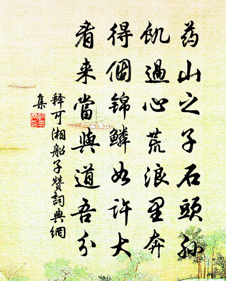 詩詞名句歷史字典書法欣賞書法字典國語詞典說文解字康熙字典古漢語字典標 題 作 者 詩 句 船子贊作者:釋可湘 朝代:宋代船子贊原文藥山之子石頭孫,飢過心荒浪里奔。得個錦鱗如許大,看來當與道吾分。詩詞問答問:船子贊的作者是誰?答:釋可湘問:船子贊寫於哪個朝代?答:宋代釋可湘船子贊書法欣賞船子贊書法作品詩詞推薦次韻子瞻過淮見寄兼簡孫奕職方三首蘇轍〔宋代〕龜山昔同到,松竹故依然。紅印封鹹豉,黃罌分井泉。青天攜杖處,晚日落帆偏。無限相思意,新詩句句傳。惜梅滕岑〔宋代〕牧孺樵童不管風,亂攀曾不比荊榛。那知立馬江南客,一萼真香淚一巾。送故人歸魯韓翃〔唐代〕魯客多歸興,居人悵別情。雨餘衫袖冷,風急馬蹄輕。秋草靈光殿,寒雲曲阜城。知君拜親後,少婦下機迎。嘉熙四年九月奉詔改明年元為淳佑閏十二月降岳珂〔宋代〕我生淳熙間,今復見淳佑。粵從發覆額,及此已衰耇。恭惟孝皇聖,是時方在宥。兩宮俱萬年,薄海同一候。四時癸丑記顏劉克莊〔宋代〕放逐歸來寂寞濱,顛毛雪色麵皮皴。怪奇昔有觀邕者,老醜今無看玠人。一枕喚回將覺夢,三薰惜取已來身。繡裳和仲明舉幽居郭印〔宋代〕薄游心已倦,幽築興何長。夜雨千畦菊,春風五畝桑。雞豚還自樂,人我亦相忘。黃卷皆吾友,何憂日面牆。汪運乾餉酒方岳〔宋代〕長須手拿一壺酒,問識浣花工部無。蓑笠荷鋤煙雨外,再三不信是耕夫。長洲趙嘏〔唐代〕扁舟殊不系,浩蕩路才分。范蠡湖中樹,吳王苑外雲。悲心人望月,獨夜雁離群。明發還驅馬,關城見日曛。贈薛東湖牟巘五〔宋代〕抱疴蓬廬下,白日背我馳。我生已如此,天命復奚疑。句釋惠崇〔宋代〕山色臨巴迥,江流入漢清。頌古八首釋道印〔宋代〕霹靂未收聲,閃電不留影。三更月到窗,半夜驢覷井。快騎駿馬驟高樓,一塵不動須彌頂。四安道中所見牟巘五〔宋代〕分明路入茶山去,喚起昏昏嗜睡翁。共笑翁來已差晚,珍芽秀甲老秋風。隋堤秦韜玉〔唐代〕種柳開河為勝游,堤前常使路人愁。陰埋野色萬條思,翠束寒聲千里秋。西日至今悲兔苑,東波終不反龍舟。遠山總管徐侯和余梅百詠輒課七言一章以答來貺劉克莊〔宋代〕作者肩摩似堵牆,君侯殿後獨軒昂。攙先太皞露訊息,笑殺書生泥色香。能令曹瞞兵渴止,誰雲開府□腸剛。騷壇臘月二十八日馮時行〔宋代〕晷景餘三日,憂愁盡一年。酒侵新歲熟,花待故枝妍。鄰里多遺饋,庖廚有盛煙。擁爐風雪順,春意欲相先。太平山讀書寄城中諸友趙師秀〔宋代〕野人無別事,故得坐空林。黃卷還鋪日,青蓮未悟心。鐸音山殿靜,螢影石池深。不敢邀芳屣,因閒儻一尋。寄僧尚顏裴說〔唐代〕曾居五老峰,所得共誰同。才大天全與,吟精楚欲空。客來庭減日,鳥過竹生風。早晚搖輕拂,重歸瀑布中。招鶴所詞為澉浦監稅趙潛夫作葛紹體〔宋代〕君之來兮鶴自九皋,駕以去兮渺天地而逍遙。縞衣玄裳兮橫大海之驚濤,雲旗先驅兮霓旌旖旎。月皓皓兮風灑灑,閨情效香奩體黃庚〔宋代〕淚浣香腮粉未乾,相思成病 * 。此 * 向琵琶訴,整得琵琶又倦彈。詠梅張九成〔宋代〕策馬尋梅過小橋,江邊驛路正迢迢。靈均清勁余騷雅,夷甫風姿墮寥寥。半吐暗驚雲插月,橫枝忽見雪封條。徘徊名句推薦憶昔花間相見後,只憑縴手,暗拋紅豆。歐陽炯《賀明朝·憶昔花間相見後》 多私者不義,揚言者寡信。戴聖《大戴禮記·文王官人第七十二》 大方無隅;大器晚成;大音希聲;大象無形。老子《老子·德經·第四十一章》 終日兩相思。為君憔悴盡,百花時。溫庭筠《南歌子·倭墮低梳髻》 士雖有學,而行為本焉。墨子《墨子·02章 修身》 君不見,黃河之水天上來,奔流到海不復回。李白《將進酒》 明日近長安,客心愁未闌。納蘭性德《菩薩蠻·白日驚飈冬已半》 後庭花一曲,幽怨不堪聽。劉禹錫《金陵懷古》 寧添一斗,莫添一口。佚名《增廣賢文·上集》 一輪秋影轉金波,飛鏡又重磨。辛棄疾《太常引·建康中秋夜為呂叔潛賦》