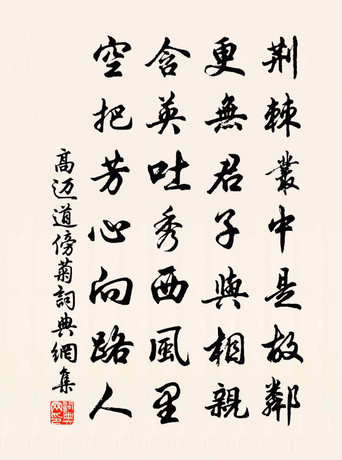 詩詞名句歷史字典書法欣賞書法字典國語詞典說文解字康熙字典古漢語字典標 題 作 者 詩 句 道傍菊作者:高邁 朝代:宋代道傍菊原文荊棘叢中是故鄰,更無君子與相親。含英吐秀西風裡,空把芳心向路人。詩詞問答問:道傍菊的作者是誰?答:高邁問:道傍菊寫於哪個朝代?答:宋代高邁道傍菊書法欣賞道傍菊書法作品詩詞推薦再用韻汪莘〔宋代〕長恨無人共一杯,直知好友自天來。淵明到死真成菊,和靖平生卻是梅。夫人輓詞二首郭印〔宋代〕孌彼閨房秀,泠然玉雪容。月簫難擇對,石窌侈疏封。涵泳詩書習,扶持扇枕供。三荊方擢秀,雲壑臥雙松。再疊仇遠〔宋代〕雪溪漁隱者,郊島是前身。乍見猶疑傲,相逢不說貧。鶴招窮處士,梅伴老詩人。時共論文酒,衰顏少借春。玉胡蝶(王忠州家席上作)陸游〔宋代〕倦客平生行處,墜鞭京洛,解佩瀟湘。此夕何年,來賦宋玉高唐。繡簾開、香塵乍起,蓮步穩、銀燭分行。暗端相草堂即事杜甫〔唐代〕荒村建子月,獨樹老夫家。霧裡江船渡,風前徑竹斜。寒魚依密藻,宿鷺起圓沙。蜀酒禁愁得,無錢何處賒。近聞諸山例關堂石門老偶煮黃精以詩為寄次韻李彌遜〔宋代〕束縛齋魚書掩關,長鑱斸雪草泥間。竹爐石鼎甘香賸,分與衰翁地病顏。次韻蒲大受書懷十首郭印〔宋代〕世業工看卷,天資拙治生。吏曹容小隱,廩祿代深耕。痛飲中賢聖,高吟適性情。妻孥隨我慣,自不厭藜羹。念奴嬌曾紆〔宋代〕片帆暮落,正前村梅蕊,愁人如雪。東陌西溪長記得,疏影橫斜時節。六出冰姿,玉人微步,笑里輕輕折。蘭房沈夜冷李商隱〔唐代〕樹繞池寬月影多,村砧塢笛隔風蘿。西亭翠被余香薄,一夜將愁向敗荷。和同年張季良少卿饋家釀韻三首袁說友〔宋代〕六十衰頹愧鬢蓬,黃花更負一年中。白衣誰薦紅萸酒,吸盡殘荷碧玉筒。感秋書事李中〔唐代〕宦途憔悴雪生頭,家計相牽未得休。紅蓼白蘋訊息斷,舊溪煙月負漁舟。阮郎歸米友仁〔宋代〕碧溪風動滿文漪。雨餘山更奇。淡煙橫處柳行低。鴛鴦來去飛。人似玉,醉如泥。一枝隨鬢猗。夷猶雙槳月平西。一夕大風偶成呈諸兄簡士修思遠王洋〔宋代〕狂飈一夜撼天關,徹曉陽烏勢未還。早恨餘寒夸老健,重憐新物損朱顏。強留殘火如相別,已典春衣不可攀。料得已亥雜詩 312龔自珍〔清代〕古愁莽莽不可說,化作飛仙忽奇闊。江天如墨我飛還,折梅不畏蛟龍奪。滿江紅(壽胡漕·六月初一)劉仙倫〔宋代〕夜半天風,吹佩玉、列仙初度。又恰是、人間六月,葉蓂方吐。黃紙除書驚乍到,青氈舊物欣重睹。擁皇華、玉節莫萬安要平題知津閣趙蕃〔宋代〕勢並江磯起,檐因佛屋高。青羅一縈帶,石黛四周遭。謂我其留句,誰知老不豪。蹔來還亟去,豈亦病滔滔。送盧仲舒移家海陵皎然〔唐代〕世故多離散,東西不可嗟。小秦非本國,楚塞復移家。海島無鄰里,鹽居少物華。山中吟夜月,相送在天涯。贈吳琴士會龍方回〔宋代〕古琴口歌兮手弦,今琴何為兮不然。今人作詩動千篇,不弦不歌兮無傳。關雎麟趾留遺編,離騷以來諸吟仙。我每鴛鴦湖棹歌 之九十九朱彝尊〔清代〕歸人萬里望邱為,白酒黃壺瓠作卮。 來往棹歌無不可,西溪東泖任吾之。偶書范成大〔宋代〕出處由人不系天,痴兒富貴更求仙。東家就食西家宿,世事何緣得兩全。名句推薦驚塞雁,起城烏,畫屏金鷓鴣。溫庭筠《更漏子·柳絲長》 桐葉落,蓼花殘。雁聲天外寒。張淑芳《更漏子·秋》 孤帆遠影碧空盡,唯見長江天際流。李白《黃鶴樓送孟浩然之廣陵》 故人西辭黃鶴樓,煙花三月下揚州。李白《黃鶴樓送孟浩然之廣陵》 宿醉離愁慢髻鬟,六銖衣薄惹輕寒,慵紅悶翠掩青鸞韓偓《浣溪沙·宿醉離愁慢髻鬟》 非君子不可與語變。王通《中說·卷七·述史篇》 桃花仙人種桃樹,又摘桃花換酒錢。唐寅《桃花庵歌》 善學者盡其理,善行者究其難。荀子《荀子·大略》 恨鐵不成鋼曹雪芹《紅樓夢·第九十六回》 缺月掛疏桐,漏斷人初靜。蘇軾《卜運算元·黃州定慧院寓居作》