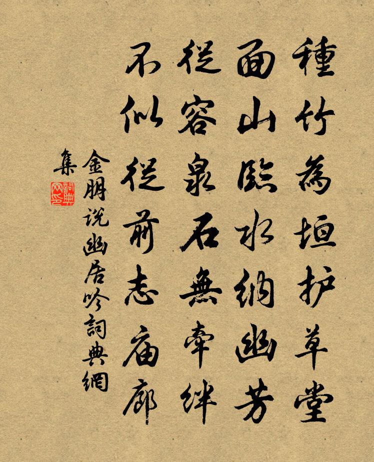 詩詞名句歷史字典書法欣賞書法字典國語詞典說文解字康熙字典古漢語字典標 題 作 者 詩 句 幽居吟作者:金朋說 朝代:宋代幽居吟原文種竹為垣護草堂,面山臨水納幽芳。從容泉石無牽絆,不似從前志廟廊。詩詞問答問:幽居吟的作者是誰?答:金朋說問:幽居吟寫於哪個朝代?答:宋代金朋說幽居吟書法欣賞幽居吟書法作品詩詞推薦江上散縱白玉蟾〔宋代〕欲曉江頭杖策徐,一峰西去眾峰趨。不知林里猶僧寺,少立忽聞敲木魚。游橘洲齊己〔唐代〕春日上芳洲,經春蘭杜幽。此時尋橘岸,昨日在城樓。鷺立青楓杪,沙沈白浪頭。漁家好生計,檐底系扁舟。睡起陸游〔宋代〕老怯年華速,閒知晝漏長。已回酣枕夢,未過古匜香。洗面宮眉綠,開茶帶胯方。山家風味在,雖病意差強。喜雨二首吳潛〔宋代〕雷使巡行遍五方,夾秋不怕旱為殃,人閒祥瑞三伏雨,枕上吟喔終夕涼。已卜晚青催出穗,且將早赤急舂糧,有司德壽春帖子八首曹勛〔宋代〕捲簾康壽麗朝曦,經卷龍香晝漏遲。閒暇瑤琴成雅奏,和風吹入萬年枝。梅州第六十六文天祥〔宋代〕樓角凌風迥,孤城隱霧深。萬事隨轉燭,秋光近青岑。寄答參寥五首張耒〔宋代〕我生為文章,與眾常不偶。出其所為詩,不笑即嘲詬。少年勇自辯,盛氣爭可否。年來知所避,不敢出諸口。時時贈適庵冊工文天祥〔宋代〕本是儒家子,學為方外事。此身恨鳧短,有意求蟬蛻。猶留鼎餘藥,還授人間世。從君臥山中,共談弘景秘。枕上陸游〔宋代〕呼兒 * 上門關,怕冷貪眠自笑孱。月色橫分窗一半,秋聲正在樹中間。暮年不復樽前樂,浮世無如枕上閒。鏈句抱膝仇遠〔宋代〕抱膝坐終日,澹然忘是非。縱令官未滿,已與世相違。古道平蕪合,誰家新燕歸。年荒煙火歇,空老一山薇。和人二首張耒〔宋代〕臘殘春近獨消魂,殘雪長安千萬門。青鳥何曾寄音信,碧雲剛解報黃昏。春詞方岳〔宋代〕剪得春詞不忍看,雨深怕近碧闌乾。春無些力吹成雪,未必杏花能耐寒。抵豫章趙文〔宋代〕泊舟豫章城,黑潦滿道周。街衢未改昔,故舊罕所留。行投學子廬,假榻得小休。燈前作家書,豈為兒女謀。戒之過真陽峽六首楊萬里〔宋代〕玉削雙崖一水通,一重一掩更重重。平生山水看多少,最愛真陽第二峰。幽居即事八首趙蕃〔宋代〕雨壓藤架半倒,草荒支徑新鋤。尚有詩翁入社,未妨俗子回車。李工部江南轉運楊億〔宋代〕含香五字客,尚齒十年兄。舊奏梁園賦,新題漢柱名。出驅星使傳,入佐地官征。獻可方前笏,分憂又抗旌。富饒年老吟邵雍〔宋代〕歲華頭上不能驚,唯有交親眼更明。皓皓月常因坐看,深深酒不為愁傾。苟於心上無先覺,卻似人間小後生。欲約蝶戀花彭元遜〔宋代〕微雨燒香余潤氣,新綠愔愔,乳燕相依睡。無復捲簾知客意,楊花更欲因風起。舊夢蒼茫雲海際。強作歡娛,不覺游東林寺黃滔〔唐代〕長生猶自重無生,言讓仙祠佛寺成。碑折誰忘康樂制,山靈表得遠公名。松形入漢藤蘿短,僧語離經耳目清。莫怪鳥散余花落竇洵直〔唐代〕晚樹春歸後,花飛鳥下初。參差分羽翼,零落滿空虛。風外清香轉,林邊艷影疏。輕盈疑雪舞,仿佛似霞舒。萬片名句推薦一切賢聖,皆以無為法而有差別。鳩摩羅什譯《金剛經·無得無說》 門外子規啼未休,山村落日夢悠悠。陳與義《送人歸京師》 泛樓船兮濟汾河,橫中流兮揚素波。劉徹《秋風辭》 千里黃雲白日曛,北風吹雁雪紛紛。高適《別董大二首》 香霧雲鬟濕,清輝玉臂寒。杜甫《月夜》 照野瀰瀰淺浪,橫空隱隱層霄。蘇軾《西江月·頃在黃州》 雨過一蟬噪,飄蕭松桂秋。杜牧《題揚州禪智寺》 長記曾攜手處,千樹壓、西湖寒碧。姜夔《暗香·舊時月色》 中原事業如江左,芳草何須怨六朝。納蘭性德《秣陵懷古·山色江聲共寂寥》 今孝子之為親度也,將奈何哉?墨子《墨子·22章 節用(下)》