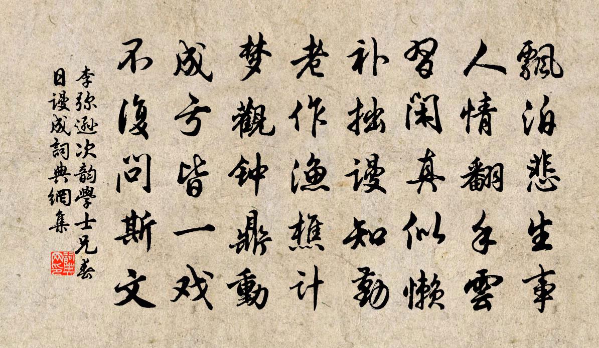 詩詞名句歷史字典書法欣賞書法字典國語詞典說文解字康熙字典古漢語字典標 題 作 者 詩 句 次韻學士兄春日謾成作者:李彌遜 朝代:宋代次韻學士兄春日謾成原文飄泊悲生事,人情翻手雲,習閒真似懶,補拙謾知勤。老作漁樵計,夢觀鐘鼎動。成虧皆一戲,不復問斯文。詩詞問答問:次韻學士兄春日謾成的作者是誰?答:李彌遜問:次韻學士兄春日謾成寫於哪個朝代?答:宋代李彌遜次韻學士兄春日謾成書法欣賞次韻學士兄春日謾成書法作品詩詞推薦錢史君見贈元夕新什次韻答之李壁〔宋代〕元夕風光付濕薪,更堪門外雨如塵。千枝寶炬知何處,一寸清愁苦傍人。落紙驚蛇空妙墨,中庭獨鶴漫閒身。青藜題兩黃仙人煉丹山頂一絕蘇籀〔宋代〕絲毫觸石千山澤,喙吻傳聲萬壑雷。信有蘇書標洞府,不應俗駕半途回。偈頌七十六首釋師觀〔宋代〕滿眼覷不見,地得一以寧。君王得一天下治,衲僧得一眼橫鼻直。皇恩佛恩,一時報畢。枕肱軒釋可湘〔宋代〕全向放倒恣憨痴,肘臂分明曲向誰。更要夢中重說夢,我無木枕可來推。和答葉無咎孫應時〔宋代〕百年一夢欲誰何,底事容心強揣摩。便續淵明歸去引,不題工部醉時歌。故山已恐鶴相怨,陋巷何妨雀可羅。多謝雨村韓偓〔唐代〕雁行斜拂雨村樓,簾下三重幕一鉤。倚柱不知身半濕,黃昏獨自未回頭。全州雙松堂黃庭堅〔宋代〕文殊堂下松,永日如鳴琴。我登雙松堂,時步雙松陰。中有寂莫人,安禪無古今。喜雨五首劉克莊〔宋代〕點點沃枯焦,聲聲伴寂寥。五更初聽雨,千載後聞韶。楞伽經陳藻〔宋代〕若向他經義已詳,此難成句也何妨。昔人誤點經文會,更不回頭狥故常。普照詩張嵲〔宋代〕欲雨春嵐重,微風松韻清。泊舟古觀下,臥聽山鳥聲。行樂愜幽步,訪僧舒遠情。仙翁遯世久,岩壑自崢嶸。丹灶夜遊宮馬鈺〔元代〕識破塵勞苦。苦樂清閒,恣情歌舞。有似孤雲來又去。沒牽纏,得逍遙,內自補。日夜調龍虎。時時奼嬰相聚。養行廊曾極〔宋代〕負矢前驅敵未擒,虎侯高揭意何深。文皇決拾精天下,偏愛良工辨木心。蕪城賦鮑照〔南北朝〕沵迆平原,南馳蒼梧漲海,北走紫塞雁門。柂以漕渠,軸以昆崗。重關復江之隩,四會五達之莊。當昔全盛之時,聞蝶文天祥〔宋代〕北來追騎滿江濱,那更元戎按劍嗔。不是神明扶正直,淮頭何處可安身。夢中詠西湖蘇轍〔宋代〕誰鑿西湖十里中,肩舟載酒揚輕風。草木蕃滋百事足,寒暄淡薄四時同。東鄰適與吾廬便,西岸遙將嶽麓通。閒遊擬西北有高樓吳泳〔宋代〕高樓可岧嶢,一柱西北隅。橫當子午道,峻直參井墟。曲瓊卷飛霞,儼儼仙人居。上通三重階,下蔭十二衢。傍樓食雞頭楊萬里〔宋代〕龍宮失曉惱江妃,也養鳴雞報早暉。要啄稻梁無半粒,只教滿頷飽珠璣。題澤翁小巷王柏〔宋代〕石護山溪口,溪溪自有原。若非江海量,曷受百川奔。酒寄郭祥正鄭獬〔宋代〕第一荊州白玉泉,蘭舟載與酒中仙。卻須捉住鯨魚尾,恐怕醉來騎上天。牡丹詩十首宋白〔宋代〕風排香陣拂瑤墀,御苑新晴爛漫時。十五素娥羞水色,三千紅面洗胭脂。宮腰暎酒思輕舞,檀口偎牋欲詠詩。鐵石名句推薦白日放歌須縱酒,青春作伴好還鄉。杜甫《聞官軍收河南河北》 少小離家老大回,鄉音無改鬢毛衰。賀知章《回鄉偶書二首·其一》 天油然作雲,沛然下雨,則苗浡然興之矣。孟子《孟子·梁惠王章句上·第六節》 寒氣先侵玉女扉,清光旋透省郎闈。李商隱《對雪二首》 取之非易,守之尤艱;智不足弗得,謀有失竟患,死生事也。來俊臣《羅織經·控權卷第四》 物格而後知至,知至而後意誠,意誠而後心正,心正而後身修,身修而後家齊,家齊而後國治,國治而後天下平。曾子《禮記·大學》 烹羊宰牛且為樂,會須一飲三百杯。李白《將進酒》 十輪霜影轉庭梧,此夕羈人獨向隅。晏殊《中秋月》 興盡晚回舟,誤入藕花深處。李清照《如夢令·常記溪亭日暮》 春風不解禁楊花,蒙蒙亂撲行人面。晏殊《踏莎行·小徑紅稀》