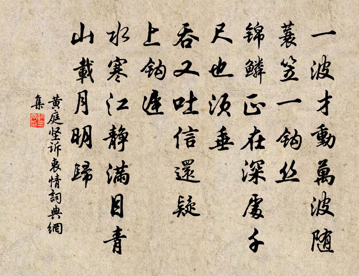 “一波才動萬波隨,蓑笠一鉤絲 ”,這是幅寒江獨鉤圖,一碧萬頃,波花粼粼,有孤舟蓑笠翁,浮游其上,置身天地之間,垂釣於重淵深處 ,鉤入水動,波紋四起,環環相隨。這樣空靈灑脫的境界令人逸懷浩氣 。“金鱗”二句寫垂釣之興:魚翔深底,沉淪不起,為取水下金鱗 ,漁翁不惜垂絲千尺。此時此刻,漁父專注一念,神智空明,似乎正感受到水下之魚盤旋於釣鉤左右的情態。“吞又吐,信還疑 ,上鉤遲”,這一虛設之筆描繪了漁翁閉目凝神,心與魚游的垂鉤之樂,在這種快樂中,漁父舉目江天山水,忽然得道忘魚。末三句皴染出一幅空靈澄澈的江漁歸晚圖:“水寒江靜,滿目青山,載月明歸 。”透射出一種置身江天、脫落塵滓的逍遙追求,突出漁父在這樣一種澄靜澹遠的境界裡,任漂泊而不問其所至,也正是自張志和至黃庭堅所立志以求的最高境界。