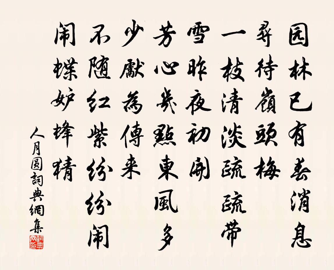 詩詞名句歷史字典書法欣賞書法字典國語詞典說文解字康熙字典古漢語字典標 題 作 者 詩 句 人月圓作者:佚名 朝代:宋代人月圓原文園林已有春訊息,尋待嶺頭梅。一枝清淡,疏疏帶雪,昨夜初開。芳心幾點,東風多少,先為傳來。不隨紅紫,紛紛鬧鬧,蝶妒蜂猜。詩詞問答問:人月圓的作者是誰?答:佚名問:人月圓寫於哪個朝代?答:宋代問:人月圓是什麼體裁?答:詞問:佚名的名句有哪些?答:佚名名句大全佚名人月圓書法欣賞人月圓書法作品詩詞推薦舟過三丫河王之道〔宋代〕搖落蒹葭浦,荒涼雁鶩村。吳柑迎齒冷,魯酒著顏溫。水澀風還逆,天寒日自暾。不堪歸思亂,鳥鵲鬧黃昏。汴州離亂後憶韓愈、李翱孟郊〔唐代〕會合一時哭,別離三斷腸。殘花不待風,春盡各飛揚。歡去收不得,悲來難自防。孤門清館夜,獨臥明月床。忠直題所書黃庭經後(泥金正書)景審〔唐代〕金粉為書重莫過,黃庭舊許右軍多。請看今日酬恩德,何似當年為愛鵝。醉落魄(元夕)陳三聘〔宋代〕東風寒絕。江城待得花枝發。欲知此夜碧天闊。秋晚日少陵原游山泉之什楊發〔唐代〕喧濁侵肌性未沈,每來雲外恣幽尋。塵衣更喜秋泉潔,倦跡方依竹洞深。暫過偶然應系分,有期終去但勞心。唯憐夜飲李商隱〔唐代〕卜夜容衰鬢,開筵屬異方。燭分歌扇淚,雨送酒船香。江海三年客,乾坤百戰場。誰能辭酩酊,淹臥劇清漳。送王左丞五絕蔡肇〔宋代〕歲晏風落木,野 * 增波。齋舲如傅翼,一舉君謂何。句蘇壽〔宋代〕戴笠披蓑軍十萬,飢嗔飽喜客三千。五月四日賀楊秘書知吉州五十韻項安世〔宋代〕自識楊夫子,於今十二年。甲辰來右淛,丁未向西川。逆旅初聞譽,摳衣亟致虔。未能情款款,已覺志拳拳。不謂池鶴八絕句。鳶贈鶴白居易〔唐代〕君夸名鶴我名鳶,君叫聞天我戾天。更有與君相似處,飢來一種啄腥膻。上元日聽太清宮步虛張仲素〔唐代〕仙客開金籙,元辰會玉京。靈歌賓紫府,雅韻出層城。磬雜音徐徹,風飄響更清。紆餘空外盡,斷續聽中生。舞鶴沁園春侯善淵〔元代〕太一先天,昊境虛皇,無上至尊。鎮玉霄宮殿,群仙聚會,香雲羅列,光射殷紅。玉獸金麟,白鶴引駕,寶蓋瓊花相和歌辭飛來雙白鶴虞世南〔唐代〕飛來雙白鶴,奮翼遠凌煙。雙棲集紫蓋,一舉背青田。颺影過伊洛,流聲入管弦。鳴群倒景外,刷羽閬風前。映海雜曲歌辭春遊曲三首張仲素〔唐代〕煙柳飛輕絮,風榆落小錢。蒙蒙百花里,羅綺競鞦韆。騁望登香閣,爭高下砌台。林間踏青去,席上意錢來。行樂已亥雜詩 7龔自珍〔清代〕廉鍔非關上帝才,百年淬厲電光開。先生宦後雄談減,悄向龍泉祝一回。寄傲軒蘇軾〔宋代〕先生英妙年,一掃千兔禿。仕進固有餘,不肯踐場屋。通闤何所傲,傲名非傲俗。定知軒冕中,享榮不償辱。豈無燈下小酌陸游〔宋代〕江湖雙鬢禿,宇宙一身窮,酒浪搖輕碧,燈花落碎紅。交情元易見,春事半成空。尚覬身強健,煙畦擷芥菘。玩槿花羊士諤〔唐代〕何乃詩人興,妍詞屬舜華。風流感異代,窈窕比同車。凝艷垂清露,驚秋隔絳紗。蟬鳴復蟲思,惆悵竹陰斜。伯益以玉舟相酬酢席上口占二絕劉學箕〔宋代〕新年殊未有吟搜,美酒醺人不自由。多謝主人情意厚,玉舟三度轉船頭。楞伽經注帖贊岳珂〔宋代〕貝多之葉來金仙,益以注釋非忘言。楞伽著在西域編,名雖或訛經則傳。唐世經生筆力便,茲文流布今幾年。河南名句推薦江淮度寒食,京洛縫春衣。王維《送綦毋潛落第還鄉 / 送別》 憑高眺遠,見長空萬里,雲無留跡。蘇軾《念奴嬌·中秋》 那作商人婦,愁水復愁風。李白《長干行二首》 歌中醉倒誰能恨,唱罷歸來酒未消。晏幾道《鷓鴣天·小令尊前見玉簫》 因可勢,求易道。韓非及後人《韓非子·觀行》 今年春淺臘侵年。冰雪破春妍。蘇軾《一叢花·今年春淺侵年》 對朝雲靉靆,暮雨霏微,亂峰相倚。黃庭堅《醉蓬萊》 長安陌上無窮樹,唯有垂楊綰別離。劉禹錫《楊柳枝詞九首》 白日麗飛甍,參差皆可見。謝朓《晚登三山還望京邑》 花徑不曾緣客掃,蓬門今始為君開。杜甫《客至》