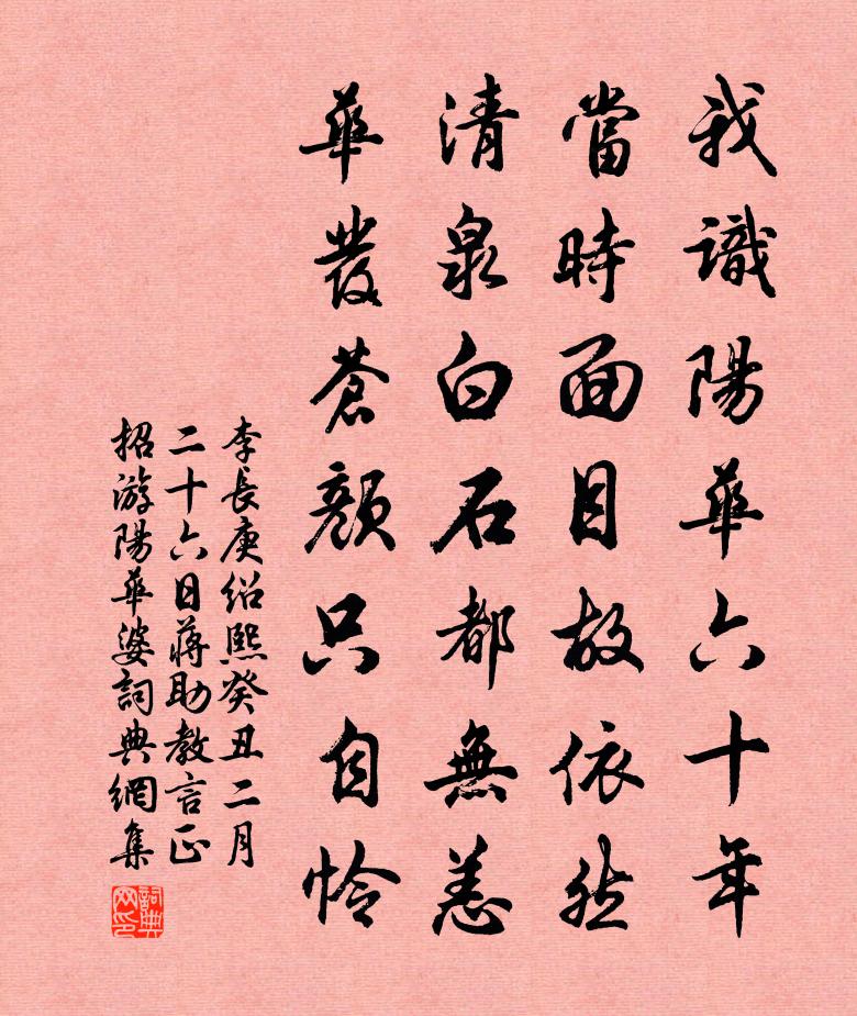 詩詞名句歷史字典書法欣賞書法字典國語詞典說文解字康熙字典古漢語字典標 題 作 者 詩 句 紹熙癸丑二月二十六日蔣助教言正招游陽華婆作者:李長庚 朝代:宋代原文我識陽華六十年,當時面目故依然。清泉白石都無恙,華發蒼顏只自憐。詩詞問答問:《紹熙癸丑二月二十六日蔣助教言正招游陽華婆》的作者是誰?答:李長庚問:該詩寫於哪個朝代?答:宋代書法欣賞紹熙癸丑二月二十六日蔣助教言正招游陽華婆書法作品詩文賞析【原題】:紹熙癸丑二月二十六日蔣助教言正招游陽華婆娑岩下薄暮乃歸得詩五絕以紀其事詩詞推薦河坐戲書鄭剛中〔宋代〕窗前寒雨正無邊,案上含花燭影偏。莫念江湖家萬里,一杯徑醉且高眠。秋興宋祁〔宋代〕遙夕何曾寐,孤懷有為憂。謀多真逗撓,師老但誅求。朔霧摩邊壘,羌風殷戰枹。吾生誠用寡,嘆罷只搔頭。寄張守仲思十首陳造〔宋代〕相從軟語說睽離,起我清譚更好詩。別後憂虞今痛定,未須細誦悼亡辭。道裝吟邵雍〔宋代〕道家儀用此衣巾,只拜星辰不拜人。何故堯夫須用拜,安知人不是星辰。觀音大士贊釋智遇〔宋代〕寶瓶翠柳常隨手,又向青蓮葉上行。五濁世中無垢染,不須慈眼視眾生。向秀徐鈞〔宋代〕心慕莊書善說玄,發明奇趣理昭然。世人竊取公遺論,卻把前言作己言。麼趙秉文〔元代〕乘興兩三甌,揀溪山好處追游。但教有酒身無事,有花也好,無花也好,選甚春秋。無漏子 景金本注云,三首本名更漏子 樂道丘處機〔元代〕去年禾,今歲麥。陸地如雲充塞。豐稔世,太平年。黎民各坦然。眾心安,閒客易。到處逍遙無事。昏告宿,餒求八聲甘州佚名〔宋代〕漸紛紛、木葉下亭皋,秋容際寒空。慶屏山南畔、龜游綠藻,鶴舞青松。縹緲非煙非霧,喜色有無中。簾幕金風細偈頌一百零二首釋紹曇〔宋代〕六用門頭,力戰爭奪,鑰殺賊陣雲橫。群魔竄入藕絲孔,竟挽天河洗甲兵。凌煙閣就,汗血功成。高枕圓蒲塵夢破水調歌頭姬翼〔元代〕端坐懶成癖,雲水興何加。襟懷洗盡塵物,別有好生涯。選甚瀛洲仙闕,鬧市花街柳陌,觸處是光華。切莫問龍虎次韻荼槱二絕洪咨夔〔宋代〕愛春留得瓊英在,添竹扶將翠蔓高。更著金沙相間種,主人四壁錦周遭。漁歌李彭〔宋代〕掌握千差都照破。石霜這漢難關鎖。水出高源酬佛陀。哩棱邏。須彌作舞虛空和。早秋白玉蟾〔宋代〕店遠雞聲近,月斜人影長。再三謝風露,拜賜一天涼。沁園春 贈鄭伯洪 強村叢書用大典藥房樵唱本吳景奎〔元代〕谷□仙田,瑤草誰栽,山中子真。向紫霞洞裡,鑿開丹室,素華台上,瞻望飆輪。王子吹笙,洪崖握手,爛醉桃花移使鄂州,次峴陽館懷舊居劉長卿〔唐代〕多慚恩未報,敢問路何長。萬里通秋雁,千峰共夕陽。舊遊成遠道,此去更違鄉。草露深山裡,朝朝落客裳。雜曲歌辭秋夜曲張仲素〔唐代〕丁丁漏水夜何長,漫漫輕雲露月光。秋壁暗蟲通夕響,寒衣未寄莫飛霜。二月詞張耒〔宋代〕滾風畫幕長廊靜,簾下人眠初日永。嚶嚶不動採花蜂,夜來露重薔薇冷。芳草長時寒食天,紅牆低處見鞦韆。人家雕陂黃庭堅〔宋代〕雕陂之水清且泚,屈為印文三百里。呼船載過七十餘,褰裳亂流初不記。竹輿嶇埡山徑涼,僕姑呼婦聲相倚。篁中郁孤台金君卿〔宋代〕鱗鱗萬瓦繞雲根,環列諸峰勢獨尊。屹若靈鰲浮海面,儼如謀將立轅門。贛流東匯龍蛇走,崆阜南來虎豹蹲。乘月名句推薦見侮而不鬥,辱也!公孫龍《公孫龍子·跡府》 常將有日思無日,莫把無時當有時。佚名《增廣賢文·上集》 湘西一杯酒,渺渺紅葉換。趙蕃《次韻酬吳德夫去秋送行之作》 兒童見說深驚訝,卻問何方是故鄉。殷堯藩《同州端午》 美人慵翦上元燈,彈淚倚瑤瑟。朱敦儒《好事近·春雨細如塵》 霧柳暗時雲度月,露荷翻處水流螢。張元乾《浣溪沙·山繞平湖波撼城》 明年此會知誰健?醉把茱萸仔細看。杜甫《九日藍田崔氏莊》 黃雲隴底白雲飛,未得報恩不能歸。李頎《古意》 乘興南遊不戒嚴,九重誰省諫書函。李商隱《隋宮》 逕直夫何細!橋危可免扶?楊萬里《寒食上冢》