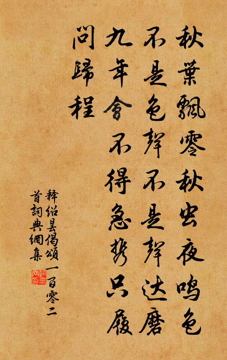 詩詞名句歷史字典書法欣賞書法字典國語詞典說文解字康熙字典古漢語字典標 題 作 者 詩 句 偈頌一百零二首作者:釋紹曇 朝代:宋代偈頌一百零二首原文秋葉飄零,秋蟲夜鳴。色不是色,聲不是聲。達磨九年會不得,急攜只履問歸程。詩詞問答問:偈頌一百零二首的作者是誰?答:釋紹曇問:偈頌一百零二首寫於哪個朝代?答:宋代釋紹曇偈頌一百零二首書法欣賞偈頌一百零二首書法作品詩詞推薦巫山曲孟郊〔唐代〕巴江上峽重複重,陽台碧峭十二峰。荊王獵時逢暮雨,夜臥高丘夢神女。輕紅流煙濕艷姿,行雲飛去明星稀。目極偈頌一百六十首釋宗杲〔宋代〕今朝又風起,鬧處莫插觜。觸著閻羅王,帶累陰司鬼。次韻倪巨濟春懷李若水〔宋代〕青衫一領縛閒身,飽識官街肥馬塵。昨日友生雙鯉至,怪人不憶故溪春。春懷十首汪莘〔宋代〕神遊何邊方,夢到迷處所。論世非秦漢,辨地豈吳楚。碧桃翳陽林,翠霞蔭清渚。鵾雞鳴化間,鸞鶴將儔侶。中有輞川集二十首竹里館裴迪〔唐代〕來過竹里館,日與道相親。出入唯山鳥,幽深無世人。寺齋睡起二首黃庭堅〔宋代〕小黠大痴螳捕蟬,有餘不足夔憐蚿。退食歸來北窗夢,一江風月桃李船。賦順適堂葉茵〔宋代〕暗觸闊陵機,茅居峙竹扉。安時貧亦樂,聞道詠而歸。鳧鶴從長短,鳶魚自躍飛。吾猶臧谷耳,夷跖是耶非。六立二首答陳天驥長短句劉克莊〔宋代〕天孫機上刀尺,雪兒口裡宮商。愧我元非郢客,恨君不識秦郎。重到臨淮壽聖院張耒〔宋代〕陳跡不可訪,舊遊三十年。相逢非故物,大半已沉泉。世界揚塵海,浮生不繫船。老人無固必,醉即掩篷眠。道中即事方岳〔宋代〕沖雨衝風莫管渠,晨炊蓐食便巾車。能無幾日到茅舍,睡到日高相折除。冬夜楊億〔宋代〕香街鼓絕暝煙深,簷近孤釭射宿禽。露井銀床霜氣冷,瑣窗珠網月華侵。初沉遠籟聞疏漏,旋拂流塵撫素琴。坐久六橋春望王鎡〔宋代〕美人嬌醉落花鈿,船載笙歌出柳邊。春滿六橋調馬路,香風飄趁玉絲鞭。鷓鴣天佚名〔宋代〕寶炬金蓮一萬條。火龍圍輦轉州橋。月迎仙仗回三殿,風遞韻音下九霄。登復道,聽鳴鞘。再頒酥酒賜臣僚。太平初成遺老齋待月軒藏書室三首其一遺老齋蘇轍〔宋代〕老人身世兩相遺,綠竹青松自蔽虧。已喜形骸今我有,枉將名字與人知。往還但許鄰家父,問訊才通說法師。燕坐初起李商隱〔唐代〕想像鹹池日欲光,五更鐘後更迴腸。三年苦霧巴江水,不為離人照屋樑。虎山湯仲友〔宋代〕虎是何年踞,名存跡已亡。塔從林外出,山向寺中藏。池暗生寒氣,台空夕供陽。更無人弔古,來只為春茫。晨光次季承韻趙蕃〔宋代〕薄霧收殘雨,疏雲漏曉暾。泥行從上下,歸近得欣奔。近作要重錄,舊書仍再溫。平生屏居趣,畢世願衡門。題葉靖逸東庵周端臣〔宋代〕一庵自隱古城邊,不是山林不市塵。落月半窗霜滿屋,臥聽宰相去朝天。偈頌一百五十首釋心月〔宋代〕八月初一,好個訊息。積雨報初晴,新涼生八極。禾稻滿田疇,催人早收拾。一顆顆,一粒粒,宜愛惜,莫教遍地送李益之侍郎致政歸廬山司馬光〔宋代〕儒業金華貴,歸心白鶴孤。江山依舊在,軒冕曏來無。嘯詠誰當共,登臨未索扶。浩然如此樂,迥與世人殊。名句推薦靈山多秀色,空水共氤氳。張九齡《湖口望廬山瀑布泉 / 湖口望廬山瀑布水》 可惜流年,憂愁風雨,樹猶如此!辛棄疾《水龍吟·登建康賞心亭》 上善若水,水善利萬物而不爭。老子《老子·道經·第八章》 夜寒微透薄羅裳,無限思量。秦觀《畫堂春·春情》 腸斷月明紅豆蔻,月似當時,人似當時否?納蘭性德《鬢雲松令·枕函香》 香幃風動花入樓,高調鳴箏緩夜愁。王昌齡《青樓怨》 泥融飛燕子,沙暖睡鴛鴦。杜甫《絕句二首》 都道是金玉良姻,俺只念木石前盟。曹雪芹《終身誤》 營州少年厭原野,狐裘蒙茸獵城下。高適《營州歌》 威加海內兮歸故鄉,安得猛士兮守四方劉邦《大風歌》
