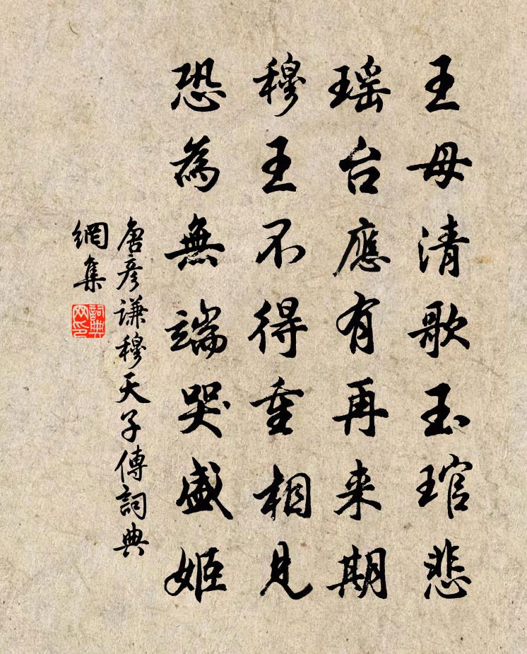 詩詞名句歷史字典書法欣賞書法字典國語詞典說文解字康熙字典古漢語字典標 題 作 者 詩 句 穆天子傳作者:唐彥謙 朝代:唐代穆天子傳原文王母清歌玉琯悲,瑤台應有再來期。穆王不得重相見,恐為無端哭盛姬。詩詞問答問:穆天子傳的作者是誰?答:唐彥謙問:穆天子傳寫於哪個朝代?答:唐代問:穆天子傳是什麼體裁?答:七古唐彥謙穆天子傳書法欣賞穆天子傳書法作品注釋全唐詩:卷672-6詩詞推薦題開聖寺李涉〔唐代〕宿雨初收草木濃,群鴉飛散下堂鍾。長廊無事僧歸院,盡日門前獨看松。摸魚子 賦玉簪錄呈趙太初兼與時中茂異姚燧〔元代〕更休尋、玉山瑤草,蓬萊知在何處。司花嫌被春風妒。留待九秋清露。還解語。試問著、當時月夜乘鸞女。何年遺長發佚名〔先秦〕浚哲維商,長發其祥。洪水芒芒,禹敷下土方。外大國是疆,幅隕既長。有娀方將,帝立子生商。玄王桓撥,受小西原晚望白居易〔唐代〕花菊引閒行,行上西原路。原上晚無人,因高聊四顧。南阡有煙火,北陌連虛墓。村鄰何蕭疏,近者猶百步。吾廬水林檎花鄭谷〔唐代〕一露一朝新,簾櫳曉景分。艷和蜂蝶動,香帶管弦聞。笑擬春無力,妝濃酒漸醺。直疑風起夜,飛去替行雲。昨日雪已佳約李令希孝晁補之〔宋代〕昨日雪已佳,今日雨亦好。冰膚解萬木,洗濯見枯槁。思君對此坐,孤詠廢幽討。明日尚相期,春禽聽清曉。題楊解元壽萱堂二首王炎〔宋代〕濟濟斑衣子,怡怡白髮親。紫萱偏得地,玉樹解留春。出真陽峽十首楊萬里〔宋代〕峽中出了又逢灘,破浪牽船分外難。只是峽山臨欲別,此灘留我再看山。寄江東道友章碣〔唐代〕野亭歌罷指西秦,避俗爭名興各新。碧帶黃麻呈縹緲,短竿長線弄因循。夜潮分卷三江月,曉騎齊驅九陌塵。可惜周氏東山草堂翁卷〔宋代〕城隅古謝村,博士草堂存。唯見煙霞起,全無市井喧。鵲來巢木末,龜出戲蒲根。消得吟詩客,憑欄看幾番。句張釜〔宋代〕傲雪凌風太瘦生。荊門寄沈彬齊己〔唐代〕罷趨明聖懶從知,鶴氅褵褷遂性披。道有靜君堪托跡,詩無賢子擬傳誰。松聲白日邊行止,日影紅霞里夢思。珍重過柘溪得西字劉黻〔宋代〕晴雨春無定,東風忽轉西。地肥桑眼大,天暖麥須齊。食頓尋幽所,舟行畏惡溪。野禽如避客,飛上半山啼。花蕊夫人故宅二首汪元量〔宋代〕千古風流一夢中,江山閱盡幾英雄。芙蓉城裡家何在,花蕊夫人宅已空。李花李復〔宋代〕桃花爭紅色空深,李花淺白開自好。立日含青意澀縮,今晨碎玉亂高杪。暖風藉助開更多,余陰鬱芘花還少。天晴攝鼓院任希夷〔宋代〕分曹正在壁門東,兼假猶慚兩院通。諫鼓無聲誰訟枉,匭函有疏為平戎。柳分御路曉煙碧,花繞宮牆初日紅。退食東山避暑用轆轤體陸游〔宋代〕避暑穿林隨所之,一奴每負胡床隨。望秋槁葉有先隕,未暮赫日無餘暉。輪囷離奇澗松古,勾輈格磔蠻禽悲。北岩舟中讀書宋琬〔清代〕久拋青簡束行幐,白鳥蒼蠅甚可憎。身是蠹魚酬夙債,黃河浪里讀書燈。送張仲良二首韓元吉〔宋代〕客里親朋別,詩成僧黯然。春風動花柳,歸路繞雲煙。共絕過門盜,俱無使鬼錢。生涯知底許,訊息幸頻傳。追憶征西幕中舊事陸游〔宋代〕關輔遺民意可傷,蠟封三寸絹書黃。亦知虜法如秦酷,列聖恩深不忍忘。名句推薦攀出牆朵朵花,折臨路枝枝柳。關漢卿《一枝花·不伏老》 獨往獨來,獨出獨入,孰能礙之?列子及其弟子《列子·力命》 別來半歲音書絕,一寸離腸千萬結。韋莊《應天長·別來半歲音書絕》 四月清和雨乍晴,南山當戶轉分明。司馬光《客中初夏》 對此懷素心,千里共明月德隱《新秋晚眺》 焦首朝朝還暮暮,煎心日日復年年。曹雪芹《紅樓夢·第二十二回》 相馬失之瘦,相士失之貧。司馬遷《史記·滑稽列傳》 未信此情難系絆,楊花猶有東風管。蘇軾《蝶戀花·蝶懶鶯慵春過半》 深宮桃李無人問,舊愛玉顏今自恨。元好問《玉樓春·驚沙獵獵風成陣》 望處雨收雲斷,憑闌悄悄,目送秋光。柳永《玉蝴蝶·望處雨收雲斷》