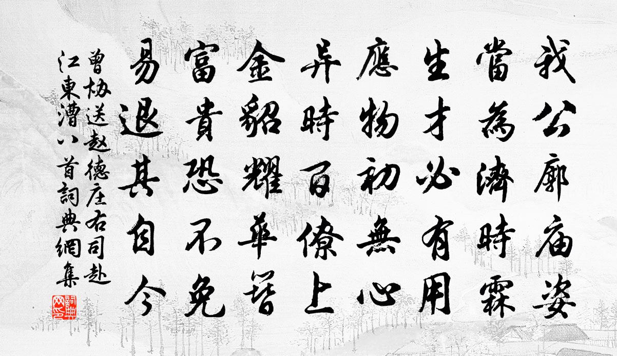 詩詞名句歷史字典書法欣賞書法字典國語詞典說文解字康熙字典古漢語字典標 題 作 者 詩 句 送趙德莊右司赴江東漕八首作者:曾協 朝代:宋代送趙德莊右司赴江東漕八首原文我公廓廟姿,當為濟時霖。生才必有用,應物初無心。異時百僚上,金貂耀華簪。富貴恐不免,易退其自今。詩詞問答問:送趙德莊右司赴江東漕八首的作者是誰?答:曾協問:送趙德莊右司赴江東漕八首寫於哪個朝代?答:宋代曾協送趙德莊右司赴江東漕八首書法欣賞送趙德莊右司赴江東漕八首書法作品詩詞推薦同吳仲退周南翁登法雲寺志上人流玉閣黎廷瑞〔宋代〕偶與幽人期,頗愜滄洲趣。嵐影倒虛碧,天光澹晴素。煙橫雙鷺起,水落孤帆度。憑闌足清眺,隱几得玄悟。顧茲滿江紅秦觀〔宋代〕風雨蕭蕭,長途上、春泥沒足。謾回首、青山無數,笑人勞碌。山下粉粉梅落粉,渡頭淼淼波搖綠。想小園、寂寞似史和甫傳清陳著〔宋代〕翩翩鶴往還,高眼看塵寰。家世崔盧上,風流晉宋閒。開門種桃李,落筆動江山。勳業時來做,青春贏得閒。真武贊陳長方〔宋代〕北方之神非此形,世俗強為圖其真。天一生水罔與冥,草玄揚運送知彼。和陳生三首胡寅〔宋代〕掛卻衣冠把釣綸,那知藏拙未全真。餘生意態無相顧,未死工夫有自新。弦絕誰傳流水曲,瑟希曾對舞雩春。晚交十二月初七日述懷張九成〔宋代〕謫居寂寞歲將闌,几案凝塵酒盞乾。落落雨聲檐外過,愔愔雪意座中寒。孤飛隻影人誰念,萬里長途心自安。世事村醪二尊獻張平陽蘇軾〔宋代〕張公高躅不可到,我欲挽肩才覺難。事業已歸前輩錄,典刑留與後人看。詩如琢雪清牙頰,身覲飛龍吐膽肝。少負送唐稟正字歸萍川齊己〔唐代〕霜須芸閣吏,久掩白雲扉。來謁元戎後,還騎病馬歸。煙村蔬飲淡,江驛雪泥肥。知到中林日,春風長澗薇。塞上寄內崔融〔唐代〕旅魂驚塞北,歸望斷河西。春風若可寄,暫為繞蘭閨。行歌四首周文璞〔宋代〕雪壓門外土骨堆,一番兩番春始回。歸來但見鄰舍換,老樹紅花如死灰。商量千古有何事,經營八紘非汝才。乘除感事戴表元〔宋代〕死生契闊強兄弟,南北分張友朋。戰國幾人成漢鬼,劫灰今日信胡僧。翰林身後詩千首,工部丘前米五升。山路陰步虛子令佚名〔宋代〕碧煙籠曉海波閒。江上數峰寒。佩環聲里,異香飄落人間。弭絳節、五雲端。宛然共指嘉禾瑞,開一笑、破朱顏。襄陽古樂府二首襄陽樂蘇轍〔宋代〕誰言襄陽苦,歌者樂襄陽。太守劉公子,千年未可忘。劉公一去歲時改,惟有州南漢水長。漢水南流峴山碧,種稻題山莊小集楊萬里〔宋代〕莫笑山莊小集休,篇篇字字爽於秋。向來楓落吳江冷,一句能銷萬古愁。次韻張太博見貽魏了翁〔宋代〕別後幾如隔世人,閒中認得當年我。清風應傍笑譚來,明月不隨門戶鎖。月窗以所畫觀音見遺為賦一篇喻良能〔宋代〕白衣仙人云海上,肉眼欲看唯想像。月窗道人心孔開,貌得人天行道相。吾聞伯時晚畫佛,妙處不減王摩詰。龍眠庚申季科立春日還鄉公曄置酒孟園從容道舊有李彌遜〔宋代〕孟軒花色璨瓊瑰,倦客隨春此地回。靜院茶甌浮積支,深堂香鴨亂真梅。得閒苦厭紛紜事,畏病難禁瀲灩杯。但掃樊川寒食喻鳧〔唐代〕新松□綠草,古柏翳黃沙。珮珂客驚鳥,綺羅人間花。蹙塵南北馬,碾石去來車。川晚悲風動,墳前碎紙斜。瑞鷓鴣(辛鎮江有長短句,因韻偶成,愧非禹步爾。)韓淲〔宋代〕南蘭陵郡鷓鴣詞。底用登臨更賦詩。貴不能淫非一日,老當益壯未多時。人間天上風雲會,眼底眉前歲月知。只有聲崔塗〔唐代〕歡戚猶來恨不平,此中高下本無情。韓娥絕唱唐衢哭,儘是人間第一聲。名句推薦志之難也,不在勝人,在自勝。韓非及後人《韓非子·喻老》 一樹梨花一溪月,不知今夜屬何人?佚名《雜詩·舊山雖在不關身》 天地生君子,君子理天地。荀子《荀子·王制》 人孰無親,罪人慎察其宗。來俊臣《羅織經·固榮卷第六》 林暗草驚風,將軍夜引弓。盧綸《和張僕射塞下曲·其二》 無半點閒愁去處,問三生醉夢何如。喬吉《折桂令·七夕贈歌者》 人不閒,勿事攪。人不安,勿話擾。李毓秀《弟子規·泛愛眾》 低頭獨長嘆,此嘆無人喻。白居易《買花 / 牡丹》 不義不富,不義不貴,不義不親,不義不近。墨子《墨子·08章 尚賢(上)》 幼敏悟過人,讀書輒成誦。歐陽修《畫地學書》