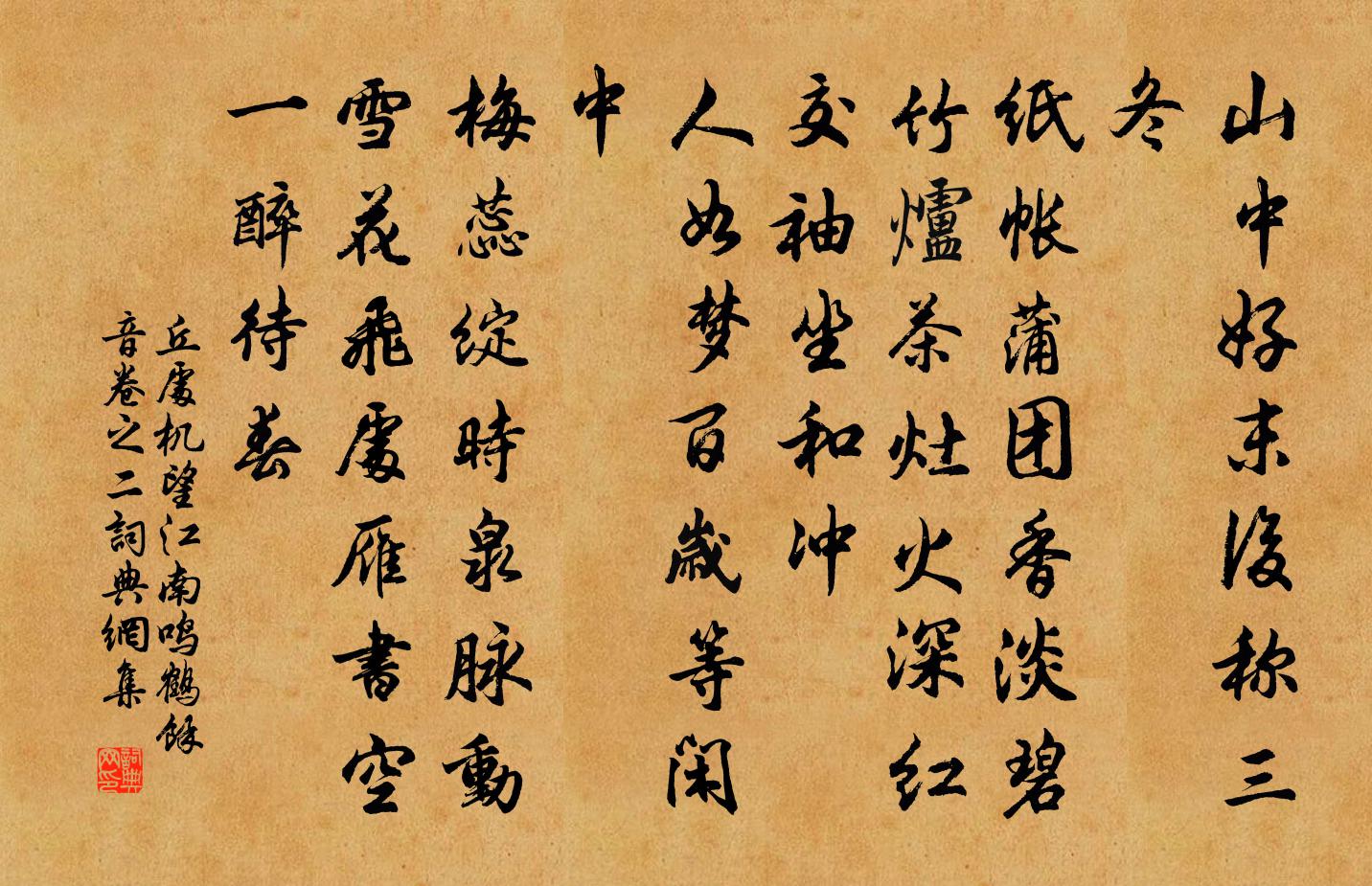 詩詞名句歷史字典書法欣賞書法字典國語詞典說文解字康熙字典古漢語字典標 題 作 者 詩 句 望江南 鳴鶴餘音卷之二作者:丘處機 朝代:元代望江南 鳴鶴餘音卷之二原文山中好,末後稱三冬。紙帳蒲1~1團香淡碧,竹爐茶灶火深紅。交袖坐和沖。人如夢,百歲等閒中。梅蕊綻時泉脈動,雪花飛處雁書空。一醉待春詩詞問答問:望江南 鳴鶴餘音卷之二的作者是誰?答:丘處機問:望江南 鳴鶴餘音卷之二寫於哪個朝代?答:元代問:望江南 鳴鶴餘音卷之二是什麼體裁?答:詞丘處機望江南 鳴鶴餘音卷之二書法欣賞望江南 鳴鶴餘音卷之二書法作品詩詞推薦踏沙行張雨〔元代〕春夢還山,藥羅岩上。覺來便覺身無恙。不知引入市塵壺,丹瓢猶掛蒼龍杖。一脈清涼,三關調暢。□□更展滄溟如夢令譚處端〔元代〕物外遨遊落魄。步步清涼雲腳。閒里弄虛空,別有蓬萊期約。這著。這著。細細人情除削。戲題指紋鬥牛圖謝舉廉〔宋代〕左者前其角,右者後其足,浼君雙指螺,戰此兩觳觫。草長水遠日悠悠,不向桑間自在休。蝸頭尚可屠蠻觸,壁上雨後凝秀閣口占呈子方李處權〔宋代〕鑿石為渠水有聲,四垣惟欠竹青青。壁含霽月光千丈,黛拂雲峰畫一屏。香異定應來絕島,茶甘初不藉中泠。主人西江月侯善淵〔元代〕杖上一瓢春醞,匣中三尺**。眉間寶鑑鎮妖邪。坐守更深半夜。金鼎燒成白雪,玉爐煉就黃芽。丹光瀲灩泛瓊華行宮元稹〔唐代〕寥落古行宮,宮花寂寞紅。白頭宮女在,閒坐說玄宗。西遊李若水〔宋代〕綠暗紅疏春事休,此身孑孑又西遊。不堪回首斜陽外,一片黃雲萬古愁。嘲段成式(一作廣陽公宴)周繇〔唐代〕蹙鞠且徒為,寧如目送時。報仇慚選耎,存想恨逶遲。促坐疑辟咡,銜杯強朵頤。恣情窺窈窕,曾恃好風姿。色授岳陽范綜〔宋代〕萬里山川寬眼界,兩湖風月送天涯。雲通巫峽襄王夢,鵩吊長沙賈誼家。入壬辰新歲宋祁〔宋代〕五十為衰始,仍餘五歲衰。雙眸不明鑑,殘鬢已紛絲。銅虎雖頻剖,荷囊信濫持。何須依老格,先作故山期。題伏龜山北隅徐鉉〔唐代〕茲山信岑寂,陰崖積蒼翠。水石何必多,宛有千岩意。孰知近人境,旦暮含佳氣。池影搖輕風,林光澹新霽。支頤偈頌一百五十首釋心月〔宋代〕與麽來者,過者邊立。不與麽來者,過者邊立。與麽不與麽,花須連夜發,莫待曉風吹。言行吟邵雍〔宋代〕能言未是難,行得始為艱。須是真男子,方能無厚顏。酬吳促庶龍圖終南山司馬光〔宋代〕泰山魯所瞻,終南乃秦望。西侵井絡闊,北壓鶉野曠。條梅韞名材,金玉富珍藏。飄風何烈烈,萬物盡搖盪。屹立暇日約諸友生飯於石泉以講居貧這策樞密富丈李彌遜〔宋代〕一言悟漢祖,千戶遂封婁。士窮必有遇。榮悴交相酬。堂堂張公子,謝事歲幾周。不作折腰態,每懷餬口憂。才華登灌口廟東大樓觀緡江雪山陸游〔宋代〕我生不識柏梁建章之宮殿,安得峨冠侍游宴;又不及身在滎陽京索間,擐甲橫戈夜酣戰。胸中迫隘思遠遊,泝江來風流子吳文英〔宋代〕金谷已空塵。薰風轉、國色返春魂。半敧雪醉霜,舞低鸞翅,絳籠蜜炬,綠映龍盆。窈窕繡窗人睡起,臨砌脈無言東湖四詠陳宓〔宋代〕我作書城東湖,書築堤百餘書丈。水深書才四尺,岸曲八回往。中號小滄洲,拏舟輕蓮盪。回還即數里,淥作三江五日與陳真卿飲梅堯臣〔宋代〕五日逢南國,三年別舊都。招魂傳楚客,撫節見靈巫。蒿艾因時采,蛟龍為俗驅。清樽與鵝炙,忻此故人俱。馬軍自杭至雨少止方回〔宋代〕春盡雨還雨,山寒雲更雲。晝常無日色,夜不見星文。蜂起此狂賊,馬來皆勁軍。尅期可平盡,玉石恐難分。名句推薦將軍角弓不得控,都護鐵衣冷難著。岑參《白雪歌送武判官歸京》 戰戰慄栗,日慎一日,苟慎其道,天下可有。韓非及後人《韓非子·初見秦》 上無威,下生亂。來俊臣《羅織經·治下卷第三》 眾中聞謦欬,未語知鄉里。蘇軾《送金山鄉僧歸蜀開堂》 道人庭宇靜,苔色連深竹。柳宗元《晨詣超師院讀禪經》 挫其銳,解其紛,和其光,同其塵。湛兮,似或存。老子《老子·道經·第四章》 石壕村里夫妻別,淚比長生殿上多。袁枚《馬嵬》 冠蓋滿京華,斯人獨憔悴。杜甫《夢李白二首·其二》 古之史也辯道,今之史也耀文。王通《中說·卷三·事君篇》 紅樓隔雨相望冷,珠箔飄燈獨自歸。李商隱《春雨》
