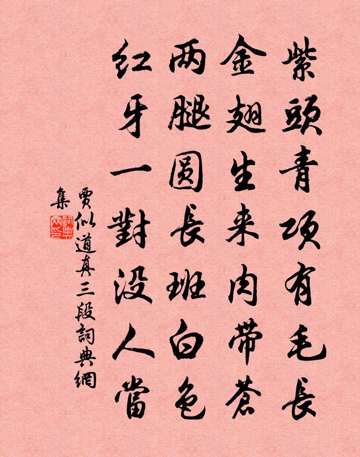 詩詞名句歷史字典書法欣賞書法字典國語詞典說文解字康熙字典古漢語字典標 題 作 者 詩 句 真三段作者:賈似道 朝代:宋代真三段原文紫頭青項有毛長,金翅生來肉帶蒼。兩腿圓長班白色,紅牙一對沒人當。詩詞問答問:真三段的作者是誰?答:賈似道問:真三段寫於哪個朝代?答:宋代賈似道真三段書法欣賞真三段書法作品詩詞推薦清平樂趙汝茪〔宋代〕錦屏香褪。寒隱輕衫嫩。燕子護泥飛不穩。庭掩百花難認。雙雙繡帶微風。海棠此夜簾櫳。愁損一番寒食,小窗淡次韻致遠自毘陵見寄范成大〔宋代〕新詞一闋話羈愁,清似寒泉咽隴頭。官下有誰同此景,仲宣應是獨登樓。永吉院阻雨李新〔宋代〕美人怪我長為客,青雁傳書不肯開。向道在家貧亦好,惡教風雨送歸來。再次韻鄧肅〔宋代〕我聞張微子,仰天能服霧。又聞填海神,揮鞭石欲騖。二子呼不來,登山自糾屨。雷鼓速雲陣,忽忽千岩布。誰雲題館中直舍壁陸游〔宋代〕幾年憔悴去清班,敢辱君恩誤賜環。但厭軟麈隨倦馬,不愁弱水隔神山。下帷寢飯群書里,退食雍容眾雋間。行矣魏文節公墓戴表元〔宋代〕萬騎南來駐不留,衣冠客此鎮林丘。寒岩碎裂從中起,亂水喧嗚竟獨流。故物今惟存寓馬,當年誰為指眠牛。墳旁杜挺之新得知州將出京遺予薪芻豆梅堯臣〔宋代〕魯公馬病不可出,陶令言拙徒扣門。舉家食粥焉用怪,但願漉酒巾常存。長安侏儒勝方朔,水邊潭母哀王孫。王孫禹寺陸游〔宋代〕禹寺荒殘鐘鼓在,我來又見物華新。紹興年上曾題壁,觀者多疑是古人。送張景山知康州鄭獬〔宋代〕遂溪張太守,懇意乞南州。家在白雲下,郡當滄海頭。旌旗瀧水晚,風雨瘴山秋。解卻淮西印,輕為萬里游。宿古寺趙汝鐩〔宋代〕黃昏投寺宿,古屋瞰荒江。村酒沽春瓮,山房耿夜釭。灘高聲撼枕,月落影收窗。僧老人皆玩,樓鍾曉未撞。木蘭花慢姬翼〔元代〕選峰巒佳處,結茅屋,伴蒼松。有藥圃芝田,耕雲釣月,香靄靈風。憑闌將觀寰海,鼓洪濤、千丈接長空。幾度蓬看山寄宋中道梅堯臣〔宋代〕前山不礙遠,斷處吐尖碧。研青點無光,淡墨近有跡。前林橫白雲,復與後嶺隔。孤舟川上人,引望不知夕。安得挽婺女何茂宏陳傅良〔宋代〕勸駕嘗連萼,應門忽二毛。竟於時不偶,吾更晚相遭。宿草堪揮淚,豐碑忍泚毫。送車今幾兩,誰最戀綈袍。浴日亭方信孺〔宋代〕亭倚蓬萊幾許高,下臨無地有驚濤。坡仙想得江山助,八語端為天下豪。論詩五首·其五趙翼〔清代〕詩解窮人我未空,想因詩尚不曾工。熊魚自笑貪心甚,既要工詩又怕窮。雜感陸游〔宋代〕十月可釀酒,六月可作醬,兒曹念乃翁,左右日供養。比鄰有老疾,亦復致一餉;老老以及人,此義古所尚。小重山(學士生日)李彌遜〔宋代〕鞭鳳驂鸞自斗杓。老君親抱送,下層霄。人間仙李占春饒。千秋里,松月伴 * 。故國水雲遙。謫仙丹荔熟,剝紅石竹文同〔宋代〕蜂齧紅蕊爛,蟲啼碧叢短。秋風略地起,惟有蒼苔管。艾師行,贈黃中子楊維楨〔元代〕艾師艾師古中黃,肘有補註明堂方。籠有岐伯神針之海草,篋有軒轅洪爐之燧光。針窠數穴能起死,一百七十銅人別綬老張元乾〔宋代〕無端流落迫殘年,三十南山訪老禪。未契安心了難覓,不如同世且隨緣。頻移竹几負寒日,旋拾松梢炊晚煙。珍重名句推薦人之愛子,罕亦能均;自古及今,此弊多矣。顏之推《顏氏家訓·教子篇》 我見君來,頓覺吾廬,溪山美哉。辛棄疾《沁園春·和吳尉子似》 山重水複疑無路,柳暗花明又一村。陸游《游山西村》 侵夜鸞開鏡,迎冬雉獻裘。李商隱《陳後宮》 故國三千里,深宮二十年。張祜《宮詞·故國三千里》 葉落根偏固,心虛節更高。憨山德清《詠竹五首》 獨立小橋風滿袖,平林新月人歸後。馮延巳《鵲踏枝·誰道閒情拋擲久》 積於不涸之倉者,務五穀也管仲《管子·牧民》 小舟從此逝,江海寄餘生。蘇軾《臨江仙·夜飲東坡醒復醉》 豪華盡成春夢,留下古今愁。康與之《訴衷情令·長安懷古》
