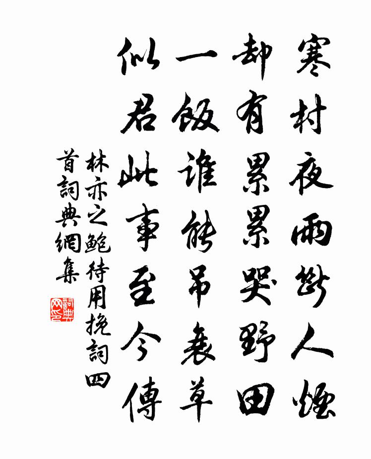 詩詞名句歷史字典書法欣賞書法字典國語詞典說文解字康熙字典古漢語字典標 題 作 者 詩 句 鮑待用輓詞四首作者:林亦之 朝代:宋代鮑待用輓詞四首原文寒村夜雨斷人煙,卻有累累哭野田。一飯誰能吊衰草,似君此事至今傳。詩詞問答問:鮑待用輓詞四首的作者是誰?答:林亦之問:鮑待用輓詞四首寫於哪個朝代?答:宋代林亦之鮑待用輓詞四首書法欣賞鮑待用輓詞四首書法作品詩詞推薦太湖楊備〔宋代〕魚舠載酒日相隨,一笛薦花深處吹。湖面風收雲影散,水天交照碧琉璃。雨歇宋庠〔宋代〕急對乘雲度,涼煙落晚留。山顏紅露日,田尾濁鳴溝。知倦翩翩鳥,來思濕濕牛。東菑聊騁望,偏識種瓜疇。望蓬萊 寄張四秀才王丹桂〔元代〕清河氏,聽取此根原。自昔未逢超岸筏,而今又值下坡年。猶被世情牽。繁華境,虛幻不牢堅。休向夢中重作夢,送清上人歸暨陽釋行海〔宋代〕中分吳越大江流,君自東歸我尚留。煙鎖白楊漁浦晚,風鳴黃葉鳳城秋。窮途散盡三千客,故國難忘十二樓。依舊詠霜葉寄皋羽善父方鳳〔宋代〕秋盡吳江道,丹楓樹樹奇。葉為詩者色,霜乃畫之師。望似醉鄉近,疑猶花事遲。停雲俄在念,倚杖未歸時。秋興陸游〔宋代〕誰敢輕他萬戶侯,一生賦分在滄洲。屋穿況值雨騎月,路惡更堪風打頭!此世極知同逆旅,吾身亦自是懸疣。乞錢留台賓客李公輓辭二首蘇頌〔宋代〕奕世儒纓胄,清朝翰墨臣。裁成五色詔,出擁兩朱輪。柏署分曹佚,銅樓拜命新。如何止中壽,志未展經綸。趙季茂通判惠詩走筆奉和十篇岳珂〔宋代〕天巧與天宜,雕鎪焉用詩。冥鴻吾自愛,隱豹彼何知。牧笛方堪聽,胡笳不奈吹。傷時燭之武,老矣不能為。秋懷六首洪邁〔宋代〕市朝富危機,匹夫死馮河。何如狎鷗子,煙雨同一波。行藏各有趙,不在相詆訶。我師陋巷人,千古冠四科。頌古十六首釋明辯〔宋代〕老鼠齩生鐵,十分滋味別,貓兒左右看,晏唾也不徹。和吳鹽丞雪中湖上訪梅四首楊萬里〔宋代〕七字全勝五字城,清於庾信及鍾嶸。君詩妙絕端何似,不似梅花似麽生。偈頌二十三首釋雲岫〔宋代〕大覺世尊,臘月八夜,字正四刻,睹明星而悟道,引得後代兒孫,夜半染皂。智門昨夜傷風,打嚏湊得恰好。寒食日題杜鵑花曹松〔唐代〕一朵又一朵,並開寒食時。誰家不禁火,總在此花枝。贛縣道中有懷晦庵用江東日暮云為韻作五詩寄趙蕃〔宋代〕我行向可許,貢江與章江。悠悠異所見,俗變服亦龐。定遷本中州,來南已殊邦。況此接荒服,寸心那得降。詠娼婦詩何遜〔南北朝〕曖曖高樓暮。華燭帳前明。羅幃雀釵影。寶瑟鳳雛聲。夜花枝上發。新月霧中生。誰念當窗牖。相望外盈盈。葵花二首劉克莊〔宋代〕下了江南奏凱回,曹公鞅鞅未忘懷。爭知野老門庭冷,旌節無心忽自來。偈頌九十三首釋梵琮〔宋代〕太白禪師,全無伎倆。一錫飛來,占斷千嶂。以中心樹,建立聖像。合水和泥,根生土長。不用換骨脫胎,不須起送弟盧肇〔唐代〕去日家無擔石儲,汝須勤若事樵漁。古人盡向塵中遠,白日耕田夜讀書。聖女祠儲嗣宗〔唐代〕石屏苔色涼,流水繞祠堂。巢鵲疑天漢,潭花似鏡妝。神來雲雨合,神去蕙蘭香。不復聞雙佩,山門空夕陽。除夜自石湖歸苕溪 其六姜夔〔宋代〕沙尾風回一棹寒,椒花今夕不登盤。百年草草都寒夜,自琢春詞剪燭看。名句推薦雪聲偏傍竹,寒夢不離家。戎昱《桂州臘夜》 吳絲蜀桐張高秋,空山凝雲頹不流李賀《李憑箜篌引》 冠必正,紐必結。襪與履,俱緊切。李毓秀《弟子規·謹》 桂花香霧冷,梧葉西風影。高觀國《菩薩蠻·何須急管吹雲暝》 念月榭攜手,露橋聞笛。周邦彥《蘭陵王·柳》 鞭撲之子,不從父之教劉向《說苑·雜言》 其山水揀乳泉、石池漫流者上;其瀑涌湍漱,勿食之。陸羽《茶經·五之煮》 大風起兮雲飛揚。威加海內兮歸故鄉。劉邦《大風歌》 兼相愛,交相利。墨子《墨子·15章 兼愛(中)》 綠池芳草滿晴波,春色都從雨里過。高啟《春暮西園》