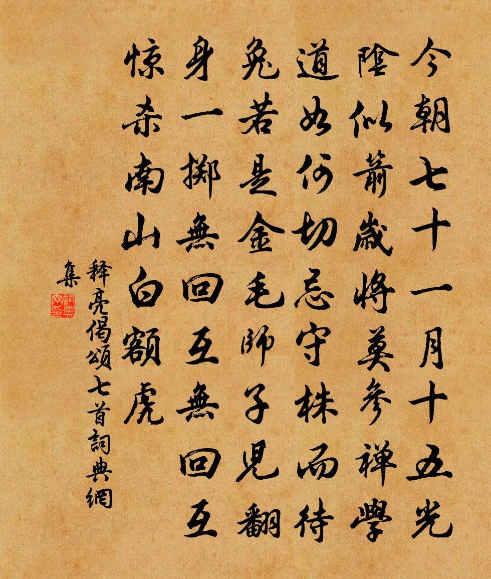 詩詞名句歷史字典書法欣賞書法字典國語詞典說文解字康熙字典古漢語字典標 題 作 者 詩 句 偈頌七首作者:釋亮 朝代:宋代偈頌七首原文今朝七十一月十五,光陰似箭歲將莫。參禪學道如何,切忌守株而待兔。若是金毛師子兒,翻身一擲無回互。無回互。驚殺南山白額虎。詩詞問答問:偈頌七首的作者是誰?答:釋亮問:偈頌七首寫於哪個朝代?答:宋代釋亮偈頌七首書法欣賞偈頌七首書法作品詩詞推薦與賈至舍人於龍興寺剪落梧桐枝望灉湖李白〔唐代〕剪落青梧枝,灉湖坐可窺。雨洗秋山淨,林光澹碧滋。水閒明鏡轉,雲繞畫屏移。千古風流事,名賢共此時。黃陵廟易士達〔宋代〕帝輦南遊竟不還,二妃望斷九疑山。森森萬古祠前竹,猶帶當時粉淚斑。九日登望仙台呈劉明府容崔曙〔唐代〕漢文皇帝有高台,此日登臨曙色開。三晉雲山皆北向,二陵風雨自東來。關門令尹誰能識,河上仙翁去不回。且欲詠醉楊億〔宋代〕劉伶石五斗,康成三百杯。欹斜星弁側,嵬峨玉山頹。人語蜩螗沸,天形帟幕開。應知是狂藥,何不學顏回。上崔十五老丈劉商〔唐代〕天漢乘槎可問津,寂寥深景到無因。看花獨往尋詩客,不為經時謁丈人。三峽橋錢聞詩〔宋代〕生平有志在山水,得紱此邦非偶爾。行行白鹿書院來,小輿竹逕松陰里。輕雷急鼓山前聞,飛梁截截水下噴。有如杜處士新居羅隱〔唐代〕翠斂王孫草,荒誅宋玉茅。寇余無故物,時薄少深交。迸筍穿行徑,飢雛出壞巢。小園吾亦有,多病近來拋。訓子袁說友〔宋代〕投老尋三窟,傳家只一經。呼兒親料理,開卷熟叮嚀。我已頭居白,誰堪芥拾青。頗懷蘭與玉,長憶謝家庭。次韻吳興李行中秀才見寄並求醉眠亭詩二首蘇轍〔宋代〕是非一醉了無餘,唯有胸中萬卷書。已把人生比蘧傳,更將江浦作階除。欲眠賓客從教去,倒臥氍毹豈暇舒。京洛吏隱宜春郡詩十首祖無擇〔宋代〕吏隱宜春郡,鄉園去路賒。間關成客宦,荏苒度年華。出水魚吞餌,辭山鳳在笯。誰言千里隔,夜夜夢吾家。呈審知二首趙蕃〔宋代〕秋風已作重陽雨,客子將回下水船。卒歲褐裘悲破篋,豐年稌黍欠多田。平生漫說詩書學,滿眼不祛兒女煎。頗怪聞角梅堯臣〔宋代〕一聲催客夢,星斗轉西檐。風卷梅花去,愁從柳塞添。馬鳴霜滿鬣,龍泣凍生髯。高樹朝光動,城頭落海蟾。三月十七日以檄出行賑貸旬日而復反自州門至趙蕃〔宋代〕乾溪溪側彈子洞,薄暮過之聊且休。志欲山林成獨往,愧無名姓繼三游。奇奇怪怪乏畫手,鑿鑿磷磷宜枕流。岩岫金剛密跡釋印肅〔宋代〕牙如劍樹目如燈,電爍妖魔法不生。千聖出頭難插足,普庵也道我也能。喜雨口號呈陳守伯固十二首陳造〔宋代〕共說邦君禱雨時,衋如疾痛切膚肌。公心一片秋空月,可但圓通大士知。鹿門夏日皮日休〔唐代〕滿院松桂陰,日午卻不知。山人睡一覺,庭鵲立未移。出檐趁雲去,忘戴白接冪。書眼若薄霧,酒腸如漏卮。身外懷靈山呈元衡趙蕃〔宋代〕故人移住遠,明月掛檐遲。誰復相過語,何從更覓詩。白頭甘斗食,青眼望群兒。想見靈山閣,雲峰夏愈奇。送晏延平宰邑分寧兼過鄉墅宋庠〔宋代〕銅紐腰新綬,鳥衣省故廬。鄉無夜行彥,楹有世藏書。楚潦蘭浮檝,潘園板御輿。蚩蚩吳俗美,庖刃一投虛。清江曲追和魯直韻王之道〔宋代〕鬢邊殘雪幾春秋,自說生來不解憂。晚食得魚吹荻火,秋盤尋筍艤松舟。布裙斗酒不須惡,明月清風且相樂。紫宸賀新郎(送趙伯泳侍郎守溫陵)王邁〔宋代〕憶昔同時召。正青山、親提玉尺,量材廊廟。當日班行比元祐,北玉西珠照耀。一轉首、宮商移調。君自烏台登騎名句推薦老去悲秋強自寬,興來今日盡君歡。杜甫《九日藍田崔氏莊》 人生貴得適意爾,何能羈宦數千里以要名爵!劉義慶《世說新語·識鑒》 綠蓑江上秋聞笛,紅袖樓頭夜倚欄。曹雪芹《香菱詠月·其三》 皮之不存,毛將安傅?左丘明《左傳·僖公·僖公十四年》 天命之謂性;率性之謂道子思《中庸·第一章》 龜言此地之寒,鶴訝今年之雪。庾信《小園賦》 城小賊不屠,人貧傷可憐元結《賊退示官吏》 永憶江湖歸白髮,欲回天地入扁舟。李商隱《安定城樓》 易挑錦婦機中字。難得玉人心下事。劉克莊《玉樓春·戲林推》 凡彼禍難也,先者恆凶,後者恆吉。佚名《黃帝四經·十大經·雌雄節》
