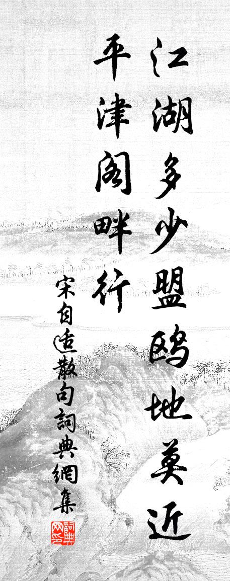 詩詞名句歷史字典書法欣賞書法字典國語詞典說文解字康熙字典古漢語字典標 題 作 者 詩 句 句作者:宋自適 朝代:宋代句原文江湖多少盟鷗地,莫近1-1平津閣畔行。詩詞問答問:句的作者是誰?答:宋自適問:句寫於哪個朝代?答:宋代宋自適句書法欣賞句書法作品詩詞推薦幽居陸游〔宋代〕窮老苦畏事,雅意在丘壑;結茆鏡湖上,卒歲安寂寞。有門常嬾開,壁間掛雙屩。猶恨未遠人,靜夜聞城角。緣識宋太宗〔宋代〕君子淡交如似水,小人交結甘如醴。微窪浪息派分流,倏忽之間生謗毀。但去驕矜添意氣,貞松全勝凡花卉。狂風振策釋紹嵩〔宋代〕振策出遊眺,清吟竹景東。石門千仞斷,秀水一篙通。郡閣煙光裹,人家秋色中。烏衣多勝概,老了奈途窮。朱壽昌郎中少不知母所在刺血寫經求之五十年蘇軾〔宋代〕嗟君七歲知念母,憐君壯大心愈苦。羨君臨老得相逢,喜極無言淚如雨。不羨白衣作三公,不愛白日升青天。愛君送蘇道士史彌寧〔宋代〕七十臞仟鬢未秋,肯來為我說真休。歸歟恐負青山約,跨鶴吹笙挽不留。豐城送成父弟還玉山三首趙蕃〔宋代〕酒薄僅飲濕,歌長欲淚垂。人皆有兄弟,我獨困乖離。苦乏田園計,初非乾謁資。途窮與計拙,千載少陵詩。爇心香 示眾師兄馬鈺〔元代〕未至丹陽,怎敢為師。對同流、說破些兒。長生妙處,似有施為。聚五采雲,五行氣,五方圭。酉雉生東,卯兔生清谿館作談戭〔唐代〕指途清谿里,左右唯深林。雲蔽望鄉處,雨愁為客心。遇人多物役,聽鳥時幽音。何必滄浪水,庶茲浣塵襟。題王逸少帖蘇軾〔宋代〕顛張醉素兩禿翁,追逐世好稱書工。何曾夢見王與鍾,妄自粉飾欺盲聾。有如市倡抹青紅,妖歌嫚舞眩兒童。謝家真宗奉聖祖玉清昭應宮十一首真宗〔宋代〕巍巍真宇,奕詼殊庭。規模太紫,炳煥丹青。元命祗答,大獻是經。多平有踐,丕應無形。肆設金石,聲聞杳冥。正月望夜侍宴宣德門呈昭文富丞相宋庠〔宋代〕帝闕開金狄,仙輿下玉京。建春天上斗,不夜海邊城。佛火依山出,星榆夾道明。清塵隨漢蹕,紫氣護軒營。皓月李委吹笛並引蘇軾〔宋代〕山頭孤鶴向南飛,載我南遊到九疑。下界何人也吹笛,可憐時復犯龜茲。同望幸新亭賜錢公宴李憕〔唐代〕感夢通玄化,覃恩降紫宸。賜錢開漢府,分帛醉堯人。地隔朝宗慶,亭臨卜洛新。行看廣雲雨,二月次東巡。題雙松山館二律林則徐〔清代〕停車未共長官親,詩句先驚入眼新。 滴露已紉騷客佩,乾雲合擬大夫身。 漫論桂樹前頭影,要識甘棠著手春。夏日晚望貫休〔唐代〕登臨聊一望,不覺意恞然。陶侃寒溪寺,如今何處邊。汀沙生旱霧,山火照平川。終事東歸去,干戈滿許田。送春羅與之〔宋代〕政是風光欲別時,可堪煙外雨絲絲。怕看太白余春賦,嫌誦淵明止酒詩。晝短擬教持蠟炬,愁深悔不下書帷。自知游長安諸寺聯句。靖恭坊大興善寺。聖柱聯句段成式〔唐代〕天心惟助善,聖跡此開陽。 ——段成式載次韻奉答廖袁州懷舊隱之詩黃庭堅〔宋代〕詩題怨鶴與驚猿,一幅溪藤照麝煙。聞道省郎方結綬,可容名士乞歸田。嚴安召見天嗟晚,賈誼歸來席更前。何況次韻王尉天寧晚飯方岳〔宋代〕借得山房住,清溪帶晚林。雲應隨鶴宿,詩亦對僧吟。杯滑知能雋,窗深苦易陰。劇知歸思浩,吾亦識琴心。題慧老芋岩陸游〔宋代〕煨芋當時話已新,如今拈出更精神。十年相國非吾願,半顆君當別付人。名句推薦小桃無主自開花,菸草茫茫帶曉鴉。戴復古《淮村兵後》 江闊雲低、斷雁叫西風。蔣捷《虞美人·聽雨》 海水夢悠悠,君愁我亦愁。佚名《西洲曲》 偏皎潔,知他多少,陰晴圓缺。徐有貞《中秋月·中秋月》 春雲吹散湘簾雨,絮黏蝴蝶飛還住。納蘭性德《菩薩蠻·春雲吹散湘簾雨》 鶴髮垂肩尺許長,離家三十五端陽。殷堯藩《同州端午》 滿眼韶華,東風慣是吹紅去。幾番煙霧,只有花難護。陳子龍《點絳唇·春日風雨有感》 仍憐故鄉水,萬里送行舟。李白《渡荊門送別》 筆落驚風雨,詩成泣鬼神杜甫《寄李十二白二十韻》 日邊訊息空沈沈。畫眉樓上愁登臨。鄭文妻《憶秦娥·花深深》