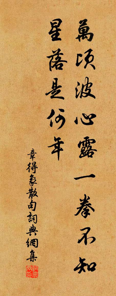 詩詞名句歷史字典書法欣賞書法字典國語詞典說文解字康熙字典古漢語字典標 題 作 者 詩 句 句作者:章得象 朝代:宋代句原文萬頃波心露一拳,不知星落是何年。詩詞問答問:句的作者是誰?答:章得象問:句寫於哪個朝代?答:宋代章得象句書法欣賞句書法作品詩詞推薦詠鶴五首張嵲〔宋代〕千年一度復來歸,城郭何人識令威。當日榮華竟誰是,只應皆作路塵飛。芭蕉朱少游〔宋代〕剪得西園一片青,故將來此惱詩情。怪來昨夜窗前雨,減卻瀟瀟數點聲。池口阻風雨孫應時〔宋代〕江頭三日擊扁膛,秋浦齊山欠一游。已自無人念羈客,更禁風雨作春愁。送客歸蘭溪許渾〔唐代〕花下送歸客,路長應過秋。暮隨江鳥宿,寒共嶺猿愁。眾水喧嚴瀨,群峰抱沉樓。因君幾南望,曾向此中游。水龍吟孔夷〔宋代〕歲窮風雪瓢零,望迷萬里雲垂凍。紅綃碎翦,凝酥繁綴,煙深霜重。疏影沈波,暗香和月,橫斜浮動。悵別來,欲途次近蜀驛蒙恩賜寶刀及飛龍廄馬…寄中書李鄭二公武元衡〔唐代〕草草事行役,遲遲違故關。碧幃遙隱霧,紅旆漸依山。感激酬恩淚,星霜去國顏。捧刀金錫字,歸馬玉連環。威鳳偈頌一百零二首釋紹曇〔宋代〕諸莊旱澇不為憂,只恐難調水牯牛。拽脫鼻繩憨睡穩,數聲羌笛野田秋。絕無形影,誰放誰收。通身白了通身黑,石鼓蘇軾〔宋代〕冬十二月歲辛丑,我初從政見魯叟。舊聞石鼓今見之,文字鬱律蛟蛇走。細觀初以指畫肚,欲讀嗟如箝在口。韓公句杜耒〔宋代〕釀雪不成微有雨,被風吹散卻為晴。義寧產蓴菜中秋大熟副以六絕送楊伯子曾豐〔宋代〕仙苗風味淡為宗,能誘長安客欲東。浪說棧羊余雋永,施於高士了無功。題南叔兄藏修閣息游觀魏了翁〔宋代〕中存外羽即藏修,夙寤晨興此息游。要把孟軻三勿看,更將夫子四於求。顏淵陋巷樂何事,曾皙風雩詠不休。此意和全母弟題暖重三丈居陽枋〔宋代〕眼前皆易未嘗東,祗恐援弓逐過鴻。認得義皇心上畫,簞瓢何必問顏空。常山贈劉鎡蘇軾〔宋代〕劉侯年少日,駿馬拊便面。援弓雁自落,不待白羽貫。和毛秀才江墅幽居好十首穆修〔宋代〕江墅幽居好,賓來定不愁。酒醲新出榨,魚活旋離鉤。移席追松影,調琴和澗流。陶然方外樂,名教縶何由。九月八日司空圖〔唐代〕已是人間寂寞花,解憐寂寞傍貧家。老來不得登高看,更甚殘春惜歲華。垂虹別意圖唐寅〔明代〕垂虹不是壩陵橋,送客能來路亦遙。西望太湖山閣月,東連淪海地通潮。酒波汨汨翻荷葉,別思茫茫在柳條。更欲髮長沙釋紹嵩〔宋代〕秋入長沙縣,無人畫得成。晚風輕浪疊,落日亂蛩鳴。一雨洗煩暑,千山指去程。回期誰可定,行樂且吾生。紹興甲子予待試廬陵辭曹廳是秋失解後六年乃周必大〔宋代〕五十餘春一遠莊,耕夫雖老未拋荒。審言堂上新司戶,子厚書中顧十郎。湘中紀行十首赤沙湖劉長卿〔唐代〕茫茫葭菼外,一望一沾衣。秋水連天闊,涔陽何處歸。沙鷗積暮雪,川日動寒暉。楚客來相問,孤舟泊釣磯。寓興十首張至龍〔宋代〕孤燈照長夜,膏盡燈影滅。劃見窗戶間,鮮鮮有明月。名句推薦寵柳嬌花寒食近,種種惱人天氣。李清照《念奴嬌·春情》 酒美梅酸,恰稱人懷抱。李清照《蝶戀花·上巳召親族》 白梅懶賦賦紅梅,逞艷先迎醉眼開。曹雪芹《詠紅梅花得“梅”字》 無言暗將紅淚彈。闌珊,香銷輕夢還。納蘭性德《河傳·春淺》 克城以武,戡亂以仁。張廷玉《明史·本紀·卷一》 逍遙以針勞,談笑以藥倦劉勰《文心雕龍·養氣》 一雙舞燕,萬點飛花,滿地斜陽。陳子龍《訴衷情·春遊》 置酒望白雲,商飆起寒梧。李白《登單父陶少府半月台》 待到山花爛漫時,她在叢中笑。 * 《卜運算元·詠梅》 最愛蘆花經雨後,一蓬煙火飯魚船。林逋《詠秋江》
