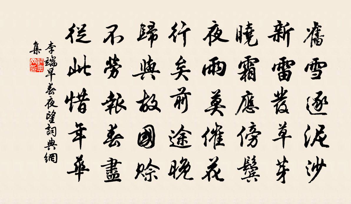 詩詞名句歷史字典書法欣賞書法字典國語詞典說文解字康熙字典古漢語字典標 題 作 者 詩 句 早春夜望作者:李端 朝代:唐代早春夜望原文舊雪逐泥沙,新雷發草芽。曉霜應傍鬢,夜雨莫催花。行矣前途晚,歸與故國賒。不勞報春盡,從此惜年華。詩詞問答問:早春夜望的作者是誰?答:李端問:早春夜望寫於哪個朝代?答:唐代問:早春夜望是什麼體裁?答:五律李端早春夜望書法欣賞早春夜望書法作品注釋全唐詩:卷285_136詩詞推薦蝶戀花王安中〔宋代〕飛雪映山茶。巧剪明霞成片片。欲笑還嚬,金蕊依稀見。拾翠人寒妝易淺。濃香別注唇膏點。竹雀喧喧煙岫遠。晚偈頌十二首釋如淨〔宋代〕夜半烏雞抱鵠卵,天明生出個老鸛。毛長觜短鷺鶿形,飛起一天星斗亂。一拳拳倒黃鶴樓,一踢踢翻鸚鵡洲。咄,羅解元母胡氏輓詩洪咨夔〔宋代〕三世不異爨,一門皆力書。此風今所少,他行特其餘。藻錡明疏牖,萱窩護碧除。春光元自在,遺夢杳安輿。游張公祠二首李曾伯〔宋代〕十年重過石橋行,松下清流載濯纓。洞隔煙霞知地遠,壇連仙佛信天成。人如雲意俱閒適,山帶霜容似瘦生。步出孫賓臾道人蘇轍〔宋代〕萬里飄然不繫舟,酒壚一笑便相投。千金不換金丹訣,何事惟須一布裘。臨秋三首宋庠〔宋代〕素潦沙成岸,蒼條柳映津。蟬休疑惜己,晴去似猜人。紺幕隨天遠,瓊鉤伴月新。清風時一至,吹盡故纓塵。一枝春周密〔宋代〕事以寄意,此少游“小樓連苑”之詞也。余遂戲用張氏故實次韻代答,亦東坡錦里先生之詩乎簾影移陰,杏香寒、雜曲歌辭。竹枝顧況〔唐代〕帝子蒼梧不復歸,洞庭葉下荊雲飛。巴人夜唱竹枝後,腸斷曉猿聲漸稀。和虞退夫韻魏了翁〔宋代〕醵酒成懽似旅酬,偶然解後得英游。卻因樂極生良感,今夜蟾光照幾州。句徐似道〔宋代〕天寒不知翠袖薄,日暖但覺玉煙生。守居園池雜題二樂榭文同〔宋代〕暖山孰雲靜,漢水亦非動。二見因妄生,仁智何常用。采荔二絕劉克莊〔宋代〕思蓴羹鼓辭京洛,為海棠花客劍川。帝憫後村翁老病,即家除拜荔枝仙。書直舍張耒〔宋代〕為官不治民,清坐晚秋晨。隨事文書了,偷閒筆硯親。吏歸雅集定,門鎖月華新。野鳥何勞問,窮通理有神。己卯十月一日至燕越五日罹狴犴有感而賦文天祥〔宋代〕聽著啼鵑淚滿襟,國亡家破見忠臣。關河歷落三生夢,風雪飄零萬死身。丞相豈能堪獄吏,故侯安得作園人。神農月出書館黃庚〔宋代〕出色青邊屋,幽深稱隱居。瓶梅香筆硯,窗雪冷琴書。壁有先賢像,門無俗客車。代耕惟舌在,何必耦長沮。寄饒州范待制梅堯臣〔宋代〕山水番君國,文章漢侍臣。古來中酒地,今來獨醒人。坐嘯安浮俗,談詩接上賓。何由趨盛府,待爾望清塵。水調歌頭佚名〔宋代〕不能煩惱得,掉臂便歸休。前度風檣,這回潦轍幾悠悠。幸得有雲一谷,更自有書萬卷,著甚麽來由。月采混魚目禪人並化主寫真求贊釋正覺〔宋代〕心心無住,了了有據。河漢橫秋,斗柄濡露。須菩提坐禪,憍屍迦雨華。蚌含明月兔懷胎,勘破少林傳底句。同莊秀才宿鎮星觀馬戴〔唐代〕的的星河落,沾苔復灑松。濕光微泛草,石翠澹搖峰。野觀雲和月,秋城漏間鍾。知君親此境,九陌少相逢。綠野亭鄭伯玉〔宋代〕吾愛高秋亭上望,水風涼澹愜幽情,山形左右互拱揖,海氣旦暮多險情。西疇農歌罷亞熟,北埭漁唱滄浪清。人生名句推薦粽包分兩髻,艾束著危冠。陸游《乙卯重五詩》 長太息以掩涕兮,哀民生之多艱。屈原《離騷》 鐵馬紅旗寒日暮,使君猶寄邊城。周紫芝《臨江仙·送光州曾使君》 風定落花深,簾外擁紅堆雪。李清照《好事近·風定落花深》 晴風初破凍,柳眼梅腮,已覺春心動。李清照《蝶戀花·暖雨晴風初破凍》 誠之者,擇善而固執之者也。子思《中庸·第二十章》 南浦春來綠一川,石橋朱塔兩依然。范成大《橫塘·南浦春來綠一川》 軍井成而後飲,軍食熟而後飯,軍壘成而後舍,勞佚必以身同之。尉繚《尉繚子·戰威》 漢甲連胡兵,沙塵暗雲海。李白《經亂離後天恩流夜郎憶舊遊書懷贈江夏韋太守良宰》 八年十二月,五日雪紛紛。白居易《村居苦寒》