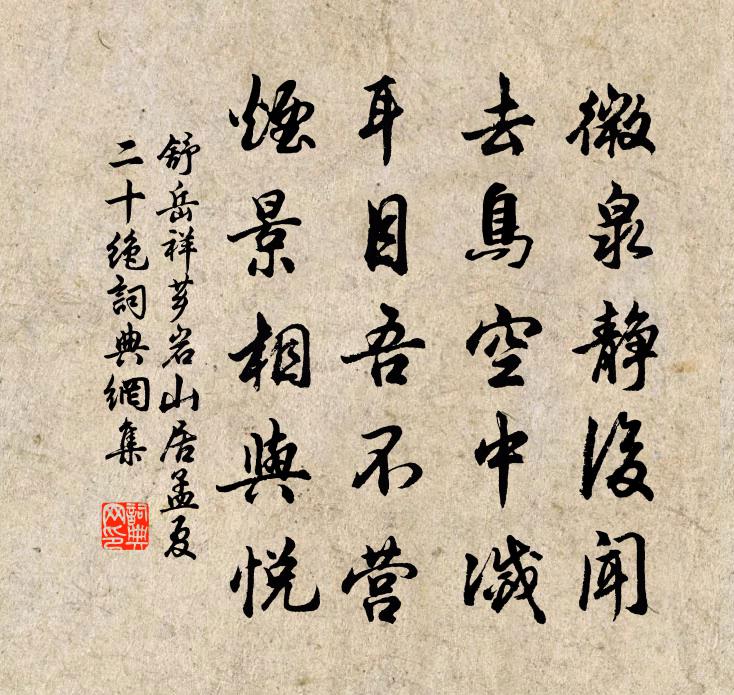 詩詞名句歷史字典書法欣賞書法字典國語詞典說文解字康熙字典古漢語字典標 題 作 者 詩 句 薌岩山居孟夏二十絕作者:舒岳祥 朝代:宋代薌岩山居孟夏二十絕原文微泉靜後聞,去鳥空中滅。耳目吾不營,煙景相與悅。詩詞問答問:薌岩山居孟夏二十絕的作者是誰?答:舒岳祥問:薌岩山居孟夏二十絕寫於哪個朝代?答:宋代舒岳祥薌岩山居孟夏二十絕書法欣賞薌岩山居孟夏二十絕書法作品詩詞推薦山間大風雨晝夜不止聞松聲撼床戲成拙語謾錄鄭清之〔宋代〕顛風橫雨窮山秋,樵青馳檐車停輈。松聲撼空吼萬牛,轟豗勢欲傾不周。晨雞扼吭喑且愁,百鳥何敢相喧啾。恍疑喜晴衛宗武〔宋代〕梅雨成霖味已甘,淋淳更久恐難堪。風雷幾晝起平陸,星斗一宵移下潭。萬畛針芒青曳曳,千山鱗羽綠毿毿。老夫句劉甲〔宋代〕山圍梓蜀千秋景,水接東吳萬昊天。浣溪沙·綠柳藏烏靜掩關晏幾道〔宋代〕綠柳藏烏靜掩關。鴨爐香細瑣窗閒。那回分袂月初殘。惜別漫成良夜醉,解愁時有翠箋還。欲尋雙葉寄情難。為溫樂堂五綠亭解嘲高斯得〔宋代〕園林非不佳,名字著難穩。稍與流俗異,譏呵來噂噂。我堂名溫樂,竊慕涑水翁。我亭名五綠,又希午橋公。客來劍客 / 述劍賈島〔唐代〕十年磨一劍,霜刃未曾試。今日把示君,誰有不平事。送準上人歸石經院熊孺登〔唐代〕旃檀刻像今猶少,白石鐫經古未曾。歸去更尋翻譯寺,前山應遇雁門僧。摸魚兒黃升〔宋代〕問山中、小桃開後,曾經多少晴雨。遙知載酒花邊去,唱我舊歌金縷。行樂處。正蝶繞蜂圍,錦繡迷無路。風光有殘月寇準〔宋代〕光隨春漏細,影共夕煙流,若近明河沒,還疑墜玉鉤。吾廬何涼窗〔宋代〕禹山山下是吾廬,坐處常安數卷書。族近弟兄相聚密,家貧朋友欲來疏。臨窗種竹堪延鶴,向水開門可釣魚。莫羨茅山劉先覺高士繪雲琴圖求詩次楊廷秀韻周必大〔宋代〕目送歸雲膝抱琴,山林猶恐不高深。應憐三十年前客,擾擾塵心損道心。任叟書授劉生佚名〔唐代〕承欲往梁宋,梁宋災方重,旦夕為人訟。承欲訪鄭生,鄭生將有厄。即為千里客,兼亦變衫色。九月二十九日邇英開講忝預末班講退小集玉堂崔敦禮〔宋代〕五雲扶輦下清廂,寶帙初開第一章。旋卷班聯回廣殿,稍留笑語萃公堂。紫霄近侍連鑣過,黃髮元臣照座光。顧我秋夜雨吳潛〔宋代〕腰棚傀儡曾懸索。粗瞞憑一層幕。施呈精妙處,解幻出、蛟龍頭角。誰知鮑老從旁笑,更郭郎、搖手消薄。歧路難香奩體五首葉茵〔宋代〕相思獨向小窗明,試翦春衣趁晚晴。還覺此情絲樣小,欲裁不斷奈何情。十月二十九日雪四首蘇轍〔宋代〕幽居漫爾存三徑,燕坐何妨應六窗。老憶舊書時展卷,病封藥酒旋開缸。小園搖落黃花盡,古檜飛鳴白鶴雙。珍重正初答鍾郎中見招徐鉉〔唐代〕高齋遲景雪初晴,風拂喬枝待早鶯。南省郎官名籍籍,東鄰妓女字英英。流年倏忽成陳事,春物依稀有舊情。新歲讀千岩續藁史彌寧〔宋代〕詩老毫端別有春,岩前草木也精神。錦囊留得靈犀在,辟盡人間俗子塵。白水詩先秦無名〔先秦〕浩浩白水。鯈鯈之魚。君來召我。我將安居。國家未立。從我焉如。奉酬致宏贈別張嵲〔宋代〕強顏從宦益堪悲,此日逢君異昔時。末路未忘交似漆,相看各已鬢垂絲。亂來世事渾難料,老去生涯詎可思。客里名句推薦應酬都不暇,一嶺是梅花。張道洽《嶺梅》 及時當勉勵,歲月不待人。陶淵明《雜詩·人生無根蒂》 楝花飄砌。蔌蔌清香細。謝逸《千秋歲·詠夏景》 器具質而潔,瓦缶勝金玉;飲食約而精,園蔬愈珍饈。朱柏廬《朱子家訓·全文》 昔我往矣,楊柳依依。佚名《採薇》 茅檐低小,溪上青青草。辛棄疾《清平樂·村居》 紅板橋空,濺裙人去,依舊曉風殘月。納蘭性德《淡黃柳·詠柳》 紅顏未老恩先斷,斜倚薰籠坐到明。白居易《後宮詞》 臨難不顧生,身死魂飛揚阮籍《詠懷其五十三》 秀樾橫塘十里香,水花晚色靜年芳。蔡松年《鷓鴣天·賞荷》