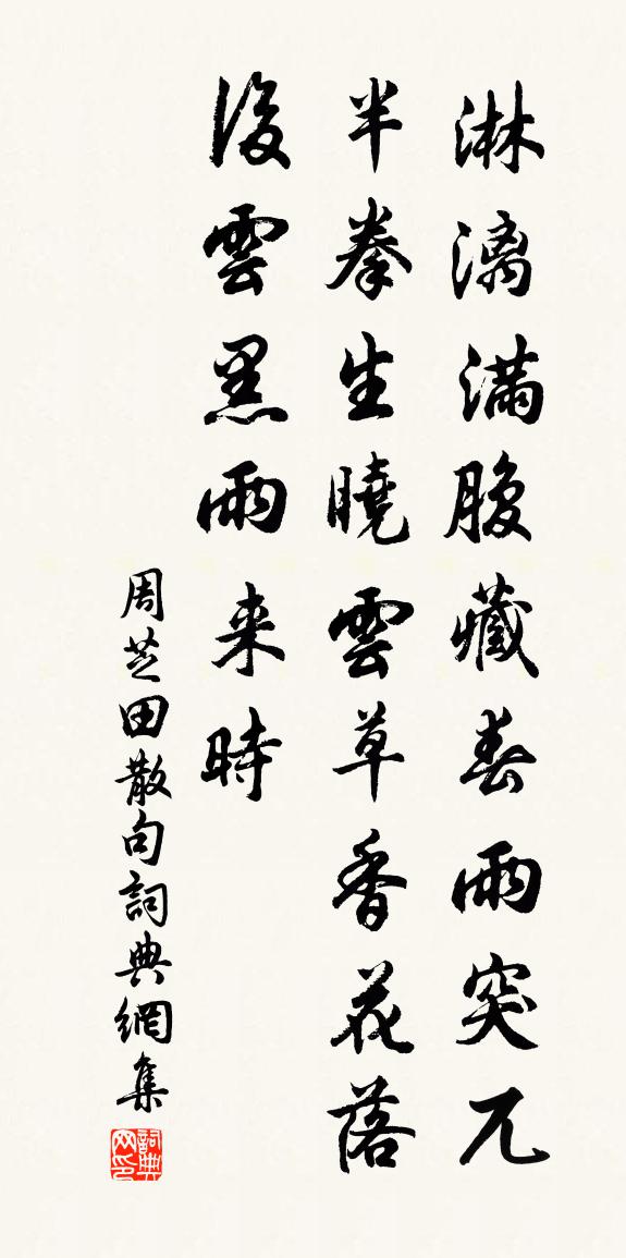 詩詞名句歷史字典書法欣賞書法字典國語詞典說文解字康熙字典古漢語字典標 題 作 者 詩 句 句作者:周芝田 朝代:宋代句原文淋漓滿腹藏春雨,突兀半拳生曉雲。草香花落後,雲黑雨來時。詩詞問答問:句的作者是誰?答:周芝田問:句寫於哪個朝代?答:宋代周芝田句書法欣賞句書法作品詩詞推薦□□□(聞鵑啼)王質〔宋代〕眼將穿,腸欲裂。聲聲似向春風說。春色飄零,自是人間客。不成淚,都成血。朝朝暮暮何曾歇。叫徹斜陽,又見次韻胡梅瀧許月卿六〔宋代〕夢渠處處曉星殘,秋水盈盈隔曉山。山外梅瀧應秋水,一泓秋月夜將闌。終南山王維〔唐代〕太乙近天都,連山接海隅。白雲回望合,青靄入看無。分野中峰變,陰晴眾壑殊。欲投人處宿,隔水問樵夫。寄宋明府黃滔〔唐代〕北闕秋期南國身,重關煙月五溪雲。風蟬已有數聲急,賴在陶家柳下聞。水調歌頭(和伯稱)李呂〔宋代〕山雨喜開霽,爽氣滌煩襟。晚秋丹葉飄墜,籬菊散黃金。徙倚關河凝望,回首光陰輕駛,倏忽二毛侵。須信人間世又登碧雲亭感懷三十首吳芾〔宋代〕晚上危亭憶令威,凌虛山上悟玄機。丹成不見升騰跡,徒想當年化鶴飛。二女第一百四十四文天祥〔宋代〕床前兩小女,各在天一涯。所愧為人父,風物長年悲。宜雪梅方蒙仲〔宋代〕長愁花易天,倏被風吹盡。因愛雪花飛,枝頭巧相映。和鄭閎中仙居十一首陳襄〔宋代〕我愛仙居好,園池日退居。馴禽來鶴鶴,野水進徐徐。草樹通樵採,桑麻有老鋤。猶言民未樂,更待寢刑書。夜起二絕文天祥〔宋代〕惆悵高歌入睡鄉,夢中魂魄尚飛揚。起來露立頻搔首,夜靜無風自在涼。送滕庶子致仕歸婺州白居易〔唐代〕春風秋月攜歌酒,八十年來玩物華。已見曾孫騎竹馬,猶聽侍女唱梅花。入鄉不杖歸時健,出郭乘軺到處夸。兒著艅艎齋張元乾〔宋代〕人間日日有風波,不系虛舟奈若何。袖取平生濟川手,行藏終與祖同科。青陽峽杜甫〔唐代〕塞外苦厭山,南行道彌惡。岡巒相經亘,雲水氣參錯。林迥硤角來,天窄壁面削。溪西五里石,奮怒向我落。仰看隱靜分題得靜字章甫〔宋代〕平生苦愛閒,多病復便靜。每為林下游,忽若醉而醒。茲山昔曾登,當暑毛骨冷。碧霄環佩聲,古木旌幢影。五峰題獨愛軒張元乾〔宋代〕此君風味極不淺,戶外俗人來未曾。老石寒藤同一笑,我知公是在家曾。贈蕭鍊師許渾〔唐代〕曾試昭陽曲,瑤齋帝自臨。紅珠絡繡帽,翠鈿束羅襟。雙闕胡塵起,千門宿 * 。出宮迷國步,回駕軫皇心。桂殿醉中作行草數紙陸游〔宋代〕還家痛飲洗塵土,醉帖淋漓寄豪舉;石池墨瀋如海寬,玄雲下垂黑蛟舞。太陰鬼神挾風雨,夜半馬陵飛萬弩。堂堂走筆送吳僧慶間游明越方回〔宋代〕挑包前日過垂虹,明旦剩潮向浙東。兩袖虎丘山上月,一竿漁浦渡頭風。乾坤佛法元來盛,湖海詩僧到處雄。而立浣溪沙晏幾道〔宋代〕團扇初隨碧簟收,畫檐歸燕尚遲留。靨朱眉翠喜清秋。風意未應迷狹路,燈痕猶自記高樓。露花菸葉與人愁。次韻李叔飛王洋〔宋代〕溪山春蘭林,桃李花槐市。戲友二三生,興來遠返趾。墨客冠再彈,蒼官仕三已。矜豪柳索強,引分梅知止。緣芳名句推薦聚散匆匆,雲邊孤雁,水上浮萍。劉過《柳梢青·送盧梅坡》 縱使文章驚海內,紙上蒼生而已。龔自珍《金縷曲·癸酉秋出都述懷有賦》 風含翠篠娟娟淨,雨裛紅蕖冉冉香。杜甫《狂夫》 心之憂危,若蹈虎尾,涉於春冰。佚名《尚書·周書·君牙》 長安白日照春空,綠楊結煙垂裊風。李白《陽春歌》 以五十步笑百步。孟子《孟子·梁惠王章句上·第三節》 滿目山河增感慨,一時風景寄遨遊。姜塘《摘星樓九日登臨》 聖賢之所美,莫美乎聰明;聰明之所貴,莫貴乎知人。劉劭《人物誌·序》 只言啼鳥堪求侶,無那春風欲送行。高適《夜別韋司士》 今古長如白練飛,一條界破青山色。徐凝《廬山瀑布》