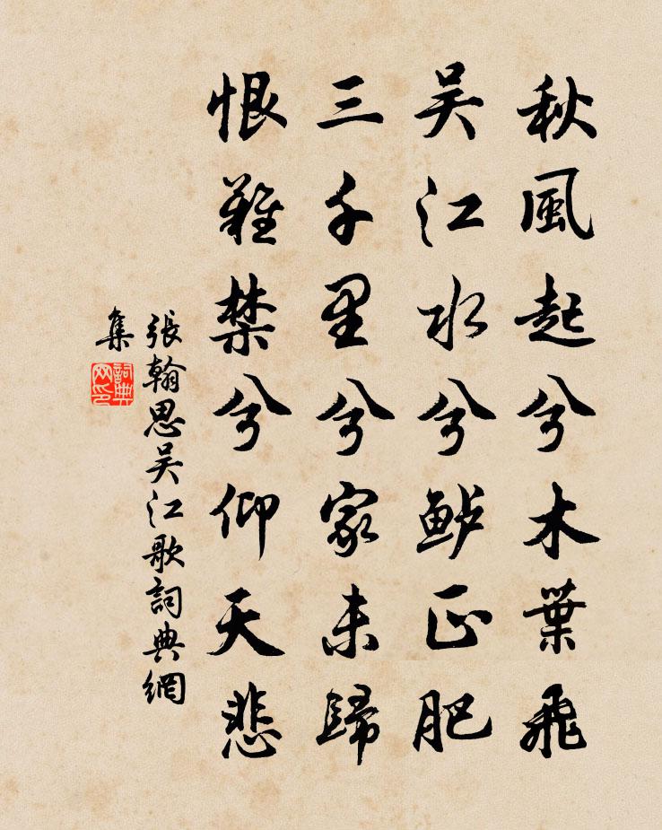 “秋風起兮木葉飛”,出句即見其思情的發動。悲涼的秋風最易觸動人們的節序之感和念遠之情。從時間上說,秋往往意味著歲暮的到來,使人覺著時光的流逝、流年的虛度。從空間看,秋高氣清,萬木蕭蕭,視野一下空闊起來,不自覺中自有人在何方、家在何方之嘆。《楚辭·湘夫人》有“裊裊兮秋風,洞庭波兮木葉下”的句子,自是此句之本;不過,作為張翰來說,也不一定是有意地仿效,實在是一種語言定勢、心理定勢。秋風一吹,使作者感到在洛陽羈留時間太久了;秋風一吹,又使作者想起往昔的鄉居生活、家鄉風物,第二句就自然接上了:“吳江水兮鱸正肥”。鱸魚,是作者家鄉的特產,味極鮮美,秋天又正是魚肥的季節。“鱸正肥”著一“正”字,便與“秋風起”連上了,同時還流露了一種“正”當其時、迫不及待的心情。下兩句就直抒其情了。“三千里兮家未歸,恨難禁兮仰天悲。”《晉書》本傳謂“數千里”,此言“三千里”,自是文句與詩句修辭的不同。“三”比“數”來得明確、爽口,同時它既可表確數,又可表虛數,而且往往指向多的方面,這“三千里”比“數千里”更能給人以距離遙遠之感。下句的“恨”是思歸不得之恨,這種恨想壓也壓不住,於是仰天悲嘆。這裡把他的思歸之情表現得異常強烈。