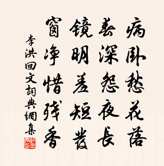 詩詞名句歷史字典書法欣賞書法字典國語詞典說文解字康熙字典古漢語字典標 題 作 者 詩 句 回文作者:李洪 朝代:宋代回文原文病臥愁花落,春深怨夜長。鏡明羞短髮,窗淨惜殘香。詩詞問答問:回文的作者是誰?答:李洪問:回文寫於哪個朝代?答:宋代李洪回文書法欣賞回文書法作品詩詞推薦讀謝靈運詩白居易〔唐代〕吾聞達士道,窮通順冥數。通乃朝廷來,窮即江湖去。謝公才廓落,與世不相遇。壯志郁不用,須有所泄處。泄為范百嘉百歲昆仲輓詞二首蘇轍〔宋代〕季子尤高爽,顏家早哭回。白頭生便爾,黃壤遽相催。舊草誰收拾,新松利插栽。悲傷有伯氏,諸子尚嬰孩。南至日太史登台書雲物於尹躬〔唐代〕至日行時令,登台約禮文。官稱伯趙氏,色辨五方雲。晝漏聽初發,陽光望漸分。司天為歲備,持簡出人群。惠愛畫堂春令/畫堂春王詵〔宋代〕畫堂霜重曉寒消,南枝紅雪妝成。捲簾疑是弄妝人。粉面帶春醒。最愛北江臨岸,含嬌淺淡精神。微風不動水紋平次金東園農家雜詠八首楊公遠〔宋代〕四郊{左禾右罷}稏高低熟,幾處連耞湃聲。婦餉區區無寸暇,績麻猶趁月華明。與妙庵主釋慧空〔宋代〕至道之宗,備在爾躬。求之則遠,守之不通。不求不守,奇載靈叟。極離極微,應心應手。觸目晴嵐,到處成庵。大滌洞王煓〔宋代〕軋軋籃輿松徑間,晚風吹雨逼人寒。斷崖蹲虎停雲濕,一水飛蛟醉眼看。空翠萬重藏絕景,夜光千丈浴神丹。青鞋李泌二首黎廷瑞〔宋代〕一副黃台話,離離詠種瓜。都來三十字,救得兩官家。西江月(再和)李曾伯〔宋代〕排遣新寒有酒,追尋舊隱無人。四山朔吹又冬鳴。吹送午鍾餘韻。過眼霜高木落,寄心月駛雲行。歸歟閉戶飽藜羹余秋村創書院黎廷瑞〔宋代〕五鳳樓修謾賦空,不堪四壁老秋風。黃金白璧相逢頃,文杏香茅一笑中。子美堂資須錄事,堯夫宅契出溫公。諸公舍人院竹王禹偁〔宋代〕封了詞頭遶砌行,些君相伴最多情。西垣不宿還堪恨,辜負夜窗風雨聲。紹興以後蜡祭四十二首佚名〔宋代〕除壇西郊,坎其聲鼓。百靈至止,結來作主。秬鬯湛淡,玉斝觩觖。是謂嘉德,神其安留。賦應門照綠苔李益〔唐代〕宮闕何年月,應門何歲苔。清光一以照,白露共裴回。 ——李益珠履久行絕,玉房重未開。妾心正如此,昭陽歌和李中丞與李給事山居雪夜同宿小酌白居易〔唐代〕憲府觸邪峨豸角,瑣闈駁正犯龍鱗。[二人當官盛事,為時所稱也。]那知近地齋居客,忽作深山同宿人。一盞寒蘇李泣別圖劉克莊〔宋代〕風雲慘恓,草樹枯死。笳鳴馬嘶,弦驚鶻起。熟看境色非人間,祁連山下想如此。手持尊酒別故人,此生再面真無瓦瓶李龍高〔宋代〕虛窗淨幾坐劬書,姑射仙人伴我癯。誰笑月明家四壁,案頭猶自有珊瑚。讀書所見(六首選二)趙翼〔清代〕其一後人觀古書,每隨己境地。譬如廣場中,環看高台戲。矮人在平地,舉頭仰而企。危樓有憑檻,劉楨方平視。悟南柯丘處機〔元代〕爛漫黃金蕊,輕盈白玉枝。重陽留得下元時。醮謝星官,特地獻真師。牒秦三天主,聲聞九地司。存亡福慶已潛資和曹殿丞寄荔支蔡襄〔宋代〕荔子凝丹摘曉鮮,江南來路與雲連。托根曾是三山下,結實應歸萬木先。鄉國遠攜甘旨重,宴堂分翫色香全。清才和雁湖先生病起自警八章程公許〔宋代〕觀空得舍筏喻,示病無散花天。從渠幻起幻滅,我自燕處超然。名句推薦遠書歸夢兩悠悠,只有空床敵素秋。李商隱《端居》 雁字無多,寫得相思幾許。周密《掃花游·九日懷歸》 只恐雙溪舴艋舟,載不動許多愁。李清照《武陵春·春晚》 知音少,弦斷有誰聽。岳飛《小重山·昨夜寒蛩不住鳴》 困倚危樓。過盡飛鴻字字愁。秦觀《減字木蘭花·天涯舊恨》 弱冠弄柔翰,卓犖觀群書。左思《詠史八首·其一》 無德不貴,無能不官,無功不賞,無罪不罰。荀子《荀子·王制》 伏波惟願裹屍還,定遠何鬚生入關。李益《塞下曲》 冰生於水而寒於水,比學生過於先生;青出於藍而勝於藍,謂弟子優於師傅。程登吉《幼學瓊林·卷二·師生》 荊州麥熟繭成蛾,繰絲憶君頭緒多。李白《荊州歌》