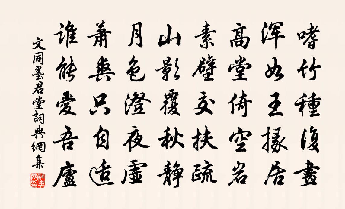 詩詞名句歷史字典書法欣賞書法字典國語詞典說文解字康熙字典古漢語字典標 題 作 者 詩 句 墨君堂作者:文同 朝代:宋代墨君堂原文嗜竹種復畫,渾如王掾居。高堂倚空岩,素壁交扶疏。山影覆秋靜,月色澄夜虛。蕭爽只自適,誰能愛吾廬。詩詞問答問:墨君堂的作者是誰?答:文同問:墨君堂寫於哪個朝代?答:宋代文同墨君堂書法欣賞墨君堂書法作品詩詞推薦頌古一百首釋智愚〔宋代〕收放隨時雖有淮,出門入戶恐難論。長安路子君須到,莫向深村草里蹲。已亥雜詩 93龔自珍〔清代〕金鑾並硯走龍蛇,無分同探閬苑花。十一年來春夢冷,南遊且吃玉川茶。殘句飲非其人茶有語蘇軾〔宋代〕飲非其人茶有語,閉門獨啜心有愧。賀吳樵登第黃誥〔宋代〕連雲山下鳳凰兒,何幸今朝見白眉。父子傳經無異說,弟兄題塔又同時。北堂偕老椿千歲,南國聯榮桂兩枝。青史木蘭花李涉〔唐代〕碧落真人著紫衣,始堪相併木蘭枝。今朝繞郭花看遍,儘是深村田舍兒。潘妃曲·悶酒將來剛剛咽商挺〔元代〕悶酒將來剛剛咽,欲飲先澆奠。頻祝願,普天下廝愛早團圓。謝神天,教俺也頻頻的勤相見。雲岩李復〔宋代〕徑轉隨高下,欹危亂石中。寒岩朝起霧。空谷夜生風。疏竹連殘屋,驚麏逐斷蓬。求棲問茅舍,非淺愛田翁。永遇樂·探梅次時齋韻吳文英〔宋代〕閣雪雲低,卷沙風急,驚雁失序。戶掩寒宵,屏閒冷夢,燈颭唇似語。堪憐窗景,都閒刺繡,但續舊愁一縷。鄰歌題君山 / 洞庭詩雍陶〔唐代〕煙波不動影沉沉,碧色全無翠色深。疑是水仙梳洗處,一螺青黛鏡中心。酬李當許渾〔唐代〕知有瑤華手自開,巴人虛唱懶封回。山陰一夜滿溪雪,借問扁舟來不來。次韻王俊甫山長九日登烏聊二首方回〔宋代〕山色初明小雨開,可容無地拓襟懷。荒寒試與登臨去,奇崛能隨感慨來。何限詩愁關世故,終憑爛醉了生涯。風流鶯鳴十章寄戚伯瑞彭龜年〔宋代〕有鳴其禽,其鳴維何。有懷其人,我心靡他。宿化斜橋,見雞冠花二首楊萬里〔宋代〕出牆那得又高雞,只露紅冠隔錦衣。卻是吳兒工料事,會嵇真箇不能啼。贈兗州孟都督韓翃〔唐代〕少年親事冠軍侯,中歲仍遷北兗州。露冕寧夸漢車服,下帷常討魯春秋。後齋草色連高閣,事簡人稀獨行樂。閒心怨曠思惟歌王嬙〔兩漢〕秋木萋萋,其葉萎黃。有鳥處山,集於苞桑。養育羽毛,形容生光。既得生雲,上游曲房。離宮絕曠,身體摧藏。奉和聖制送尚書燕國公赴朔方張九齡〔唐代〕宗臣事有徵,廟算在休兵。天與三台座,人當萬里城。朔南方偃革,河右暫揚旌。寵錫從仙禁,光華出漢京。山川菩薩蠻(梅)謝薖〔宋代〕相思一夜庭花發。窗前忽認生塵襪。曉起艷寒妝。雪肌生暗香。佳人縴手摘。手與花同色。插鬢有誰宜。惟應潘玉和虛齋勸農十詩鄭清之〔宋代〕曉夢吟成望帝歸,征鞍未許柳絲知。笑聽鄮嶺春禽哢,去博延英午漏遲。和楊使君游赤松山貫休〔唐代〕為郡三星無一事,龔黃意外扳喬松。日邊揚歷不爭路,雲外苔蘚須留蹤。溪月未落漏滴滴,隼旟已入山重重。捫蘿和顏長官百詠山居朱繼芳〔宋代〕矮窗欹枕看朝榮,老覺迎逢禮數生。來往頗知麋鹿性,寒暄不會俗人情。名句推薦不聞爺娘喚女聲,但聞黃河流水鳴濺濺。佚名《木蘭詩 / 木蘭辭》 下床著新衣,初學小姑拜。毛鉉《 * 詞·下床著新衣》 共看明月應垂淚,一夜鄉心五處同。白居易《望月有感》 今我來思,雨雪載途。佚名《出車》 重陽獨酌杯中酒,抱病起登江上台。杜甫《九日五首·其一》 地下千年骨,誰為輔佐臣。戎昱《詠史 / 和蕃》 春遊之盛,西湖未能過也。姜夔《琵琶仙·雙槳來時》 事雖小,勿擅為。苟擅為,子道虧。李毓秀《弟子規·入則孝》 地白風色寒,雪花大如手。李白《嘲王歷陽不肯飲酒》 一時勸人以口,百世勸人以書。袁黃《了凡四訓·積善之方》