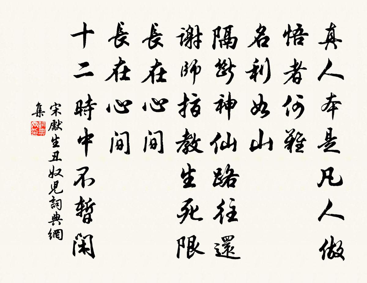 詩詞名句歷史字典書法欣賞書法字典國語詞典說文解字康熙字典古漢語字典標 題 作 者 詩 句 醜奴兒/採桑子作者:宋先生 朝代:宋代醜奴兒/採桑子原文真人本是凡人做,悟者何難。名利如山。隔斷神仙路往還。謝師指教生死限,長在心間。長在心間。十二時中不暫閒。詩詞問答問:醜奴兒/採桑子的作者是誰?答:宋先生問:醜奴兒/採桑子寫於哪個朝代?答:宋代問:醜奴兒/採桑子是什麼體裁?答:詞宋先生醜奴兒/採桑子書法欣賞醜奴兒/採桑子書法作品詩詞推薦宮詞三十三首曹勛〔宋代〕六宮上直試羅衣,未聽鞭聲等駕時。且趁曉閒臨御札,官家常是下朝遲。苦雨張耒〔宋代〕春淺天尚寒,雨多聲入夜。幽人不出門,坐惜梅花謝。庭竹未抽萌,酴醾將覆架。芳時喜病癒,淺酌供情話。趨世景靈宮聞子規楊萬里〔宋代〕今年未有子規聲,忽向宮中樹上鳴。告訴落花春不管,裴回曉月恨難平。斜風細雨又三月,柳絮浮雲空一生。豈不贈郭高叔三首陳造〔宋代〕翠扇紅牙淺黛愁,梁塵飛下晚雲留。貫珠未竟金杯側,卻欠周郎一轉頭。感春蘇泂〔宋代〕紛紛忙事幾曾閒,快上高樓得解顏。夜月一奩花似鏡,春風千疊柳如山。多情未放芳塵遠,漸老難追少日還。燕子鷓鴣天鄒應龍〔宋代〕壽母開年九十三。佳辰就養大江南。緹屏晃耀新寧國,繡斧斕斑老朴庵。傾玉斝,擘黃柑。兩孫垂綬碧於藍。便當某敬采民言成六韻為安撫閣老尚書壽伏幸過目張栻〔宋代〕前時勸君出東郊,父老歡呼望羽旄。甘雨便隨車馬到,眼看沾足遍蓬蒿。萬年春姬翼〔元代〕生滅無情,古今輪轉平如水。急須堤備。作個前程計。自有元初,一點何曾離。靈無比。煉成真體。壽量齊天地。寄題長溪楊恥齋梅樓樓乃其先世讀書之所陳鑒之〔宋代〕乃翁愛書書滿樓,萬軸插架堪汗牛。乃翁愛梅梅繞樓,千年老乾如蒼虬。梅護群書俗塵絕,書對梅梢滋味別。有時送僧入五泄貫休〔唐代〕五泄江山寺,禪林境最奇。九年吃菜粥,此事少人知。山響僧擔谷,林香豹乳兒。伊余頭已白,不去更何之。城南亭作張說〔唐代〕珂馬朝歸連萬石,稍門洞啟親迎客。北堂珍重琥珀酒,庭前列肆茱萸席。長袖遲回意緒多,清商緩轉目騰波。舊傳臨江仙(同前)晁補之〔宋代〕常記河陽花縣裡,恰如飯顆山逢。春城何處滿絲桐。綸巾並羽扇,君有古人風。重向梁王台畔見,黃花綠酒誰同。送廣東憲陳均二首李昴英〔宋代〕十五年間再繡衣,幡然一出浩然歸。囹空但欲全人命,綱打誰能避禍避。壬巧交攻邪害正,丁鐵奏免是成非。離亭秋晚獨步華岳〔宋代〕十分秋色著岩桂,幾陣晚涼催井桐。自恨異鄉知遇少,一樽相屬與誰同。茶山貢焙歌李郢〔唐代〕使君愛客情無已,客在金台價無比。春風三月貢茶時,盡逐紅旌到山裡。焙中清曉朱門開,筐箱漸見新芽來。陵煙急足集句王安石〔宋代〕年去年來來去忙,倚他門戶傍他牆。一封朝奏緣何事,斷盡蘇州刺史腸。秋晚雜書三十首方回〔宋代〕吾家一何奇,奇峰照南窗。是為紫陽山,萬木青樅樅。上有出岫雲,下有見底江。江清雲無心,伴此眉宇厖。詩思奉和聖制重陽日即事六韻權德輿〔唐代〕嘉節在陽數,至歡朝野同。恩隨千鍾洽,慶屬五稼豐。時菊洗露華,秋池涵霽空。金絲響仙樂,劍舄羅宗公。天道靈洲戴復古〔宋代〕一台中立郁蒼蒼,四面山光接水光。潮信往來知氣候,黿精出沒兆災祥。煙生茶灶僧留款,風展蒲帆客去忙。白髮烏李嶠〔唐代〕日路朝飛急,霜台夕影寒。聯翩依月樹,迢遞繞風竿。白首何年改,青琴此夜彈。靈台如可托,千里向長安。名句推薦平生不下淚,於此泣無窮。李白《江夏別宋之悌》 紛紛墜葉飄香砌。夜寂靜,寒聲碎。范仲淹《御街行·秋日懷舊》 關西老將不勝愁,駐馬聽之雙淚流。王維《隴頭吟》 娶妻無媒毋須恨,書中自有顏如玉。趙恆《勸學詩》 桑柘廢來猶納稅,田園荒後尚征苗。杜荀鶴《山中寡婦 / 時世行》 丹桂不知搖落恨,素娥應信別離愁。王琪《望江南·江南月》 已訴徵求貧到骨,正思戎馬淚盈巾。杜甫《又呈吳郎》 報導先生歸也,杏花春雨江南。虞集《風入松·寄柯敬仲》 望征路愁迷,離緒難整陸叡《瑞鶴仙梅》 大丈夫處世,當埽除天下范曄《後漢書·列傳·陳王列傳》