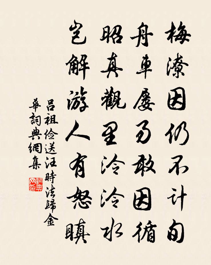 詩詞名句歷史字典書法欣賞書法字典國語詞典說文解字康熙字典古漢語字典標 題 作 者 詩 句 送汪時法歸金華作者:呂祖儉 朝代:宋代送汪時法歸金華原文梅潦因仍不計旬,舟車屢易敢因循。昭真觀里泠泠水,豈解遊人有怒瞋。詩詞問答問:送汪時法歸金華的作者是誰?答:呂祖儉問:送汪時法歸金華寫於哪個朝代?答:宋代呂祖儉送汪時法歸金華書法欣賞送汪時法歸金華書法作品詩詞推薦京口熊遹〔宋代〕古郡如河內,雲藏鐵瓮城,禹疏渠絕峴,秦鑒塹分京。舊井朱方塞,新橋淥水橫。秋日北固晚望二首高蟾〔唐代〕風含遠思翛翛晚,日照高情的的秋。何事滿江惆悵水,年年無語向東流。澤國路岐當面苦,江城砧杵入心寒。不知道無情尹志平〔元代〕不避春風迢遞。來往默通真意。那個是吾家。信天涯。本性玄通無托。到處一身安樂。了了沒西東。住雲峰。新晴曉步楊萬里〔宋代〕冬來暮暮雨絲絲,竹徑梅坡跡頓稀。作意新晴聊一出,行逢濕路卻成歸。郡齋臥疾贈晝上人於頔〔唐代〕夙陪翰墨徒,深論窮文格。麗則風騷後,公然我詞客。晚依方外友,極理探精賾。吻合南北宗,晝公我禪伯。尤明猛虎行劉宰〔宋代〕市有虎,毋妄言。當關虎士森戈鋋,市上一呼人駕肩。虎雖猛,那得前。市有虎,言非妄。君不見左馮諸邑天下壯宿清虛庵二首董嗣杲〔宋代〕來此看雲內欲仙,竹窗秋霧蓊爐煙。西風正滿溪頭樹,直送寒聲到枕前。次韻答孔武仲蘇轍〔宋代〕白髮青衫不記年,相逢一笑暫欣然。誦詩亹亹鋸木屑,展卷駸駸下水船。未肯尺尋分枉直,日知鑿枘有方圓。閒官贈張全義楊凝式〔唐代〕洛陽風景實堪哀,昔日曾為瓦子堆。不是我公重葺理,至今猶是一堆灰。鄭宗仁會宿山中林景熙〔宋代〕挑燈懷舊夢,移席近春泉。共話忽深夜,相看非少年。斗徒工末樹,粦出雨余田。亦有茅檐下,飯牛人未眠。自宣溪過早禾渡劉過〔宋代〕梅欲攙春菊送秋,早來渡口晚煙收。風從灘上催船過,滾起寒沙一併流。詠田家 / 傷田家聶夷中〔唐代〕二月賣新絲,五月糶新谷。醫得眼前瘡,剜卻心頭肉。我願君王心,化作光明燭。不照綺羅筵,只照逃亡屋。和答趙生師白見寄孫應時〔宋代〕田可躬耕溪可漁,此身屬我不關渠。養生誰學嵇中散,避謗吾非陸敬輿。風月滿懷高士傳,江山到眼故人書。相思湖上陸游〔宋代〕寒食初過穀雨前,輕衫短帽影翩翩。獨轅碾破新堤路,雙耜犁殘古廟壖。萬事不禁劉毅擲,諸人誰著祖生鞭?市壚凱歌十首呈賈樞使劉克莊〔宋代〕活俘萬戶虜無酋,拔寨宵奔黑祲收。不用偏師追出塞,殺胡林只在揚州。九日亦好園小集喻良能〔宋代〕疏雨蕭蕭岩桂香,西風驅冷作重陽。池塘秋草還爭綠,籬落寒花未肯黃。又是一年新度節,何妨九客共飛觴。園亭里社柴元彪〔宋代〕滌灶炮牲獻腯肥,一戶滴酹紙錢飛。提壺挈饁分餚酒,村北村南祭社歸。獲鹿再詠乾隆〔清代〕秋鹿合群正此時,乘閒偶爾試虞為。鐵丸穿過牝先倒,藥氣存傷牡逸弛。不謂目精尚猶故,分頒眾喜有如斯。苗凶暮春寄友劉黻〔宋代〕春歸無路尋,煙水一村深。中酒易成癖,惜花空用心。嫩芻青引犢,新樹綠藏禽。每念離鄉友,經年不寄吟。和恭聽曉籠中山鵲呂溫〔唐代〕掩抑中天意,悽愴觸籠音。驚曉一聞處,傷春千里心。名句推薦追亡事、今不見,但山川滿目淚沾衣辛棄疾《木蘭花慢·席上送張仲固帥興元》 權者,人莫離也。來俊臣《羅織經·控權卷第四》 揉藍衫子杏黃裙,獨倚玉闌無語點檀唇。秦觀《南歌子·香墨彎彎畫》 千形萬象竟還空,映水藏山片復重。來鵠《雲》 天涯海角悲涼地,記得當年全盛時。趙鼎《鷓鴣天·建康上元作》 步轉迴廊,半落梅花婉娩香。蘇軾《減字木蘭花·春月》 一點浩然氣,千里快哉風。蘇軾《水調歌頭·黃州快哉亭贈張偓佺》 雌雄空中鳴,聲盡呼不歸。白居易《燕詩示劉叟》 胭脂洗出秋階影,冰雪招來露砌魂。曹雪芹《薛寶釵詠白海棠》 辜負我,悔憐君,告天天不聞。牛嶠《更漏子·春夜闌》