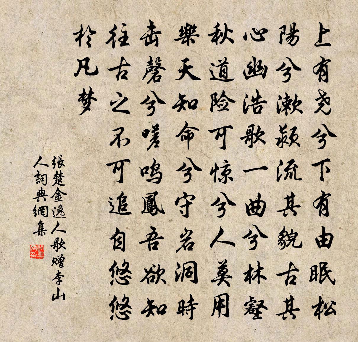 詩詞名句歷史字典書法欣賞書法字典國語詞典說文解字康熙字典古漢語字典標 題 作 者 詩 句 逸人歌贈李山人作者:張楚金 朝代:唐代逸人歌贈李山人原文上有堯兮下有由,眠松陽兮漱潁流。其貌古,其心幽,浩歌一曲兮林壑秋。道險可驚兮人莫用,樂天知命兮守岩洞。時擊磬兮嗟鳴鳳,吾欲知往古之不可追,自悠悠於凡夢。詩詞問答問:逸人歌贈李山人的作者是誰?答:張楚金問:逸人歌贈李山人寫於哪個朝代?答:唐代問:逸人歌贈李山人是什麼體裁?答:雜言張楚金逸人歌贈李山人書法欣賞逸人歌贈李山人書法作品注釋全唐詩:卷100_9詩詞推薦偈頌一百三十六首釋惟一〔宋代〕秋風捲地,秋水連天。千山影瘦,萬木蕭然。漁笛數聲江上月,樵歌一曲嶺頭煙。題興化高田院橋亭鄭良士〔唐代〕到此溪亭上,浮生始覺非。野僧還惜別,遊客亦忘歸。月滿千岩靜,風清一磬微。何時脫塵役,杖履願相依。許州題觀察判官廳薛能〔唐代〕三載從戎類系匏,重遊全許尚分茅。劉郎別後無遺履,丁令歸來有舊巢。冬暖井梧多未落,夜寒窗竹自相敲。纖腰賈客蘇拯〔唐代〕長帆掛短舟,所願疾如箭。得喪一驚飄,生死無良賤。不謂天不祐,自是人苟患。嘗言海利深,利深不如淺。松桂堂蘇泂〔宋代〕伯夷能使鄙夫寬,此老傳家不在官。魂夢猶能教兒息,九原風節更高寒。還家夜同趙端行分韻賦翁卷〔宋代〕莫怪每霜滿鬢侵,半年長路幾關心。還家點檢家中物,依舊清風在竹林。有感姚勉〔宋代〕范張心許友,余耳面為朋。世路巇於嶺,交情薄似冰。綈袍非舊戀,結綬況同登。亦莫他人責,先施恐未能。雜曲歌辭。離別難佚名〔唐代〕此別難重陳,花深復變人。來時梅覆雪,去日柳含春。物候催行客,歸途淑氣新。剡川今已遠,魂夢暗相親。野興陸游〔宋代〕紅飯青蔬美莫加,鄰翁能共一甌茶。舍西日緊花房斂,港北風生柳腳斜。筇杖不妨閒有伴,茆檐終勝老無家。自驚送劉公求還廬陵兼屬張元亨五首趙蕃〔宋代〕中壘西京儒士,魏唐變作文章。源委只今安在,蕭灘灘水深長。頌古四十八首釋慧開〔宋代〕天晴日頭出,雨下地上濕。盡情都說了,只恐信不及。幽尋朱繼芳〔宋代〕幽山尋不淺,歸路故遲遲。猿斷空山答,人行片月隨。題墨萱孫華孫〔元代〕慈親疇昔倚門時,曾記忘憂慰別離。孤子恨無懷橘日,十年腸斷樹萱詩。訓世孝弟詩十首邵雍〔宋代〕子孝親兮弟敬哥,光陰擲過疾如梭,庭闈樂處兒孫樂,兄弟和時妯娌和。孝弟傳家名不朽,金銀滿櫃富如何。要知秋夜陪張丞相趙侍御游灉湖二首尹懋〔唐代〕熊軾巴陵地,鷁舟湘水潯。江山與勢遠,泉石自幽深。杳靄入天壑,冥茫見道心。超然無俗事,清宴有空林。江上虞美人 謝張芳遠惠杏花邵亨貞〔元代〕閉門日日聽風雨。不道春如許。老來猶自愛看花。及至看花雙眼被愁遮。杏花不改胭脂面。愁里驚相見。花枝猶可次韻賁遠歸田四首李彌遜〔宋代〕歸去田園好,春隨人意和。竹根晴日臥,牛角晚風欹。漂梗空三逕,虛舟信一波。故人憐寂寞,千里問如何。代春日行鮑照〔南北朝〕獻歲發。吾將行。春山茂。春日明。園中鳥。多嘉聲。梅始發。桃始榮。泛舟艫。齊棹驚。奏采菱。歌鹿鳴。風微樂天寄洛下新詩,兼喜微之欲到,因以抒懷也劉禹錫〔唐代〕松間風未起,萬葉不自吟。池上月未來,清輝同夕陰。宮徵不獨運,塤篪自相尋。一從別樂天,詩思日已沉。吟君方量牧地次韻工曹王亞叟傅察〔宋代〕朝廷遮事備成康,郡邑承風底事忙。要使幅員無曠土,始知冀北有留良。疏狂似我徒勞耳,術業如君詎易量。奔走名句推薦莫嫌舉世無知己,未有庸人不忌才。查慎行《三閭祠》 三年不上門,當親也不親。吳承恩《西遊記·第四十回》 崑崙之高有積雪,蓬萊之遠常遺寒。王令《暑旱苦熱》 螢飛秋窗滿,月度霜閨遲。李白《塞下曲六首》 荷葉五寸荷花嬌,貼波不礙畫船搖;石濤《荷花》 人生貴得適意爾,何能羈宦數千里以要名爵!劉義慶《世說新語·識鑒》 平生多感激,忠義非外獎。李白《酬裴侍御對雨感時見贈》 雨中百草秋爛死,階下決明顏色鮮。杜甫《秋雨嘆三首》 紫艷半開籬菊靜,紅衣落盡渚蓮愁。趙嘏《長安晚秋 / 秋望 / 秋夕》 人生自古誰無死?留取丹心照汗青。文天祥《過零丁洋》