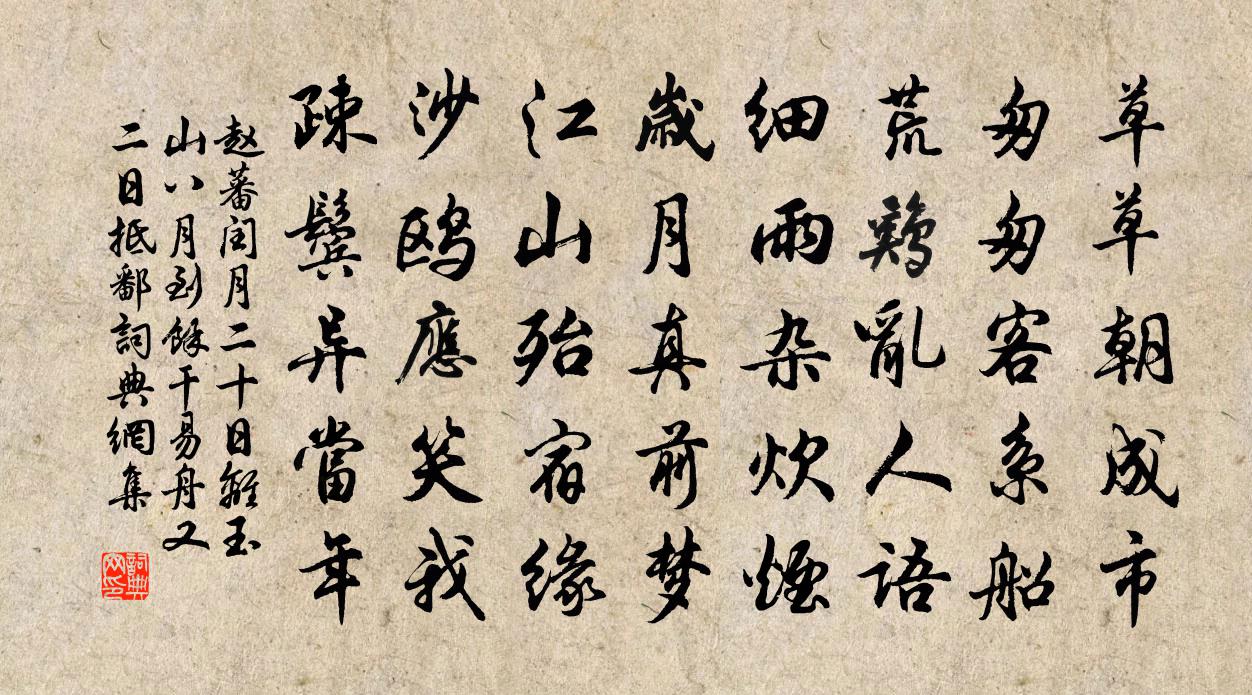 詩詞名句歷史字典書法欣賞書法字典國語詞典說文解字康熙字典古漢語字典標 題 作 者 詩 句 閏月二十日離玉山八月到餘干易舟又二日抵鄱作者:趙蕃 朝代:宋代原文草草朝成市,匆匆客繫船。荒雞亂人語,細雨雜炊煙。歲月真前夢,江山殆宿緣。沙鷗應笑我,疎鬢異當年。詩詞問答問:《閏月二十日離玉山八月到餘干易舟又二日抵鄱》的作者是誰?答:趙蕃問:該詩寫於哪個朝代?答:宋代書法欣賞閏月二十日離玉山八月到餘干易舟又二日抵鄱書法作品詩文賞析【原題】:閏月二十日離玉山八月到餘干易舟又二日抵鄱陽城追集途中所作得詩十有二首詩詞推薦滿江紅耿時舉〔宋代〕問月杯空,謫仙去、無人重舉。蘭台舊、扁舟乘興,處留奇語。洞府初疑仙骨瘦,樽前尚愛綸巾舞。信前身、太白偈頌二十九首釋雲〔宋代〕大盡三十日,小盡二十九。昨夜送窮年,今朝賀歲首。時節有變更,佛法無新舊。既是箇中人,不惜娘生口。坐對芙蓉潘牥〔宋代〕為惜艷陽妝,新枝不肯長。綠深秋後雨,紅坼夜來霜。偏間垂楊畔,多臨古岸傍。年年根蒂在,開謝未渠央。送延陵張宰陸龜蒙〔唐代〕春盡未離關,之官亦似閒。不嫌請薄俸,為喜帶名山。默禱三真後,高吟十字還。只應江上鳥,時下訟庭間。偈頌一百四十一首釋師範〔宋代〕八月十五,月圓當戶。夜半正明,天曉不露。取個眼兮耳必龔,舍個耳兮目必瞽。君不見老長沙弄爪牙,一踏踏倒梅張嵲〔宋代〕一枝寒艷映窗光,蘂氣侵衣斷客腸。漢上水邊千萬樹,春來何地著清香。田家屋上壺梅堯臣〔宋代〕修蔓屋頭綴,大壺檐外重。霜乾葉猶苦,風斷根未移。收掛煙突近,開充酒具遲。賤生無所用,會有千金時。日夕望江山贈魚司馬詩何遜〔南北朝〕湓城帶湓水。湓水縈如帶。日夕望高城。耿耿青雲外。城中多宴賞。絲竹常繁會。管聲已流悅。玄聲復淒切。歌黛禪人寫師真請贊釋慧遠〔宋代〕大地一渾身,虛空絕四鄰。不識柏樹子,喚作麻三斤。好時十分瀟灑,惡時一味藞苴。等閒牽犁上佛殿,乘興缽盂潁州府學釋奠先聖郡中童子亦來拜謁以詩勉之陳襄〔宋代〕藹藹青衿子,來修謁廟儀。憐他眉宇秀,中有起家兒。詠史下曹操七首陳普〔宋代〕遷都避宇豈男兒,子翼私行更可悲。四顧次且天獄裹,蚤如仲達鹵城時。嘗新茶曾鞏〔宋代〕麥粒收來品絕倫,葵花制出樣爭新。一杯永日醒雙眼,草木英華信有神。次韻子瞻與安節夜坐三首蘇轍〔宋代〕少年高論苦崢嶸,老孚寒蟬不復聲。目斷家山空記路,手披禪冊漸忘情。功名久已知前錯,婚嫁猶須畢此生。家世得道陽王哲〔元代〕九月蒼天爽氣高。重樓復降雨瀟瀟。攪海赤龍真自在,迎風木馬肯無寥。每向*中作系腰。六銖衣掛勝紅綃。醉後題趙大年小影趙孟堅〔宋代〕霜輕榆柳未全黃,兩岸菰蒲洲渚長。鷗鳥背人飛撲漉,西風嘗是入斜陽。花影謝枋得〔宋代〕重重疊疊上瑤台,幾度呼童掃不開。剛被太陽收拾去,又教明月送將來。答子蒙元稹〔唐代〕報盧君,門外雪紛紛。紛紛門外雪,城中鼓聲絕。強梁御史人覷步,安得夜開沽酒戶。偈頌一百六十首釋宗杲〔宋代〕拆去東籬,補起西壁。徑山門下,人無準的。有準的,誰委悉。僧堂覷破香積廚,鴟吻咬殺佛殿脊。浣溪沙晏幾道〔宋代〕唱得紅梅字字香。柳枝桃葉盡深藏。遏雲聲里送雕觴。才聽便拼衣袖濕,欲歌先倚黛眉長。曲終敲損燕釵梁。念奴嬌佚名〔宋代〕先秋四日,正祥開弧矢,生申佳節。天上彩麟曾入夢,鍾作人間英傑。襲慶盤坡,流芳星渚,家世綿簪紱。昨宵凝名句推薦照花前後鏡,花面交相映。溫庭筠《菩薩蠻·小山重疊金明滅》 聲華實寡,危國亡土。佚名《黃帝四經·經法·亡論》 把吳鉤看了,欄桿拍遍,無人會,登臨意。辛棄疾《水龍吟·登建康賞心亭》 日落君山雲氣,春到沅湘草木,遠思渺難收。張孝祥《水調歌頭·過岳陽樓作》 委肉當餓虎之蹊,禍必不振矣!劉向《戰國策·燕三·燕太子丹質於秦亡歸》 四牡何時入,吾君憶履聲。張九齡《奉和聖制送尚書燕國公赴朔方》 行舟逗遠樹,度鳥息危檣。陰鏗《渡青草湖》 但使龍城飛將在,不教胡馬度陰山。王昌齡《出塞二首》 南風吹其心,搖搖為誰吐?王冕《墨萱圖·其一》 有善始者實繁,能克終者蓋寡吳兢《貞觀政要·卷一·論君道》