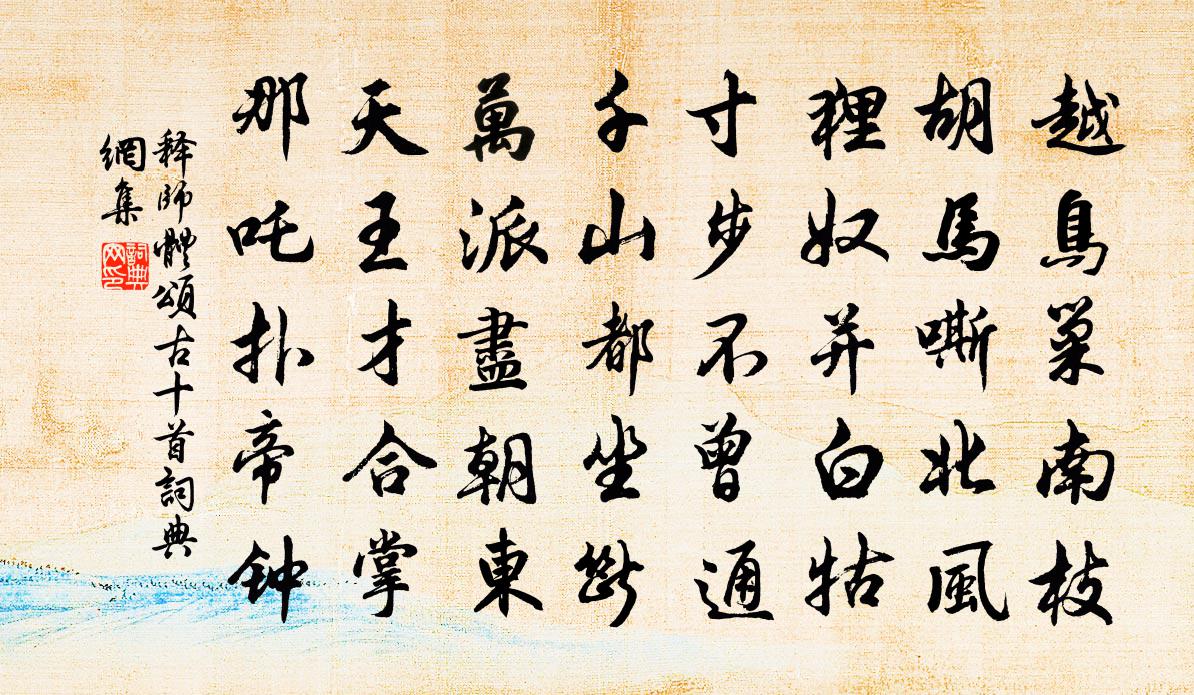 詩詞名句歷史字典書法欣賞書法字典國語詞典說文解字康熙字典古漢語字典標 題 作 者 詩 句 頌古十首作者:釋師體 朝代:宋代頌古十首原文越鳥巢南枝,胡馬嘶北風。狸奴並白牯,寸步不曾通。千山都坐斷,萬派盡朝東。天王才合掌,那吒撲帝鍾。詩詞問答問:頌古十首的作者是誰?答:釋師體問:頌古十首寫於哪個朝代?答:宋代釋師體頌古十首書法欣賞頌古十首書法作品詩詞推薦春日陪顏使君真卿、皇甫曾西亭重會《韻海》諸生皎然〔唐代〕為重南台客,朝朝會魯儒。暄風眾木變,清景片雲無。峰翠飄檐下,溪光照座隅。不將簪艾隔,知與道情俱。感舊四首末章蓋思有以自廣陸游〔宋代〕庚寅歲入巴東硤,臥聽清猿月下聲。二十九年窮未死,卻思當日似前生。正月十八日晴霽登柯眺望二首張耒〔宋代〕柯山通細履,幽步近青紅。送目無窮浪,吹花盡日風。餘生付沮溺,高論看夔龍。陳許春多雪,吾行亦欲東。探梅李洪〔宋代〕甌粵千山外,清愁只個般。澹煙增態度,飛霰斗高寒。鄭圃乘風馭,孤山傍水看。少陵詩興動,題品信知難。蓮花源魯宗道〔宋代〕花開十丈照峰頭,露褪紅衣爛不收。太乙真人多逸興,穩眠一葉泛中流。志學陸游〔宋代〕聖門志學豈容差,山立方當斥百家。早忝授經聞博約,晚羞同俗陷浮華。風剺槁面寒無褐,雷轉飢腸飯有沙。漫道宿城外張氏莊早起入三首楊萬里〔宋代〕眠雲跂石十餘年,回首拋官一瞬間。送舊迎新也辛苦,一番辛苦兩年閒。送游吏部赴召魏了翁〔宋代〕天馬周流不停策,青龍掛空山無色。區中物物見根柢,歲年滔滔逐流水。籲於求歸歸未獲,客里隨人送行客。鏦金東偏小室去日最遠每逃暑之地戲作五字陸游〔宋代〕肅肅檐陰轉,泠泠筧水鳴。高墉日氣遠,方簟午風清。渴愛餐漿美,慵便葛屨輕。新秋忽在眼,結束問山程。送從進長老歸天台錢惟濟〔宋代〕樞府多年識相毫,又飛鈽錫出神臯。霞標起處瞻鴛剎,風信平時過鷺濤。月露空濛迷檜楫,天香芬郁濕蘭袍。道猷寄顧子敦曾鞏〔宋代〕清曠亭邊雁欲回,南湖分浪入城來。空山過臘猶藏雪,野岸先春已放梅。三徑未歸聊自適,一尊尋勝每同開。如今柳梢青·與龜翁登研意觀雪懷癸卯歲臘朝斷橋並馬之游吳文英〔宋代〕斷夢遊輪。孤山路杳,越樹陰新。流水凝酥,征衫沾淚,都是離痕。玉屏風冷愁人。醉爛漫、梅花翠雲。傍夜船回題鄭侍郎岩隱(一作隱岩)十韻許棠〔唐代〕朝退常歸隱,真修大隱情。園林應得趣,岩谷自為名。野步難尋寺,閒吟少在城。樹藏幽洞黑,花照遠村明。海石偈三十五首釋祖珍〔宋代〕物物到心上,全心物自閒。古今城郭里,得者住如山。東郊陳耆卿〔宋代〕要拓郊原眼,短筇扶我東。秧寒針怯水,麥熟浪酣風。古寺荒煙外,孤禽落照中。得醪嫌獨醉,猶及灌園翁。句釋惠崇〔宋代〕河來天上闊,雲度月邊輕。雀劉克莊〔宋代〕恰見趨燕市,俄聞集兔園。雕籠馴養者,誰到翟公門。好事近管鑒〔宋代〕楚觀落成初,還是詔書催發。卻似愛山堂上,拜新除時節。要知君自棟樑材,開藩暫南越。早建明堂一柱,去扶持戲筆釋紹嵩〔宋代〕地僻人稀到,東郊自養蒙。山遙天接樹,夜靜竹藏風。岸柳含煙翠,江鬆脫晚紅。詩應是遊戲,吟嘯不須工。臨江仙(詠熟水)易少夫人〔宋代〕何處甘泉來席上,嫩黃初湯銀瓶。月團嘗罷有餘清。惠山名品在,歌舞暫留停。欲賞壑源新氣味,不應兼進豨苓。名句推薦空門寂寞汝思家,禮別雲房下九華。金地藏《送童子下山》 春色惱人眠不得,月移花影上欄乾。王安石《春夜》 唯有門前鏡湖水,春風不改舊時波。賀知章《回鄉偶書二首》 平岡細草鳴黃犢,斜日寒林點暮鴉。辛棄疾《鷓鴣天·陌上柔桑破嫩芽》 是數人之齒,而以為富。墨子《墨子·48章 公孟》 何處飛來林間鵲,蹙踏松梢微雪。辛棄疾《賀新郎·把酒長亭說》 晚鴉飛去,一枝花影送黃昏夏完淳《婆羅門引·春盡夜》 君臣無禮,而上下無別。劉向《戰國策·齊六·貂勃常惡田單》 桃花嫣然出籬笑,似開未開最有情。汪藻《春日·一春略無十日晴》 一朝哭都市,淚盡歸田畝。元結《農臣怨》