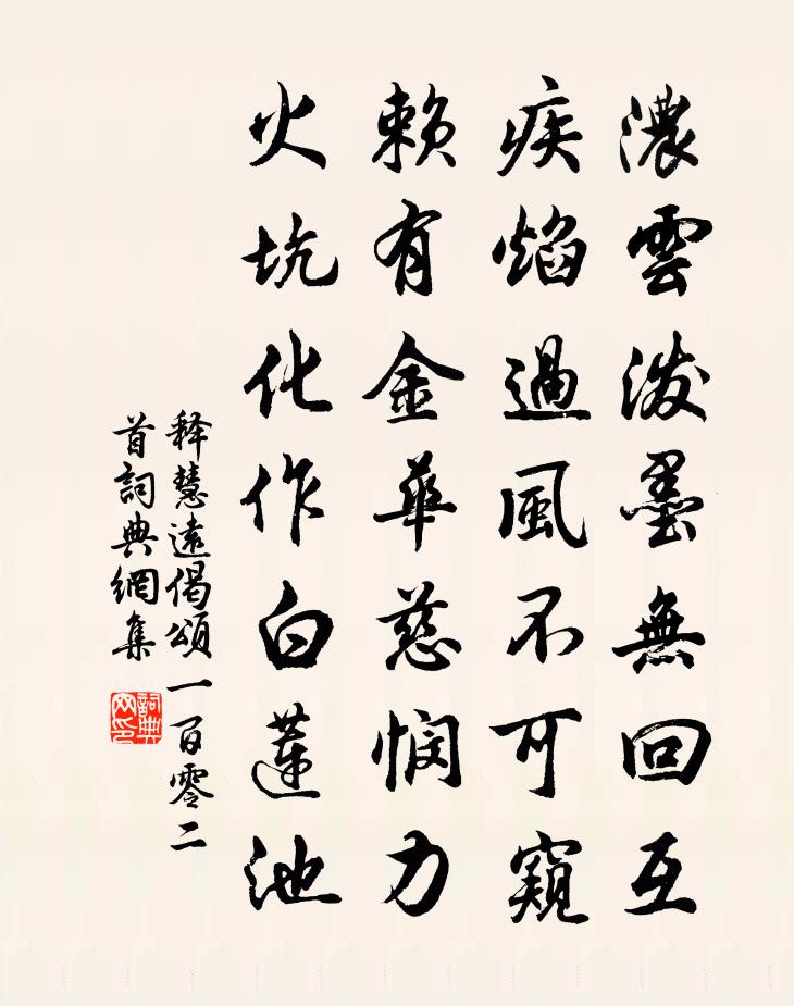 詩詞名句歷史字典書法欣賞書法字典國語詞典說文解字康熙字典古漢語字典標 題 作 者 詩 句 偈頌一百零二首作者:釋慧遠 朝代:宋代偈頌一百零二首原文濃雲潑墨無回互,疾焰過風不可窺。賴有金華慈憫力,火坑化作白蓮池。詩詞問答問:偈頌一百零二首的作者是誰?答:釋慧遠問:偈頌一百零二首寫於哪個朝代?答:宋代釋慧遠偈頌一百零二首書法欣賞偈頌一百零二首書法作品詩詞推薦題義上人清虛閣黃庚〔宋代〕偶來成一宿,便覺與禪通。看塔月影盡,捲簾秋色空。因知釋氏學,亦有晉人風。吟到忘言處,悠然此意同。紅槿花戎昱〔唐代〕花是深紅葉麴塵,不將桃李共爭春。今日驚秋自憐客,折來持贈少年人。滿庭芳(伯父仲球生日)王之道〔宋代〕紫角初繁,青裳正好,充閭清露飄香。懸弧何早,烏轡上扶桑。試問椿齡幾許,逾萬計、才滿三章。佳辰樂,林塘登初陽樓寄懷北平郎中皮日休〔唐代〕危樓新制號初陽, * 青葌射沼光。避酒幾浮輕舴艋,下棋曾覺睡鴛鴦。投鉤列坐圍華燭,格簺分朋占靚妝。莫怪偶題晁說之〔宋代〕一室蕭然懶傍書,角巾孤嘯問何如。夕陽能使山遠近,秋色巧隨人慘舒。苔漬碧花行不到,香殘篆字睡應余。自憐月夕崔道融〔唐代〕月上隨人意,人閒月更清。朱樓高百尺,不見到天明。欽州守歲張說〔唐代〕故歲今宵盡,新年明旦來。愁心隨斗柄,東北望春回。畫松景雲〔唐代〕畫松一似真松樹,且待尋思記得無。曾在天台山上見,石橋南畔第三株。寄題崔校書郊舍黃滔〔唐代〕一片寒塘水,尋常立鷺鷥。主人貧愛客,沽酒往吟詩。李文授和所贈老融詩複次韻為謝樓鑰〔宋代〕鄴侯插架書最多,筆力雄奇天所命。萬人海中深閉門,理窟搜尋到幽夐。我詩無律如山謳,形穢豈堪珠玉映。時時松下茅屋圖方回〔宋代〕一株松下一茅屋,何處山中此景無。煨芋老翁常閉戶,世人從此畫成圖。眼兒媚·楊柳絲絲弄輕柔王雱〔宋代〕楊柳絲絲弄輕柔。煙縷織成愁。海棠未雨,梨花先雪,一半春休。 而今往事難重省,歸夢繞秦樓。相思只在,丁別游定夫楊時〔宋代〕黽勉吾將仕,謀身力已分。漆雕慚未信,子夏又離群。慘澹交情重,間關道路勤。至言宜遠寄,孤陋願頻聞。送彬座主赴龍安請講齊己〔唐代〕兩論久研精,龍安受請行。春城雨雪霽,古寺殿堂明。白髮老僧聽,金毛師子聲。同流有誰共,別著國風清。夜過鑑湖用前韻書所見釋寶曇〔宋代〕湖光晚作鏡樣平,寂無人聲唯櫓聲。群峰倒影不可辨,新月半鉤如許情。斷蓬散作鳧雁過,漁火靜入江天明。移舟和平甫舟中望九華山二首王安石〔宋代〕楚越千萬山,雄奇此山兼。盤根雖巨壯,其末乃修纖。去縣尚百里,側身勇前瞻。蕭條煙嵐上,縹緲浮青尖。徐行謝達善見惠碧桃古體舒岳祥〔宋代〕碧桃有佳實,方春開白花。花悅悅花者,實惠能詩家。詠花不詠實,未解寫嘆嗟。水蒼充朝佩,天碧瀉露華。空青寄劉浩然華岳〔宋代〕樽酒檠窗鬢髮新,別來驚見雪霜侵。幾行淚滴風前燭,一片心敲月下砧。好德未聞如好色,知人安得似知音。一書戒香院俞汝尚〔宋代〕崎嶇窮谷翠屏圍,卻訝遊人到此稀。修竹帶雲當戶聳,暗泉鳴玉繞亭飛。春風欲老茶含旆,暑雨初收水帶磯。擾擾閒十詠仇遠〔宋代〕茶甌沙帽慣迎賓,不是詩人即道人。細雨斜風君莫出,綠 * 外有紅塵。名句推薦黃師塔前江水東,春光懶困倚微風。杜甫《江畔獨步尋花·其五》 三人行,必有我師焉。擇其善者而從之,其不善者而改之。孔子弟子《論語·述而篇》 君知妾有夫,贈妾雙明珠。張籍《節婦吟·寄東平李司空師道》 一半黃梅雜雨晴,虛嵐浮翠帶湖明,閒雲高鳥共身輕。鄭文焯《浣溪沙·從石樓石壁往來鄧尉山中》 湖上春來似畫圖,亂峰圍繞水平鋪。白居易《春題湖上》 既生瑜,何生亮!羅貫中《三國演義·第五十七回》 中山孺子倚新妝,鄭女燕姬獨擅場。李夢陽《汴京元夕》 門有車馬客,駕言發故鄉。陸機《門有車馬客行》 會稽愚婦輕買臣,余亦辭家西入秦。李白《南陵別兒童入京》 欲速則不達。孔子弟子《論語·子路篇》