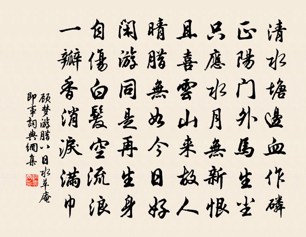詩詞名句歷史字典書法欣賞書法字典國語詞典說文解字康熙字典古漢語字典標 題 作 者 詩 句 臘八日水草庵即事作者:顧夢遊 朝代:清代臘八日水草庵即事原文清水塘邊血作磷,正陽門外馬生塵。只應水月無新恨,且喜雲山來故人。晴臘無如今日好,閒遊同是再生身。自傷白髮空流浪,一瓣香消淚滿巾。詩詞問答問:臘八日水草庵即事的作者是誰?答:顧夢遊問:臘八日水草庵即事寫於哪個朝代?答:清代問:臘八日水草庵即事是什麼體裁?答:七律顧夢遊臘八日水草庵即事書法欣賞臘八日水草庵即事書法作品詩詞推薦陳丞相誕日李洪〔宋代〕鳳紀千齡遇聖君,扶持宗社不無人。欣聞東魯真儒相,本是中興舊學臣。玉燕投懷文冠世,天麟呈瑞壽嘉辰。中書偈傾一百三十三首釋法薰〔宋代〕眼似流星,機如掣電。過得南山門,未見南山面。天氣稍熱。別時相見。萬年歡(瑞慶節)郭應祥〔宋代〕佳氣蔥蔥,望長安日下,鸞鶴翔舞。天佑皇家,當年挺生真主。令節標名瑞慶,曾未數、電樞虹渚。人都道,福若淳佑壬子王正人謁仙薦薌有感而題趙善浥〔宋代〕企仰仙岩歲已深,此行一見即知音。水簾不捲非朝夕,芝石長生到古□。孤鶴來迎疑識面,片雲飛去出無□。相逢麗正殿賜宴同勒天前煙年四韻應制王灣〔唐代〕金殿忝陪賢,瓊羞忽降天。鼎羅仙掖里,觴拜瑣闈前。院逼青霄路,廚和紫禁菸。酒酣空忭舞,何以答昌年。馬橋秋月徐似道〔宋代〕石樑橫臥清溪曲,波光上下風吹綠。海東推上月輪來,鱗龍閃閃浮寒玉。昔人呼為飲馬泉,至今飲者誰投錢。吟余和趙成子提乾喜雨韻袁說友〔宋代〕十年三已冒為州,每每於民有旱憂。午聽雷聲鳴屋角,晚驚雨腳壓雲頭。及時三日為霖好,為汝千箱樂歲求。欲辦宿祖印寺一首王阮〔宋代〕下馬杉松石徑幽,暗泉一帶抱山流。長廊隱隱丹青古,香霧蒙蒙日夜浮。缺月有情還委照,覊人無語獨登樓。急呼余謫居齊安寓郡東佛舍而制不得逾歲今冬遂移張耒〔宋代〕孟冬寒氣至,北風群木衰。微霖墮檐瓦,老客臥先知。二年蕭寺客,巾履忽復移。誰令簡書畏,易此鷦鷯枝。冥冥阮郎歸(詠春)趙長卿〔宋代〕和風暖日小層樓。人閒春事幽。杏花深處一聲鳩。花飛水自流。尋舊夢,續揚州。眉山相對愁。憶曾和淚送行舟。題峰頂寺李白〔唐代〕夜宿峰頂寺。舉手捫星辰。不敢高聲語。恐驚天上人。句晏殊〔宋代〕不聞幽豓接江蘺。秦城二絕李石〔宋代〕塹成雉堞繞蠶叢,漢棧分明蜀徼通。只說金牛能誑客,已輸巴粟到關中。生日病中方回〔宋代〕偶復逢生旦,何知迫死期。老真難嚲病,貧實怕迎醫。自擬修埋志,誰猶□壽詩。不應六旬叟,未減一分痴。和王朝議韻吳芾〔宋代〕晚日蓋轉雲頭,蓋長空收雨蓋腳。稍覺暑氣清,獨坐傾桑落。興來或醉吟,接?還倒著。胸中了無憂,事事俱脫略松桂堂蘇泂〔宋代〕伯夷能使鄙夫寬,此老傳家不在官。魂夢猶能教兒息,九原風節更高寒。經故丁補闕郊居許渾〔唐代〕死酬知己道終全,波暖孤冰且自堅。鵩上承塵才一日,鶴歸華表已千年。風吹藥蔓迷樵徑,雨暗蘆花失釣船。四尺幕官相約觀芳草於法曹之亭黃宰病不至以詩來洪咨夔〔宋代〕似無細雨還應有,欲落余花更復留。草際水邊青未了,可禁杯酒為扶頭。夜雨吳錫疇〔宋代〕漠漠春陰未肯晴,空階滴點到平明。應知不入笙歌耳,來作愁人枕畔聲。次黃山中山居韻二首楊公遠〔宋代〕山居無一事,所得趣何深。閱世秋聲賦,存心夜氣箴。步徐攜葛杖,興逸鼓嵇琴。最喜疎籬下,悠然見翠岑。名句推薦驚起卻回頭,有恨無人省。蘇軾《卜運算元·黃州定慧院寓居作》 子用私道者家必亂,臣用私義者國必危。劉向《戰國策·趙二·趙燕後胡服》 釣罷歸來不繫船,江村月落正堪眠。司空曙《江村即事》 掛席幾千里,名山都未逢。孟浩然《晚泊潯陽望廬山》 昨夜雨疏風驟,濃睡不消殘酒。李清照《如夢令·昨夜雨疏風驟》 寂寞離亭掩,江山此夜寒。王勃《江亭夜月送別二首》 士無事而食,不可也。孟子《孟子·滕文公章句下·第四節》 故鄉今夜思千里,霜鬢明朝又一年。高適《除夜作》 漢甲連胡兵,沙塵暗雲海。李白《經亂離後天恩流夜郎憶舊遊書懷贈江夏韋太守良宰》 政之於民,過急則 刻薄,傷緩則弛慢。令狐德棻《周書·列傳·卷四十五》