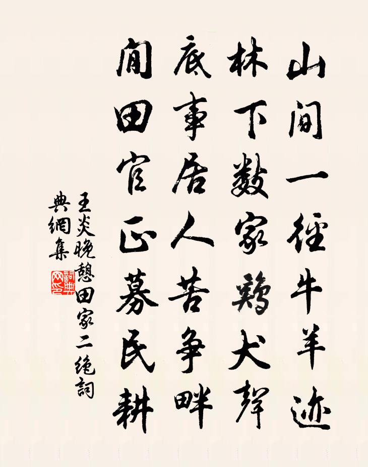 詩詞名句歷史字典書法欣賞書法字典國語詞典說文解字康熙字典古漢語字典標 題 作 者 詩 句 晚憩田家二絕作者:王炎 朝代:宋代晚憩田家二絕原文山間一徑牛羊跡,林下數家雞犬聲。底事居人苦爭畔,閒田官正募民耕。詩詞問答問:晚憩田家二絕的作者是誰?答:王炎問:晚憩田家二絕寫於哪個朝代?答:宋代王炎晚憩田家二絕書法欣賞晚憩田家二絕書法作品詩詞推薦清平樂·風鬟雨鬢納蘭性德〔清代〕風鬟雨鬢,偏是來無準。倦倚玉闌看月暈,容易語低香近。軟風吹遍窗紗,心期便隔天涯。從此傷春傷別,黃昏只滿江紅(春晚)佚名〔宋代〕著意留春,留不住、春歸難戀。最苦是、梅天煙雨,麥秋庭院。嫩竹陰濃鶯出谷,柔桑采盡蠶成繭。奈沉腰、寬盡和吳子美香林湯韻王之道〔宋代〕泉沸雞籠山下林,潯陽曾記尺余深。濯鮮瀹卵非予事,清暑攘寒蓋我心。物態漫勞私曖曖,靈源當信匪今今。簿書送崔琦赴宣州幕盧綸〔唐代〕五馬臨流待幕賓,羨君談笑出風塵。身閒就養寧辭遠,世難移家莫厭貧。天際曉山三峽路,津頭臘市九江人。何處黃鶴洞中仙 繼重陽韻馬鈺〔元代〕知味又聞香,因得非凡遇。更說祖師兩個來,教我修行賦。一志訪秦川,鄉井寧回覷。火滅煙消心死灰,名掛神仙寄傳法二大卿並簡譯席諸大士夏竦〔宋代〕潤色金文數十函,清涼甘露洗塵凡,修行不作伊蘭計,只願三千盡寶嚴。正仲思歸作篆畦今夜月十詩非篆畦月乃雁蒼月舒岳祥〔宋代〕篆畦今夜月,初出五更頭。清旭輝相映,餘光淡未收。煙消江樹出,霞弄市嵐浮。憶昔趨丹陸,雞人唱曉籌。陪尚書游中財夜大風雨尚書及任卿史石泉皆耆程公許〔宋代〕中在台殿倚竛竮,憶昨深登六歲零。霧鎖岩扉須玉鑰,雲扶革履上青冥。三峰靜對龐眉秀,雙璧驚回醉眼醒。風雨雜詠一百首高力士劉克莊〔宋代〕五十年間事,渾如曉夢餘。三郎南內里,何況老家奴。滿江紅姚燧〔元代〕裊裊東風,碧湘左畔群山囿。海棠無語不成蹊,桃李羞牛後。生臉朱唇暈酒。問坡仙、肝腸錦繡。未容花睡,銀燭用元韻答李郎中王炎〔宋代〕冰玉談清洗老懷,興濃亦覆手中杯。平生蠟屐登山慣,豈必因花特地來。臨江仙(中秋和沈文伯)蔡伸〔宋代〕記得南樓三五夜,曾聽鳳管昭華。曾前此際重興嗟。素娥端有恨,煙靄等閒遮。珍重主人留客意,厭厭緩引流霞。偈頌二十五首釋如淨〔宋代〕八月十八錢塘潮,浙翁聲價潑天高。盡教四海弄潮手,徹底窮淵輥一遭。重揀擇,不辭勞,要透龍門繼鳳毛。忽然偈頌一百三十六首釋惟一〔宋代〕鼓報四更,地搖六震。火焰為三世諸佛說法,三世諸佛立地聽。虛空有盡,大道無窮。窮則變,變則通。信手拈將早起二首張耒〔宋代〕風鳴槁葉未辭枝,雨濕疏梅欲弄姿。地下一陽應蹀躞,世間渾未有人知。與士繇游金山翌日分袂二絕陳東〔宋代〕京口瓜洲一水間,秋風重約到金山。江山自為離人好,不為離人數往還。念奴嬌(九日作)姚述堯〔宋代〕山城秋好,正西風淅淅,登高時候。杖倚徘徊凝望處,翠疊萬山如繡。雲繞禾場,熢沈戎馬,田野歡聲湊。琴堂無皇帝閣立春帖子王曾〔宋代〕北陸凝陰盡,千門淑氣新。年年金殿里,實字貼宜春。清明日侍親輿游海雲寺四首程公許〔宋代〕琴鶴清風久寂寥,谷居忠憤絢銀鉤。龕中片石費錐鑒,還為兩翁須點頭。送果州邵公濟分韻得其字朱翌〔宋代〕蓬萊清暑按行歸,卻向西南萬里馳。郡繼尊君家有法,學傳乃祖世無師。曹劉牆短自今日,班馬香濃如昔時。青士名句推薦不畏浮雲遮望眼,只緣身在最高層王安石《登飛來峰》 多謝梅花,伴我微吟。韓疁《高陽台·除夜》 盛年不重來,一日難再晨。陶淵明《雜詩·人生無根蒂》 父兄有善行,子弟學之或不肖王永彬《圍爐夜話·第三三則》 爭名者於朝,爭利者於市。劉向《戰國策·秦一·司馬錯與張儀爭論於秦惠王前》 雲母屏風燭影深,長河漸落曉星沉。李商隱《嫦娥》 舉頭望明月,低頭思故鄉。李白《靜夜思》 斜陽獨倚西樓。遙山恰對簾鉤。晏殊《清平樂·紅箋小字》 朝雲亂人目,帝女湘川宿。吳均《登二妃廟》 江亭暇日堪高會,醉諷離騷不解愁邊貢《午日觀競渡》